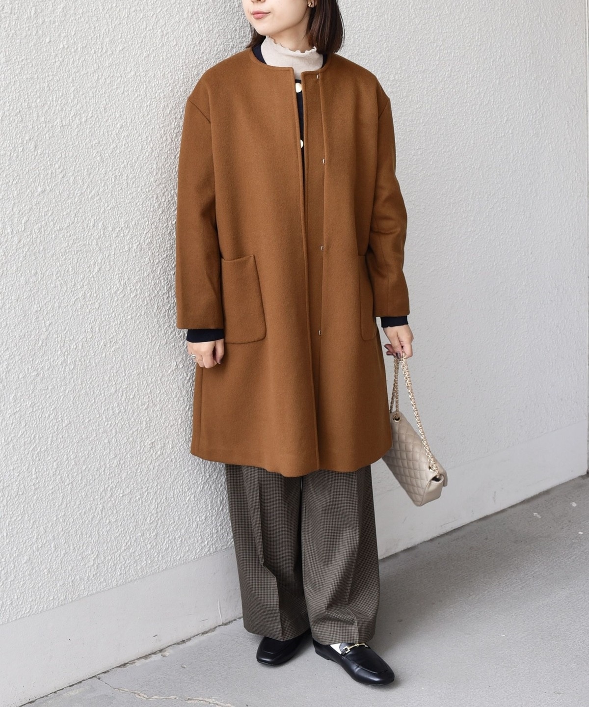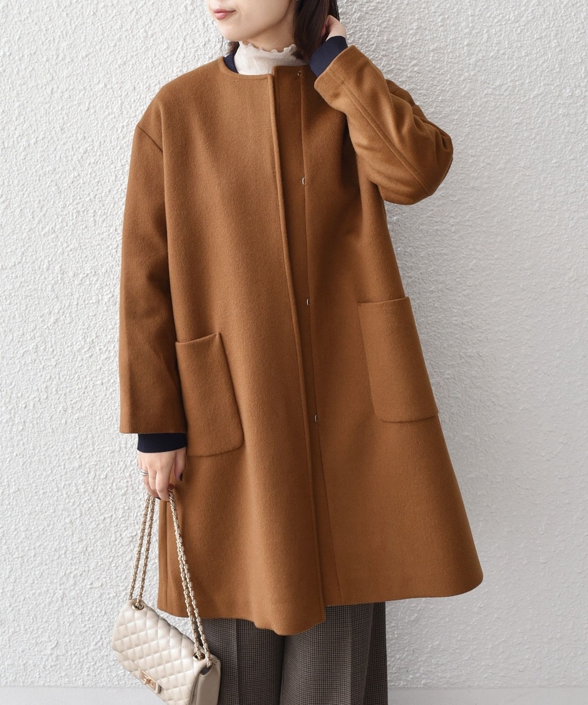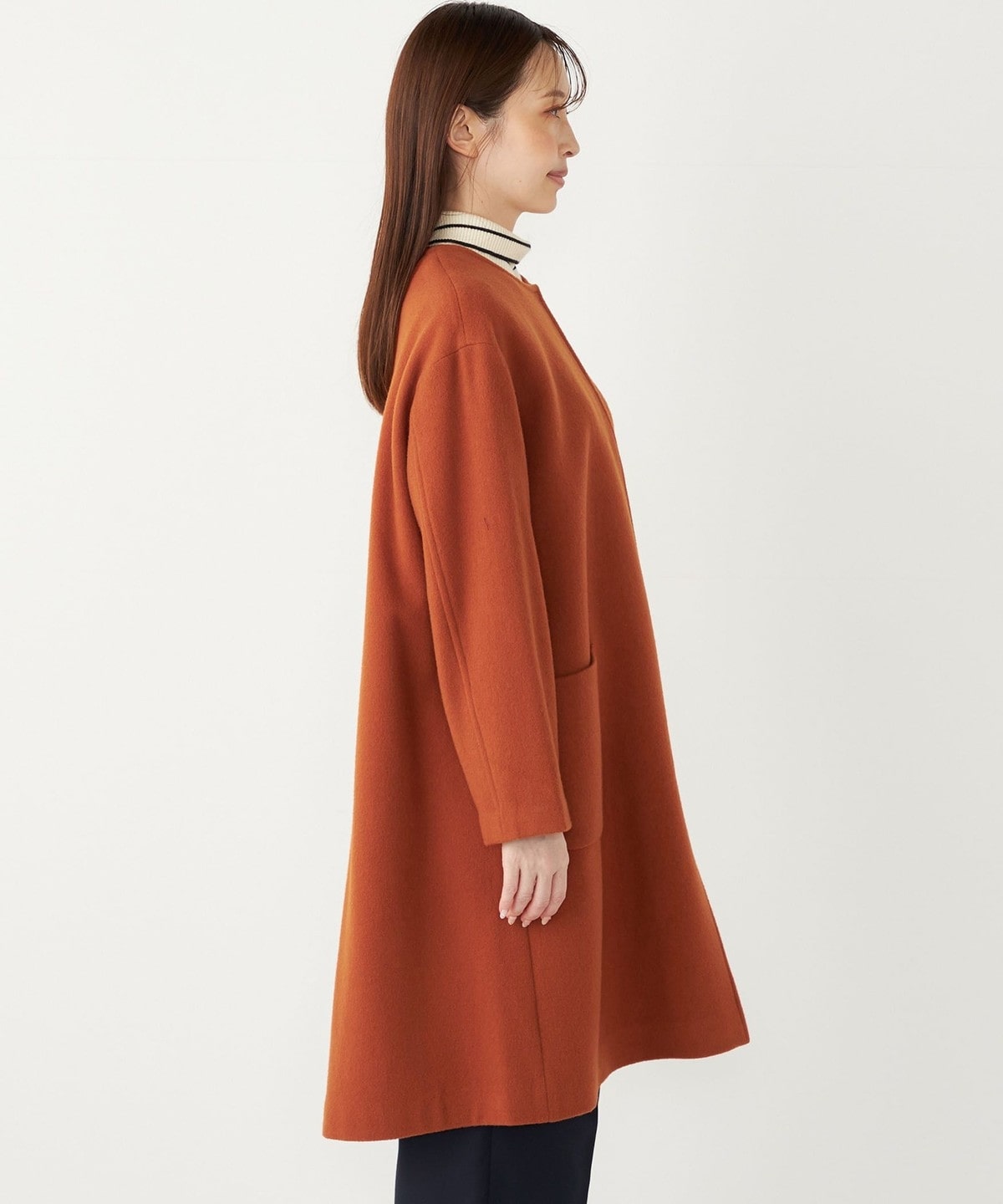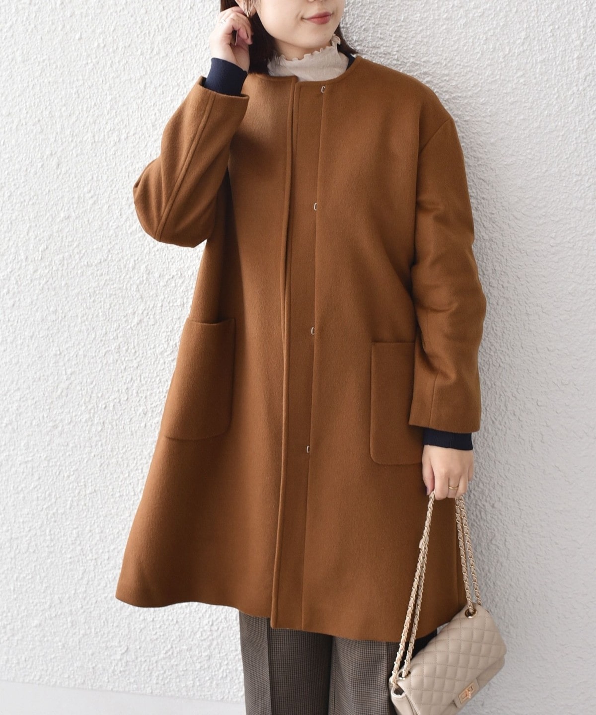 女性らしい上品さと、幅広いシーンで活躍してくれる汎用性の高さが魅力のノーカラーコート。