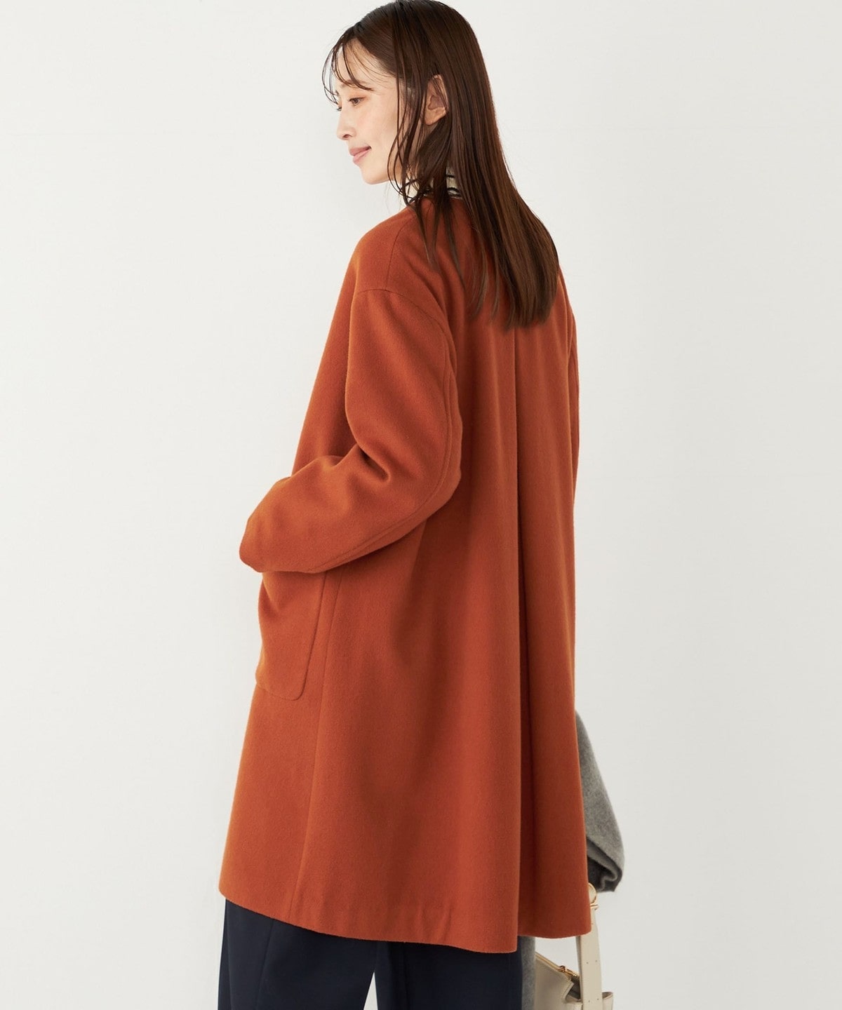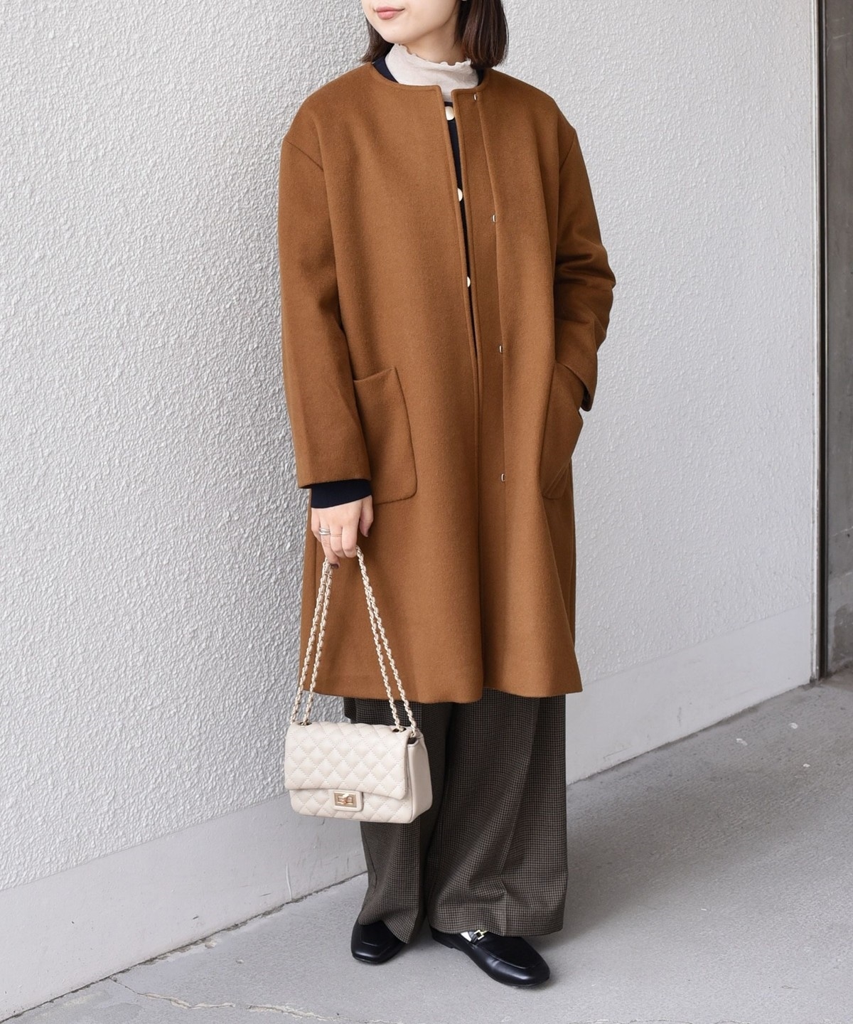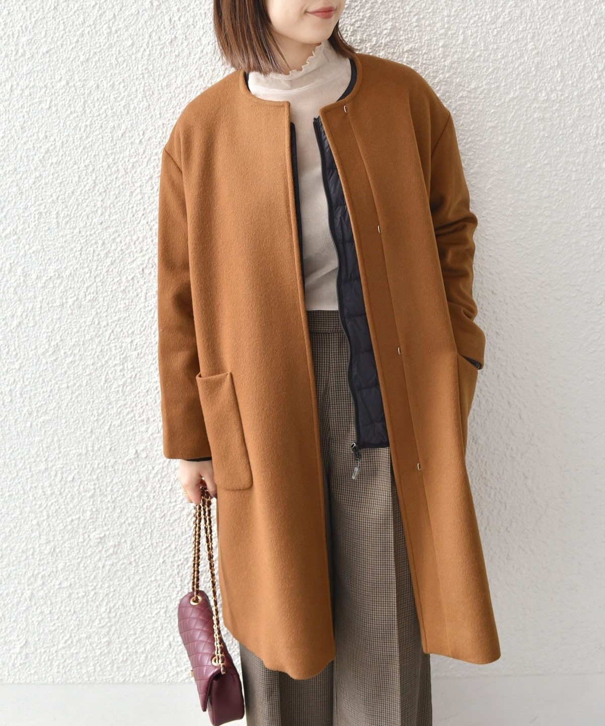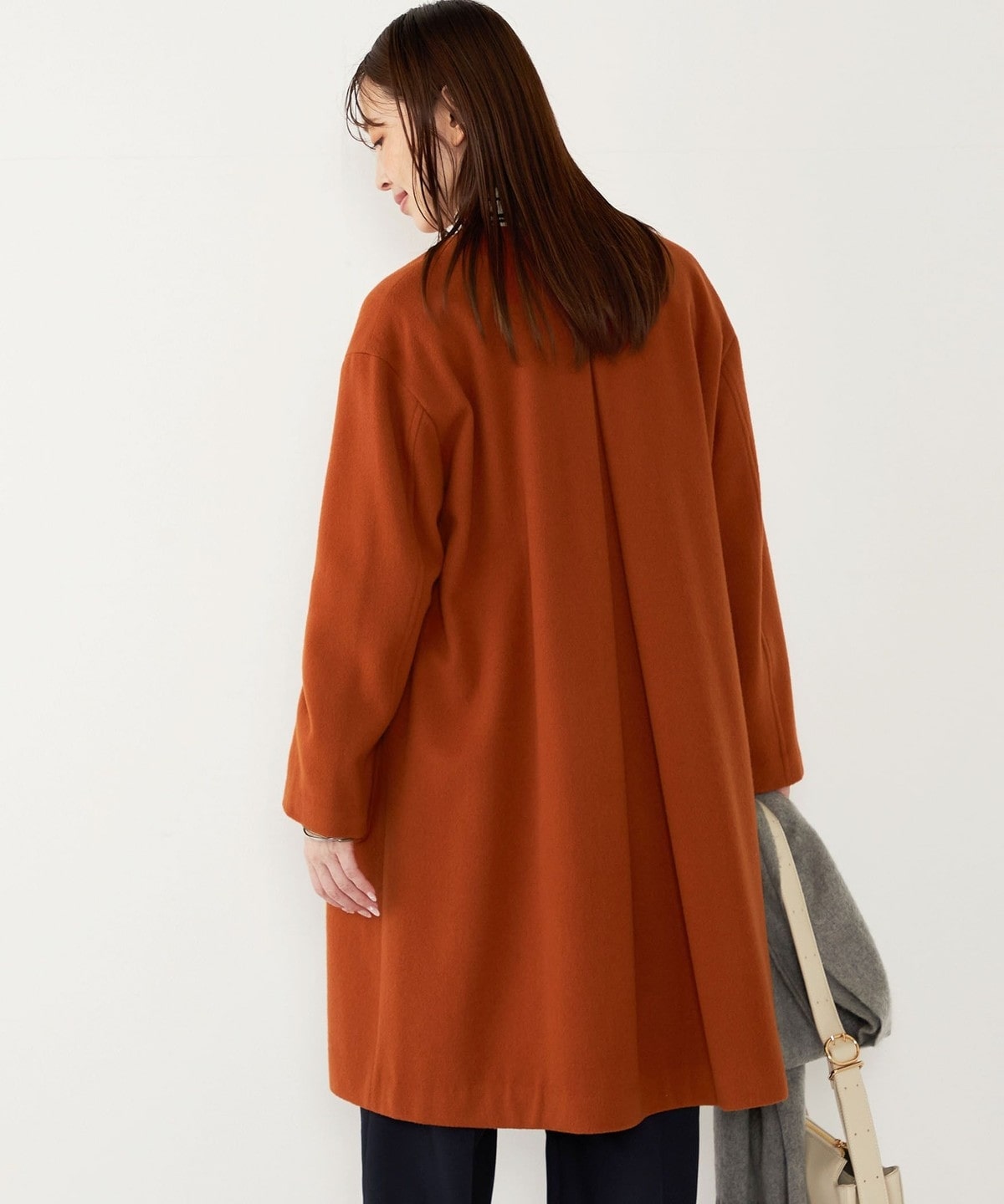 女性らしい上品さと、幅広いシーンで活躍してくれる汎用性の高さが魅力のノーカラーコート。