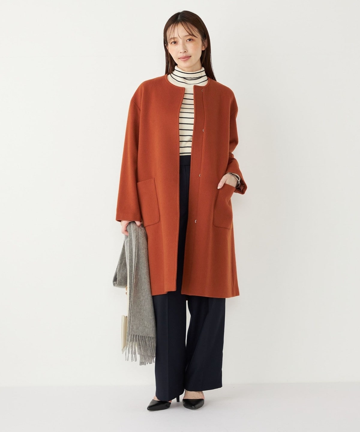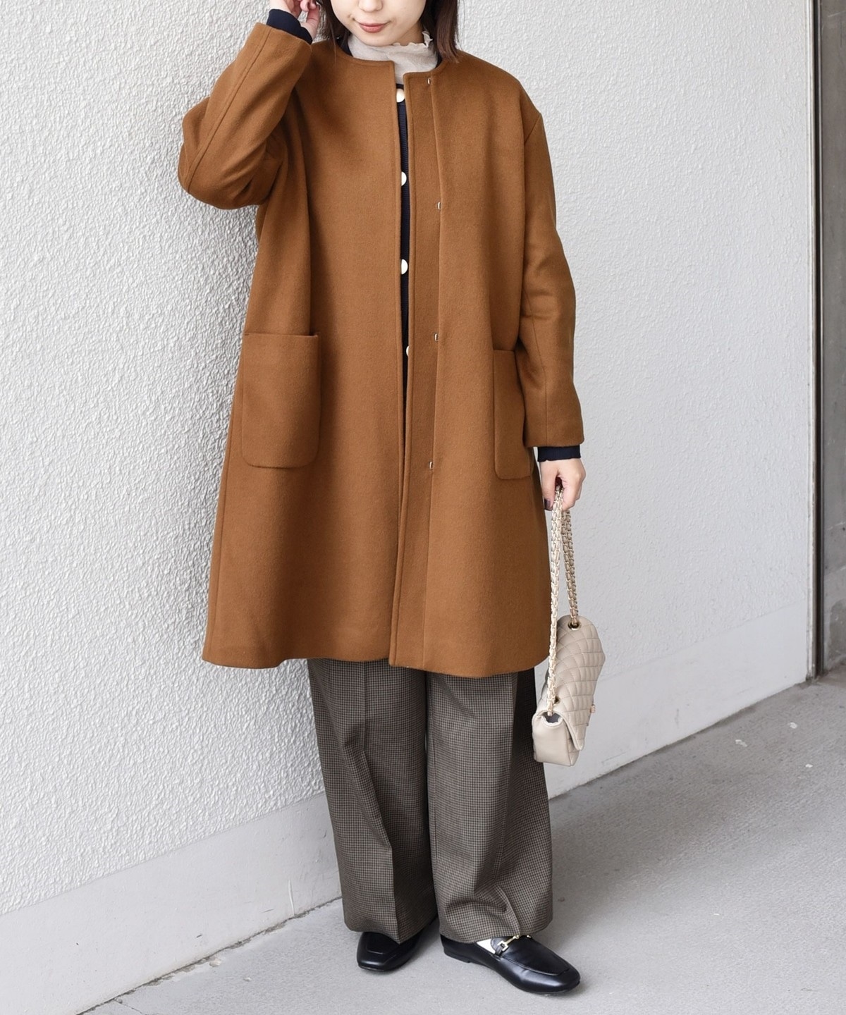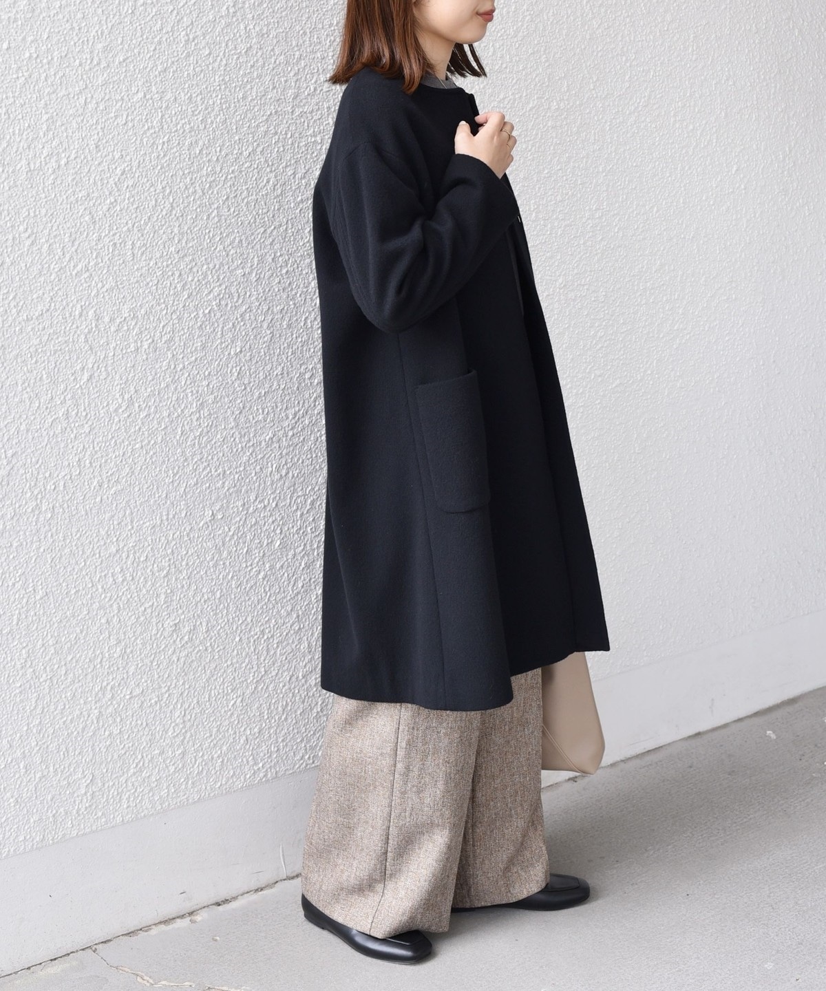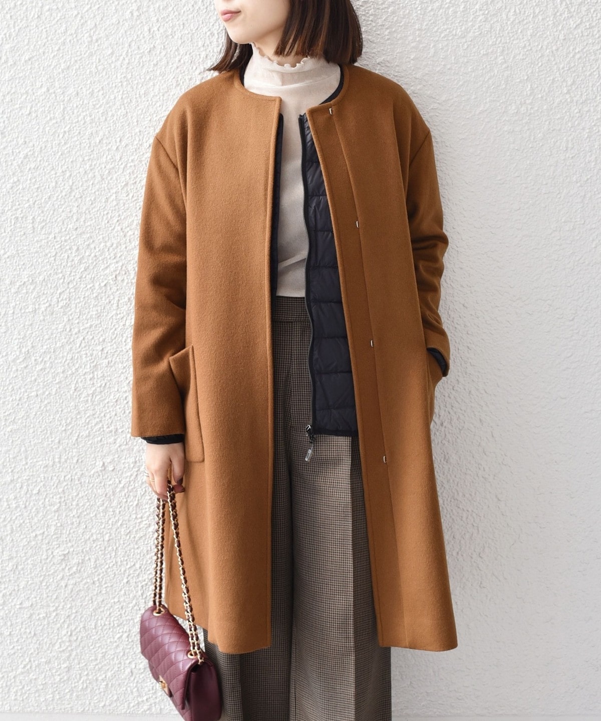 女性らしい上品さと、幅広いシーンで活躍してくれる汎用性の高さが魅力のノーカラーコート。
