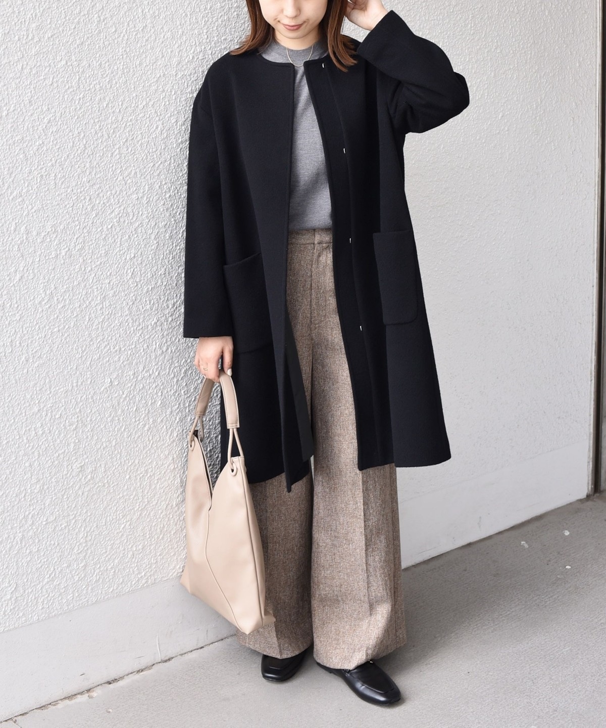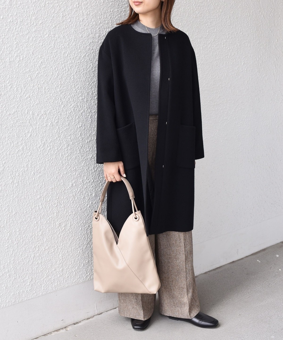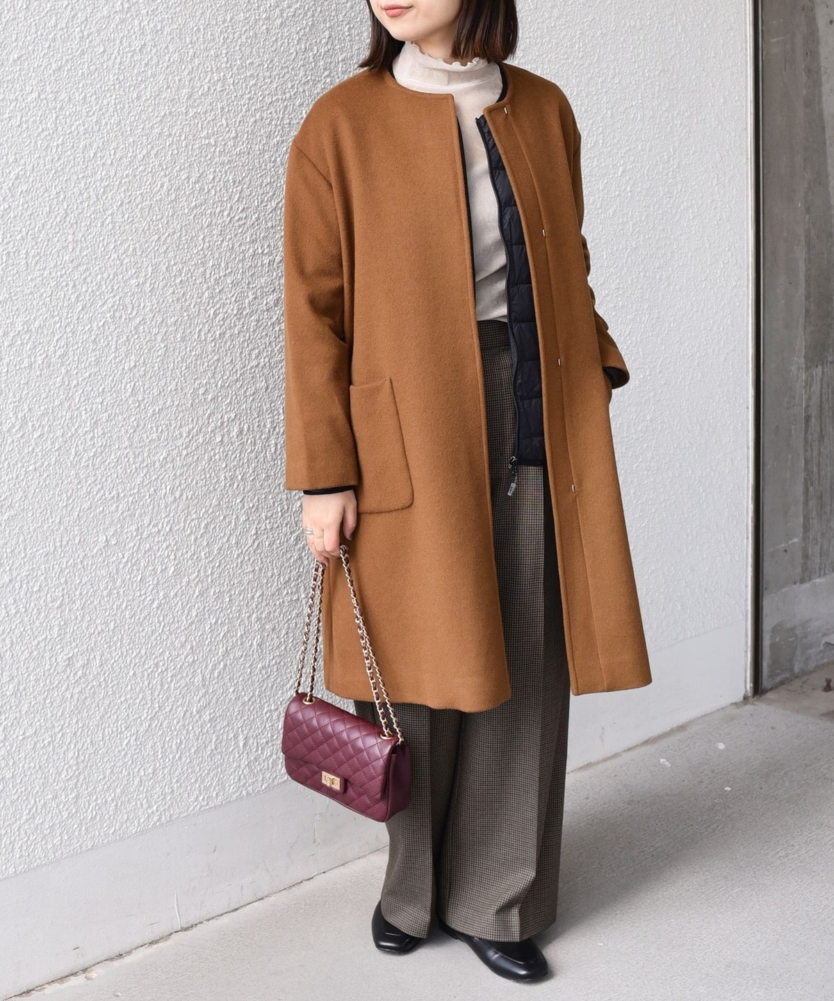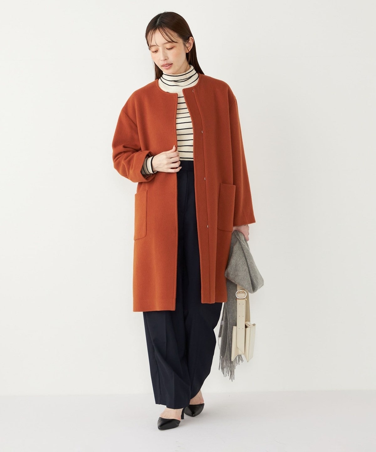 女性らしい上品さと、幅広いシーンで活躍してくれる汎用性の高さが魅力のノーカラーコート。