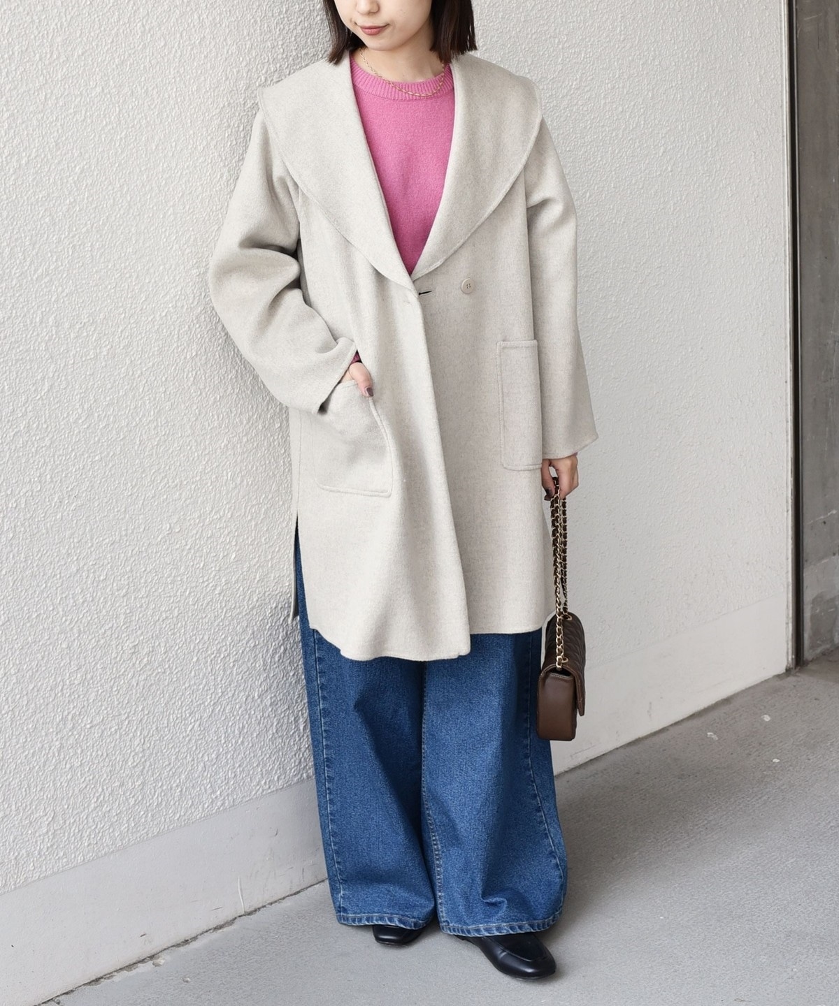 リバー素材ならではの軽さが魅力のワイドカラーコート。