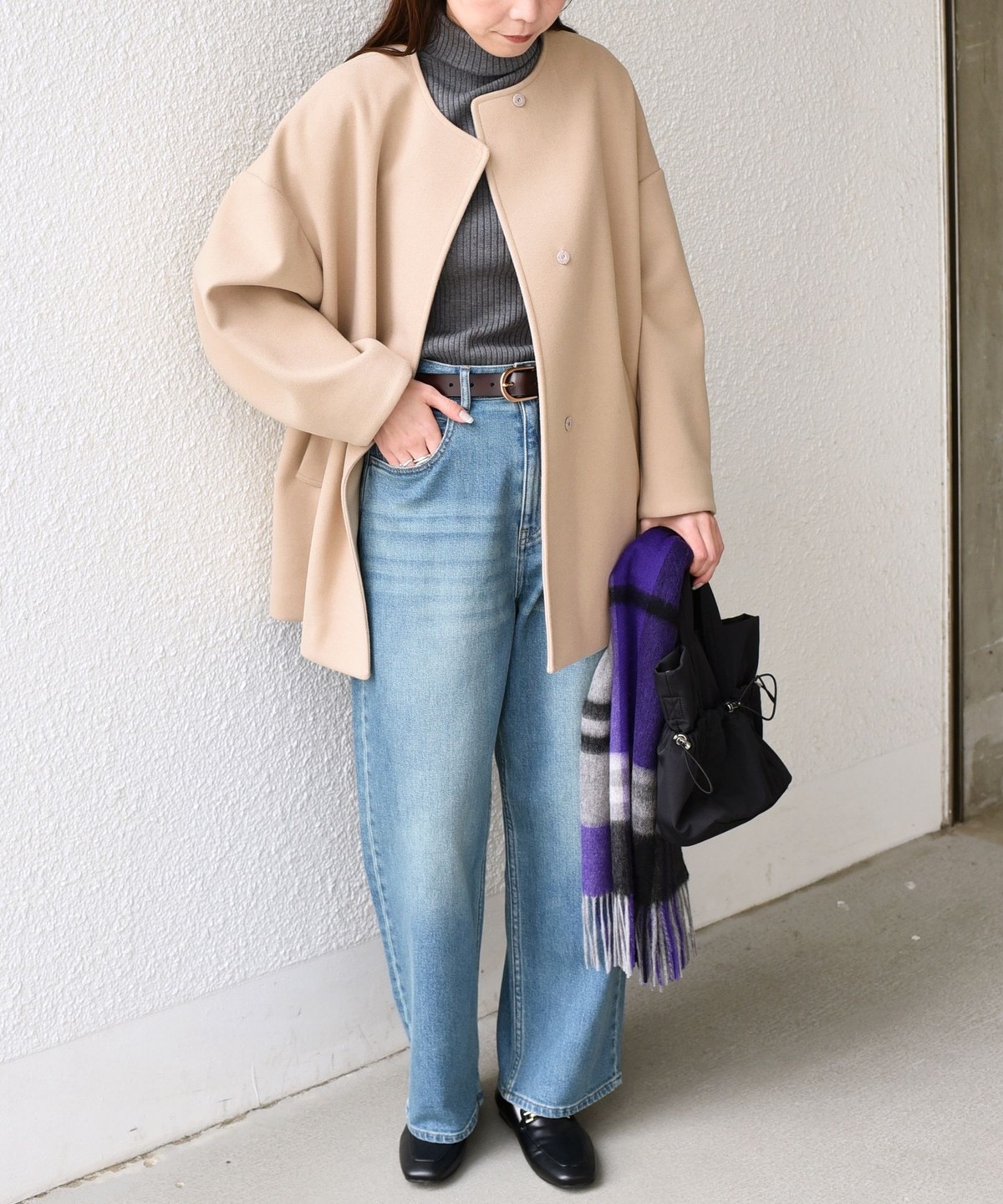 長すぎない着丈でバランスが取りやすく、スカートにもパンツにも合わせやすい一枚です。