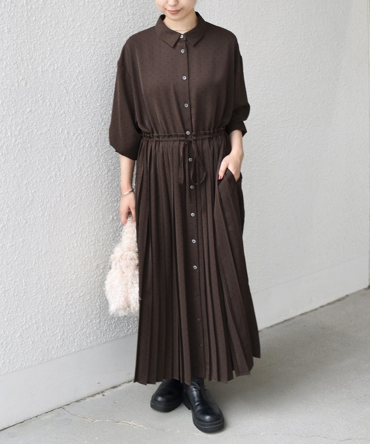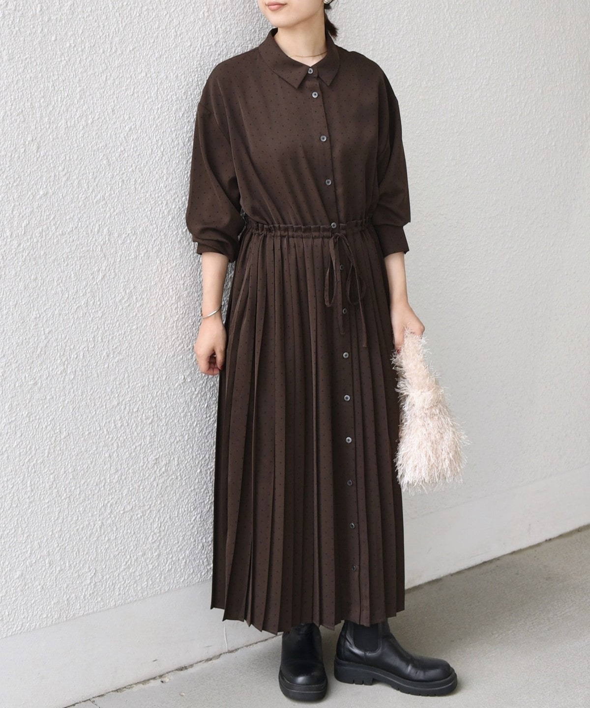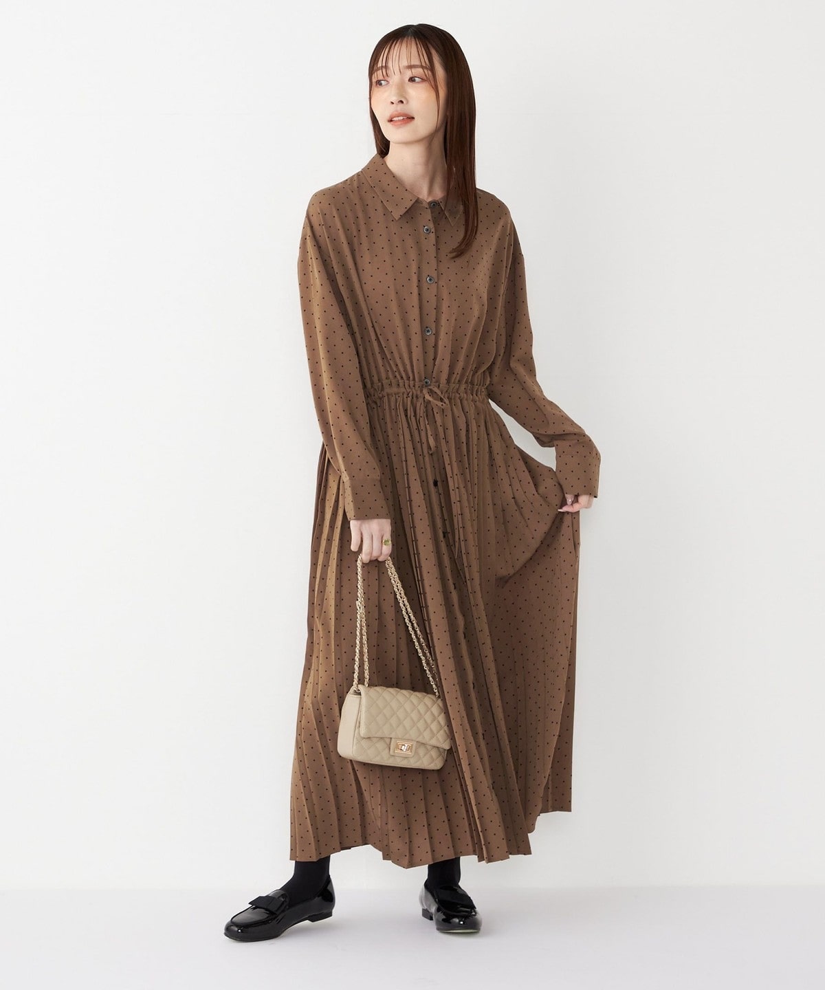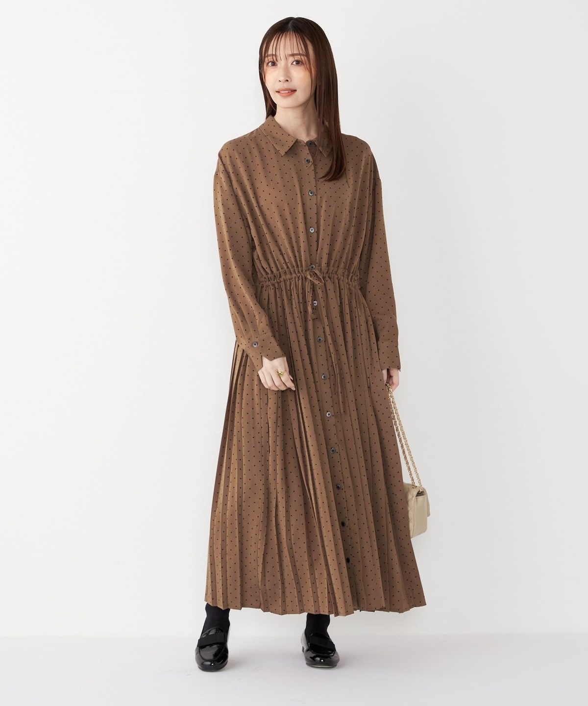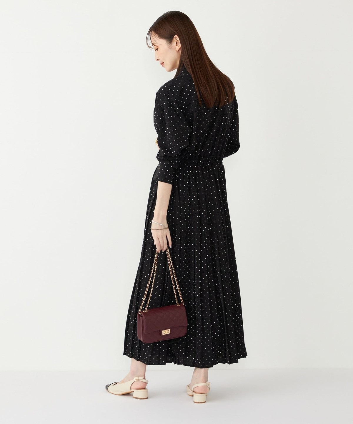 細かなドットプリントが華やかさを添えるワンピース。