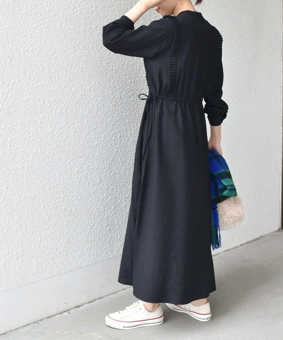 ウエストリボンは調整可能で、絞るとメリハリのあるフィット&フレアのシルエット、ゆるめて落ち感のあるシルエットに。