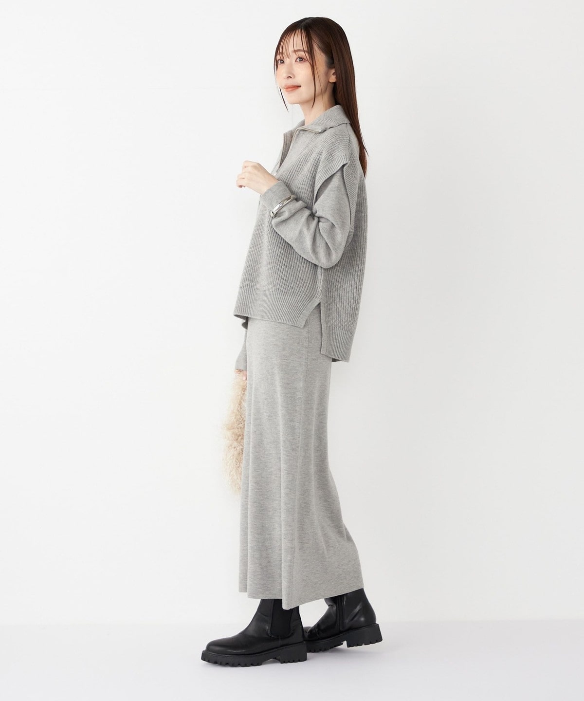 ワンピースはクルーネックの総針ニットで、身体のラインを拾いにくく、気兼ねなく着用していただけます。