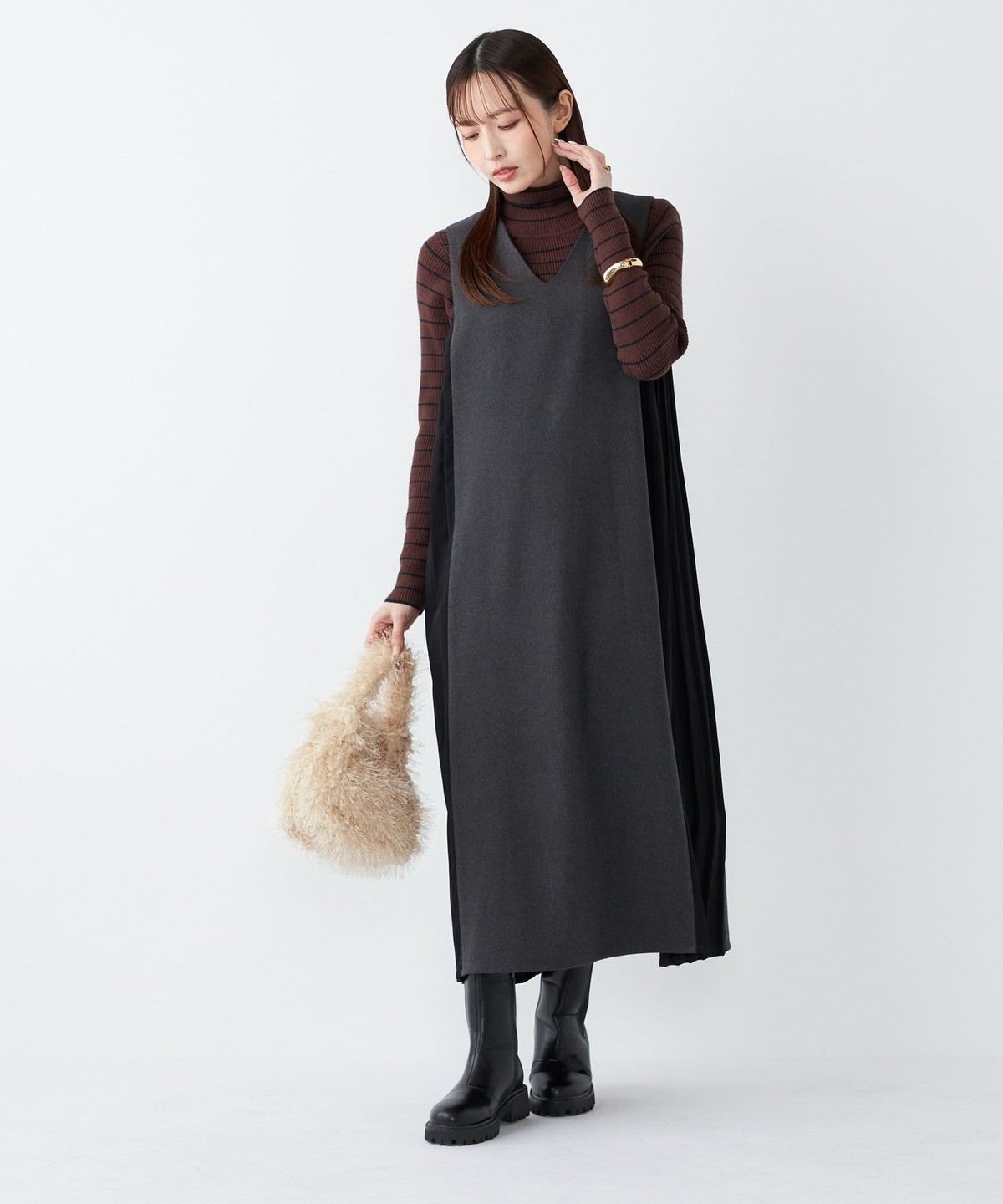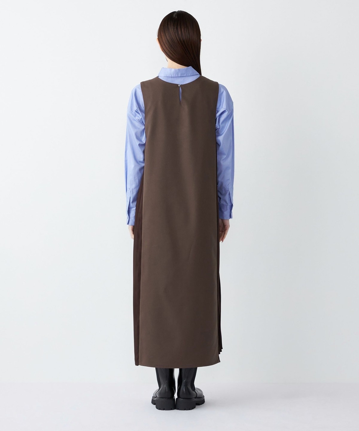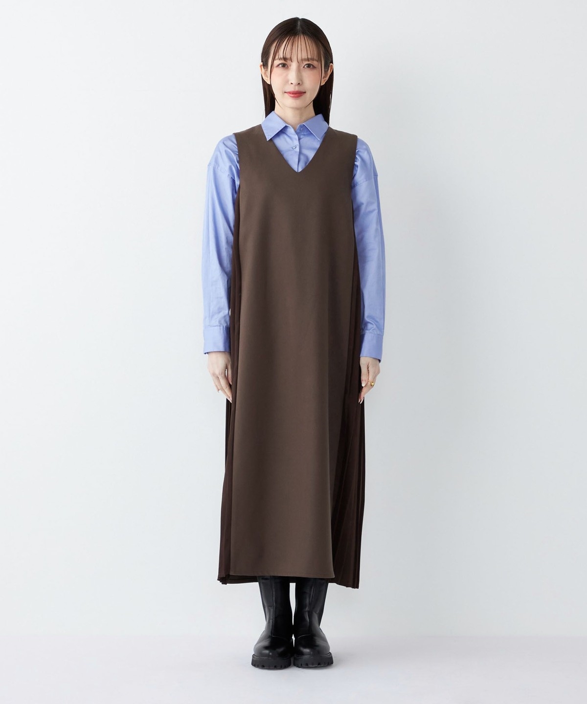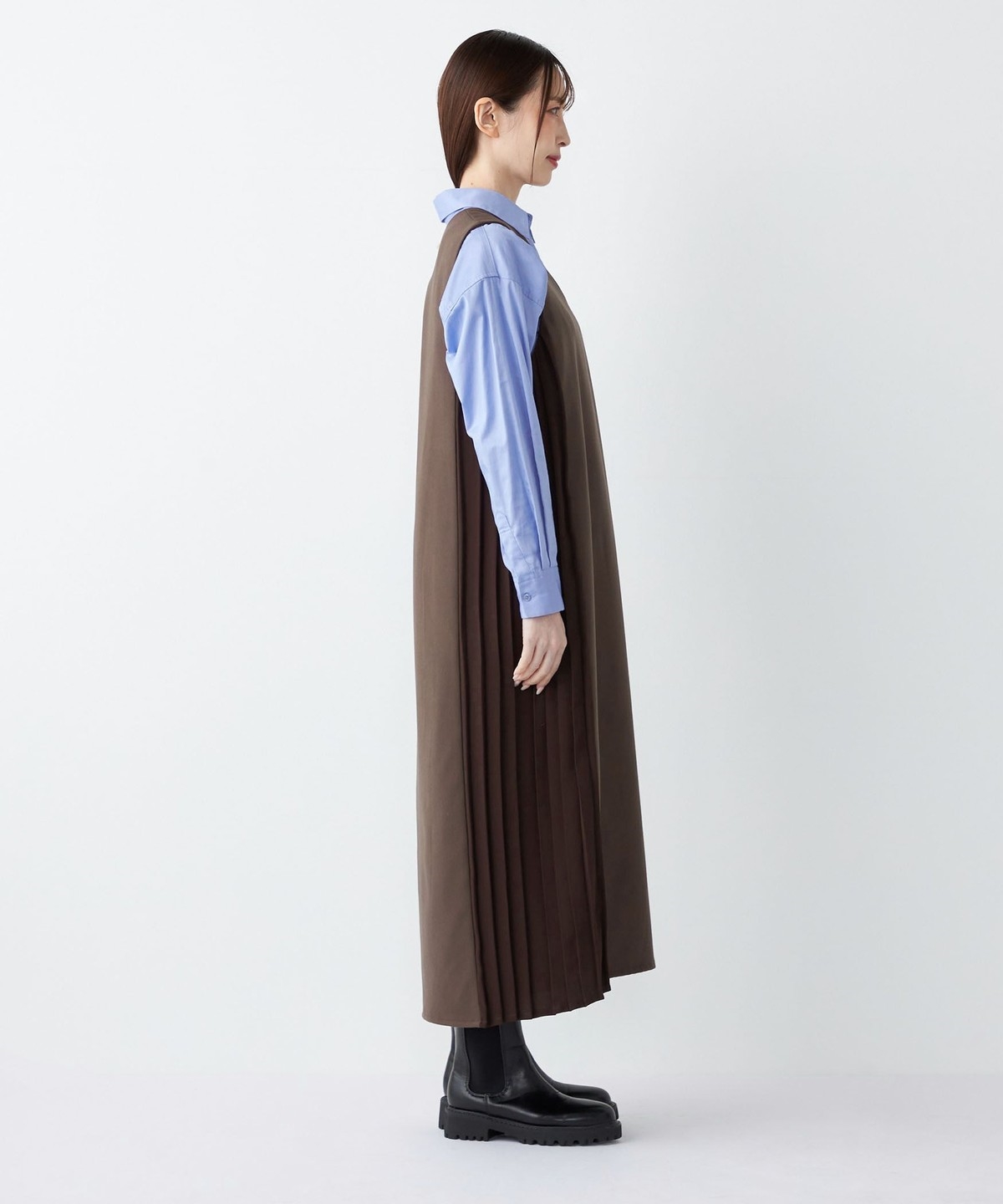 サイドにプリーツをドッキングしたジャンパーワンピース。