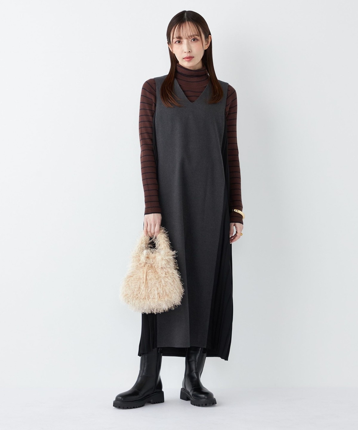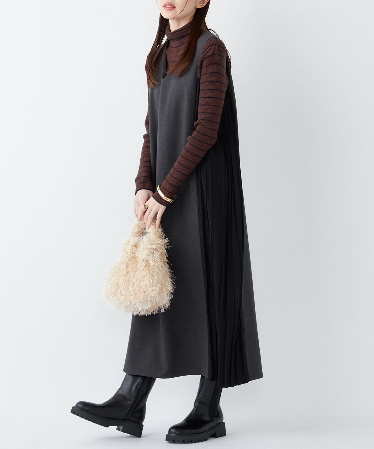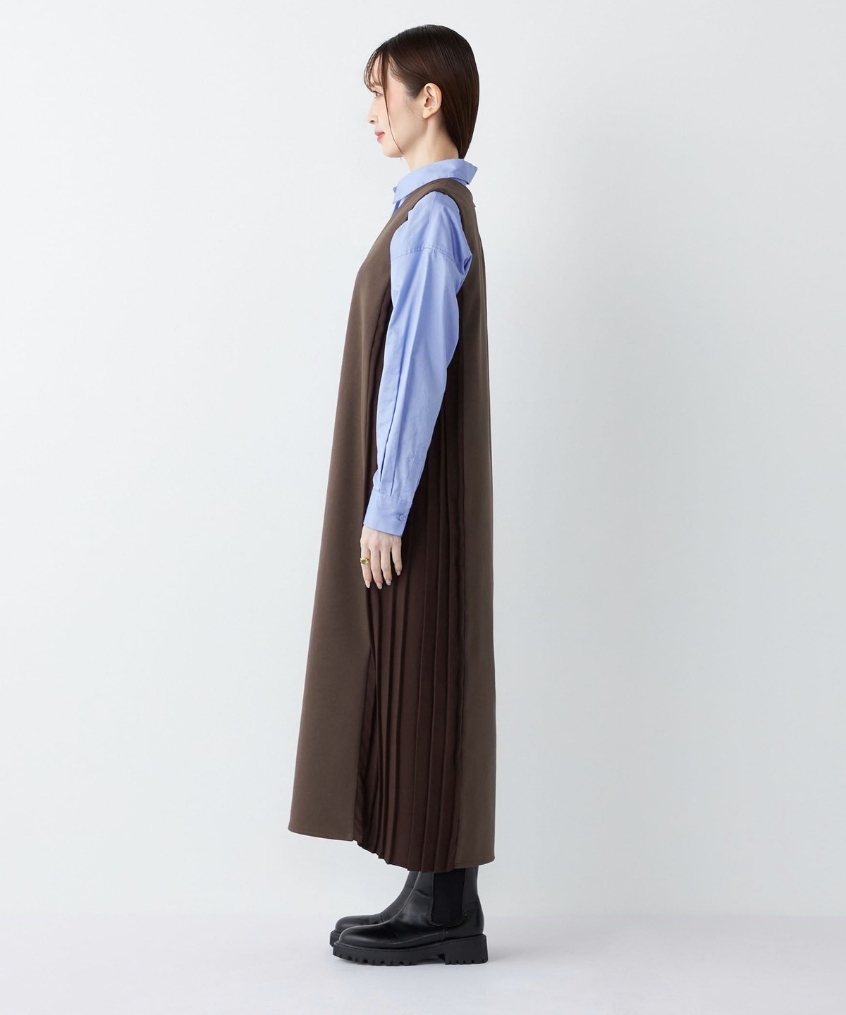 サイドにプリーツをドッキングしたジャンパーワンピース。