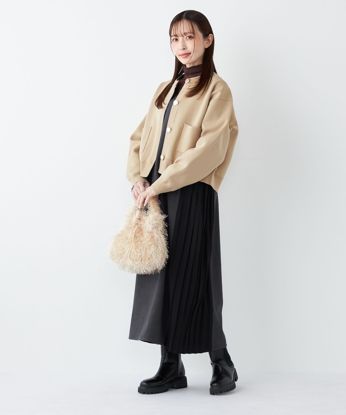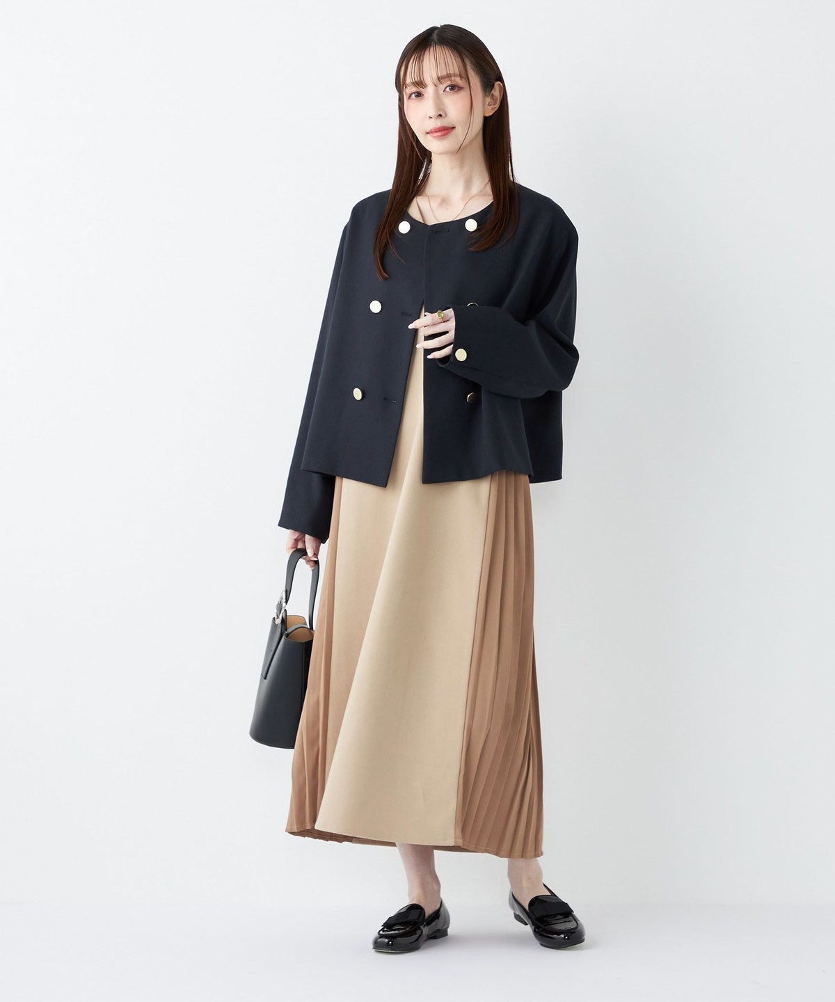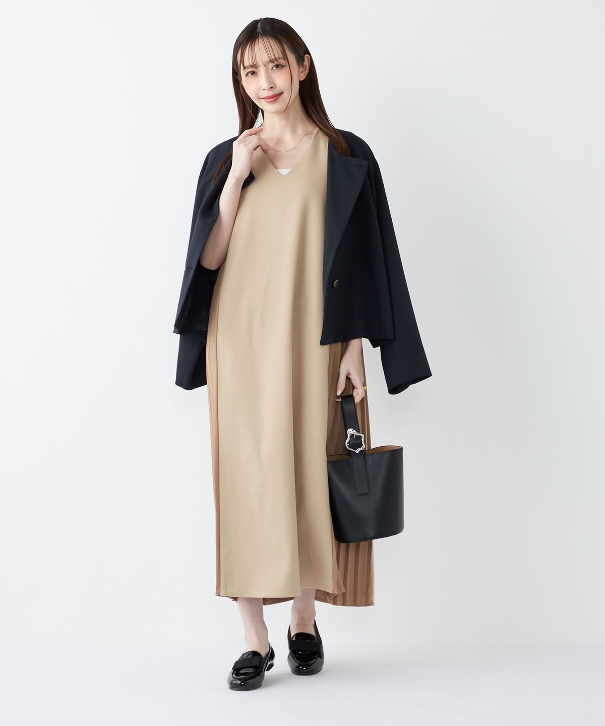 同系色のプリーツなので、大人の落ち着いた印象を与えつつ、動きのあるシルエットでシンプルながら着映えするデザインです。