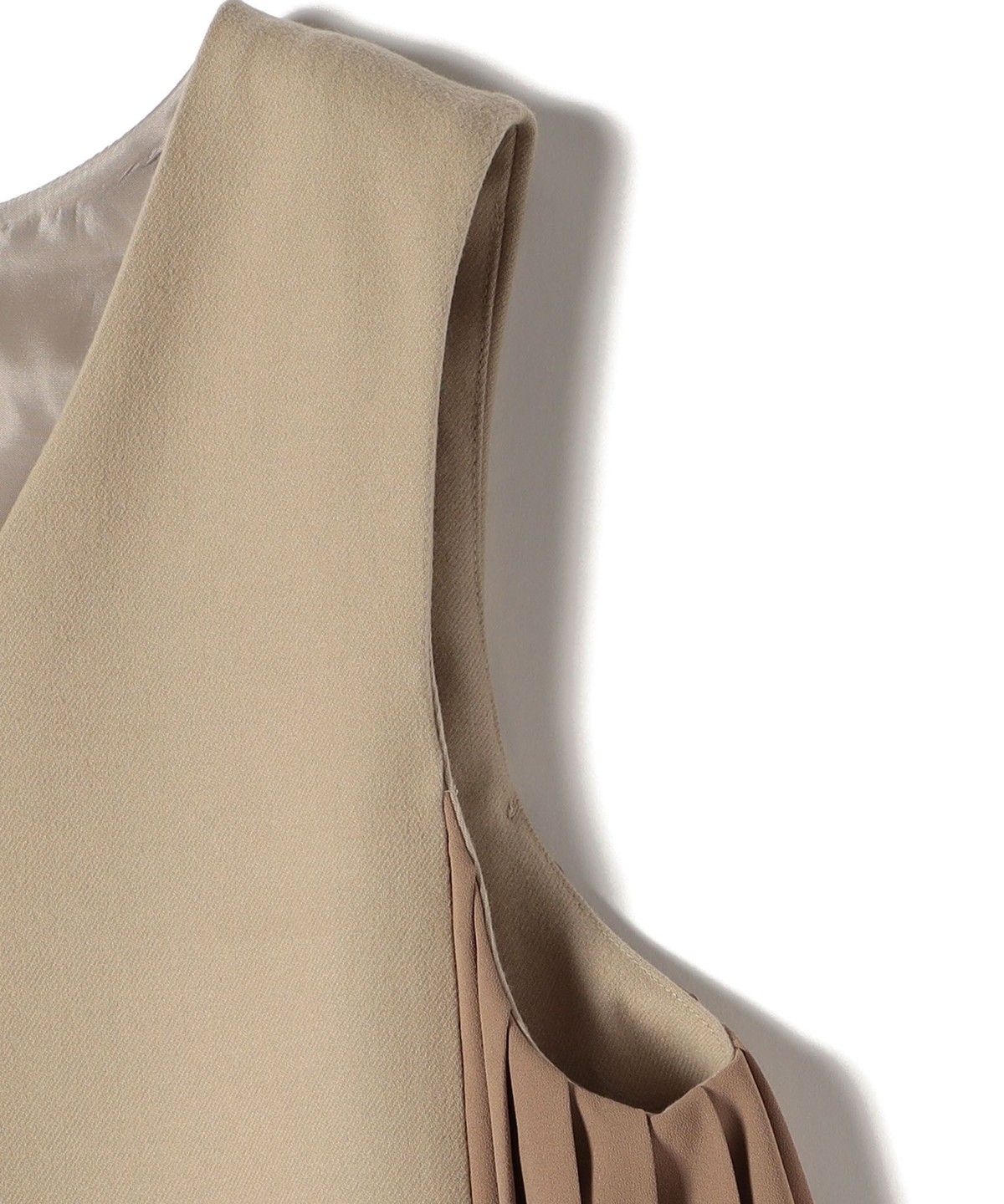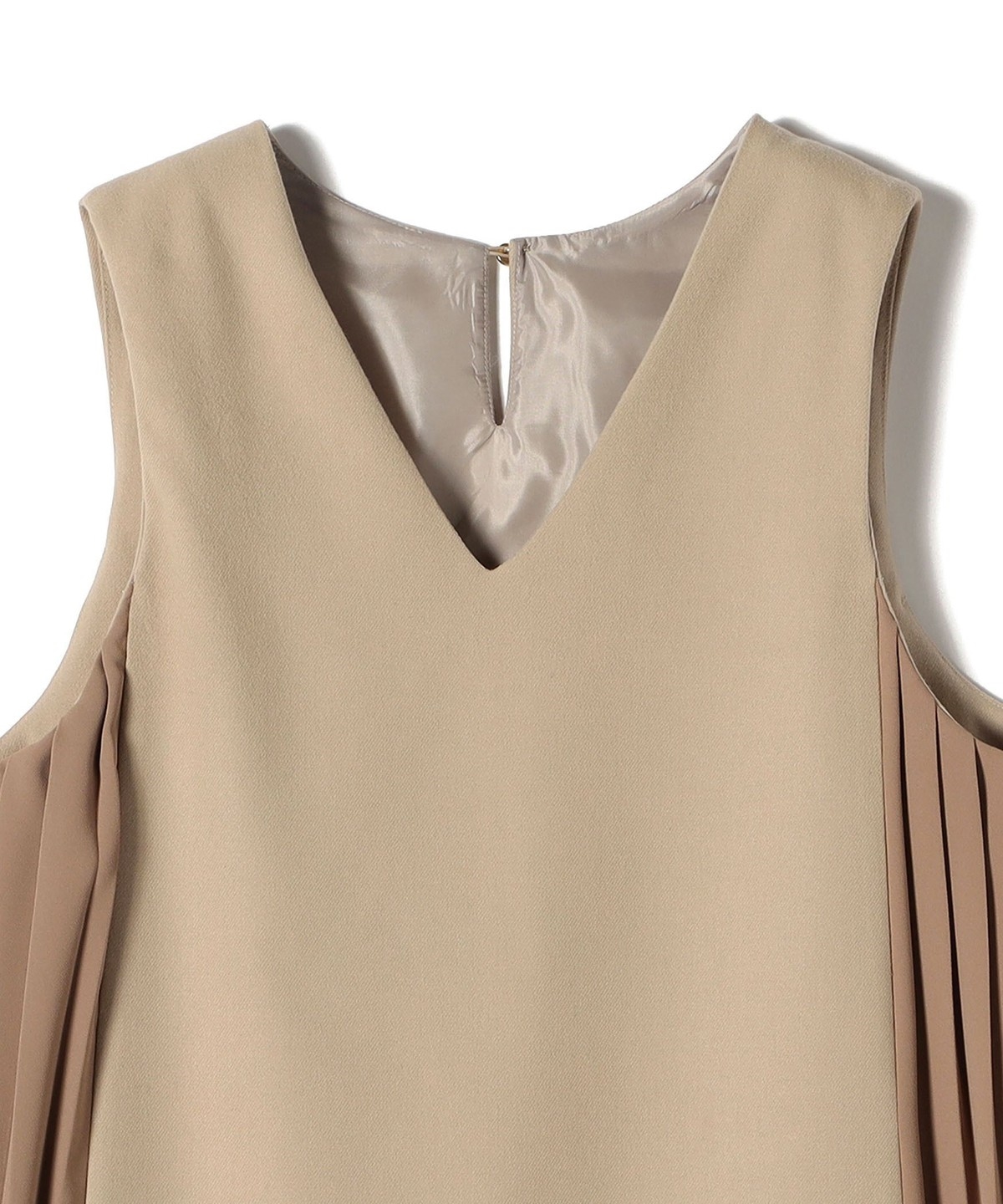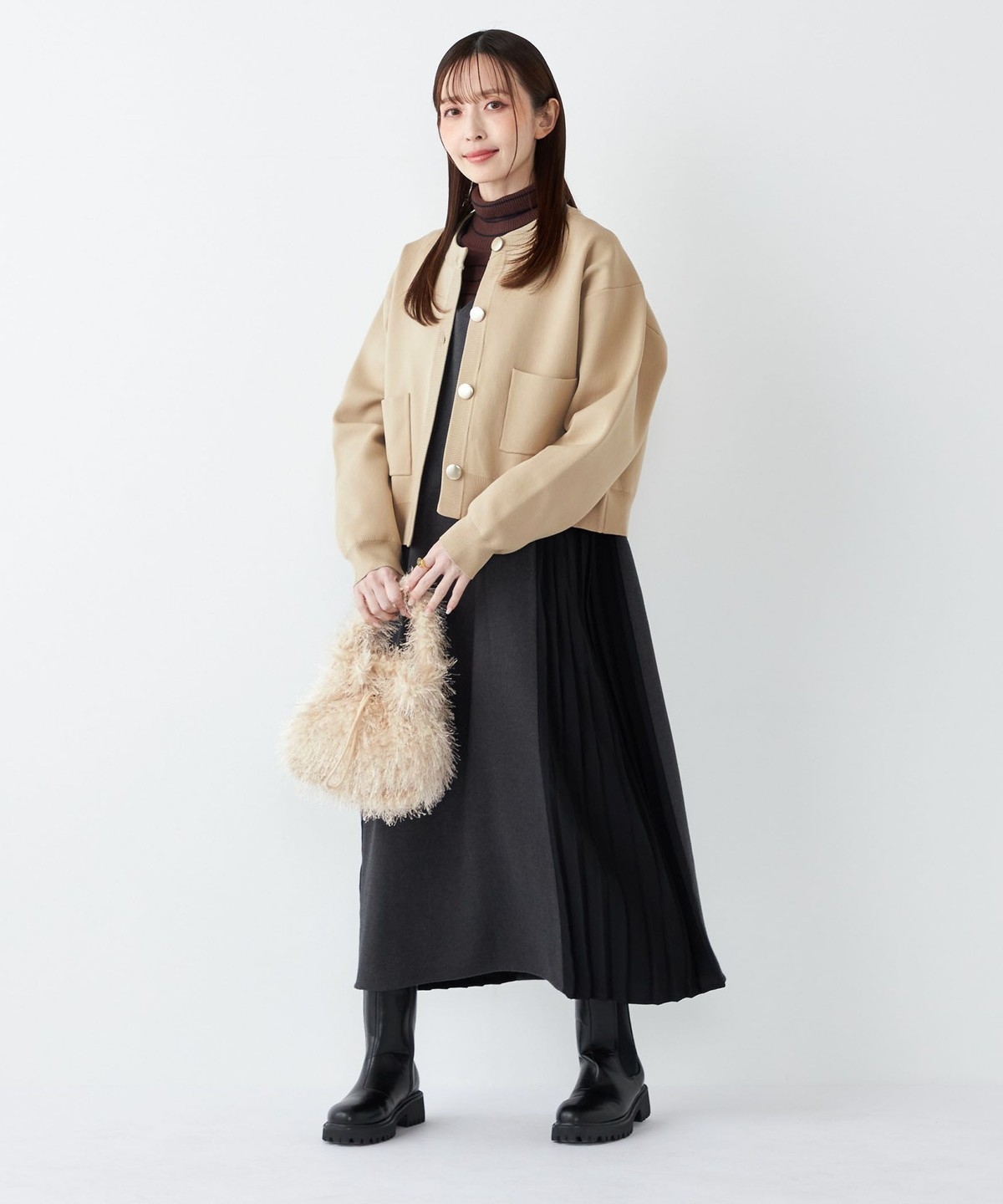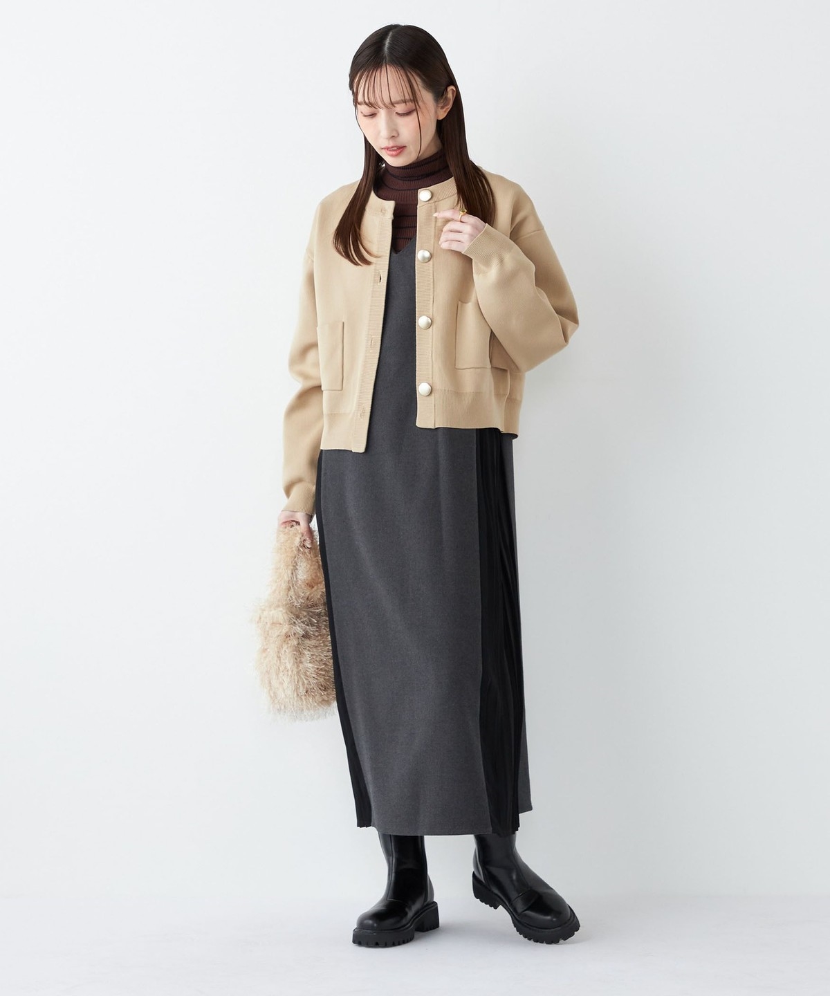同系色のプリーツなので、大人の落ち着いた印象を与えつつ、動きのあるシルエットでシンプルながら着映えするデザインです。