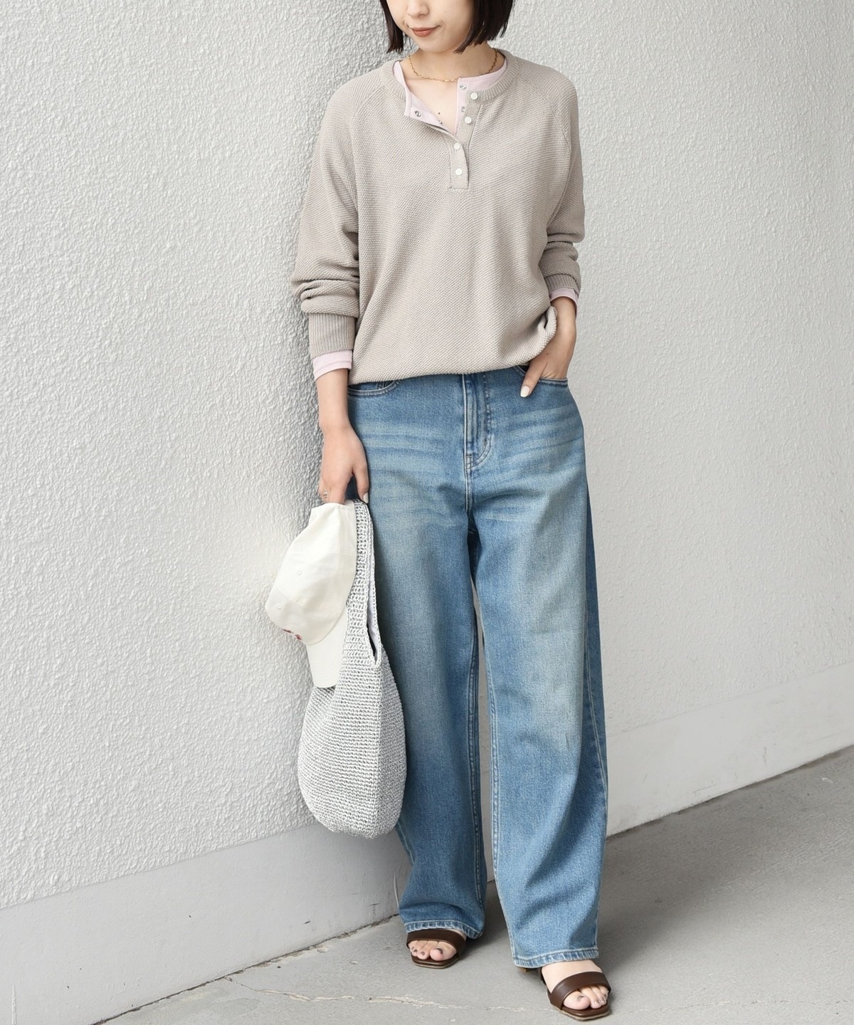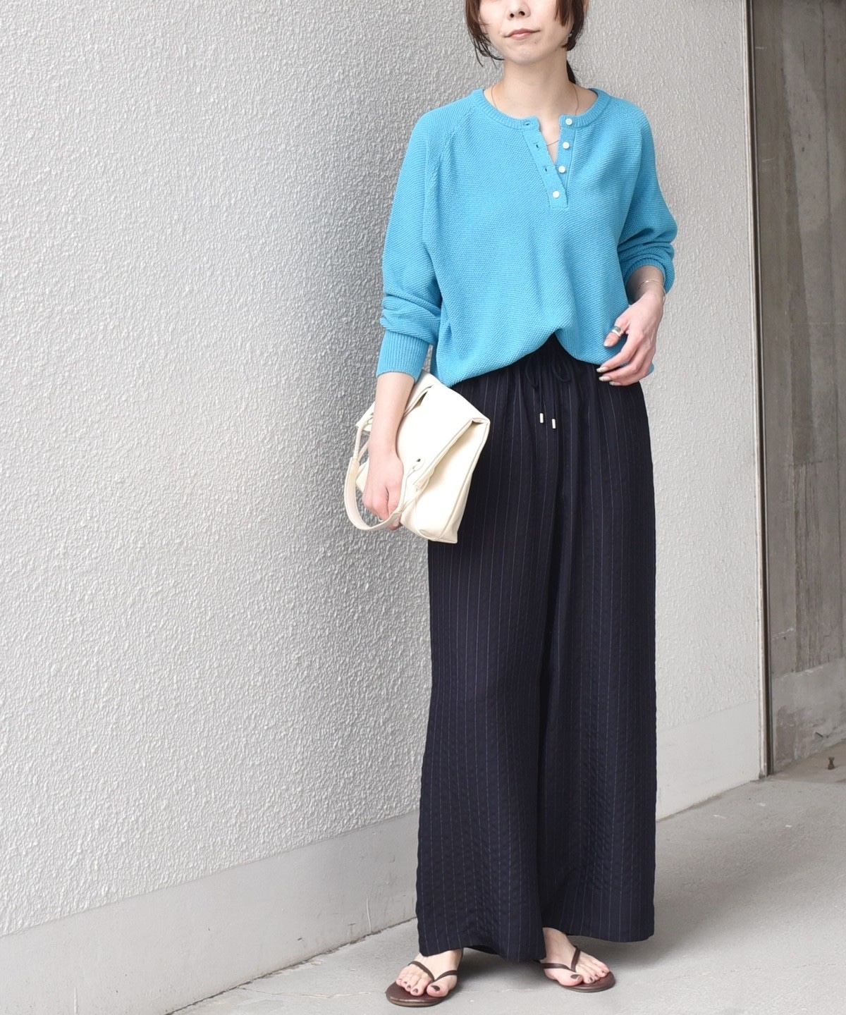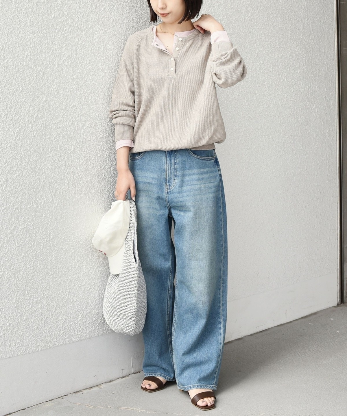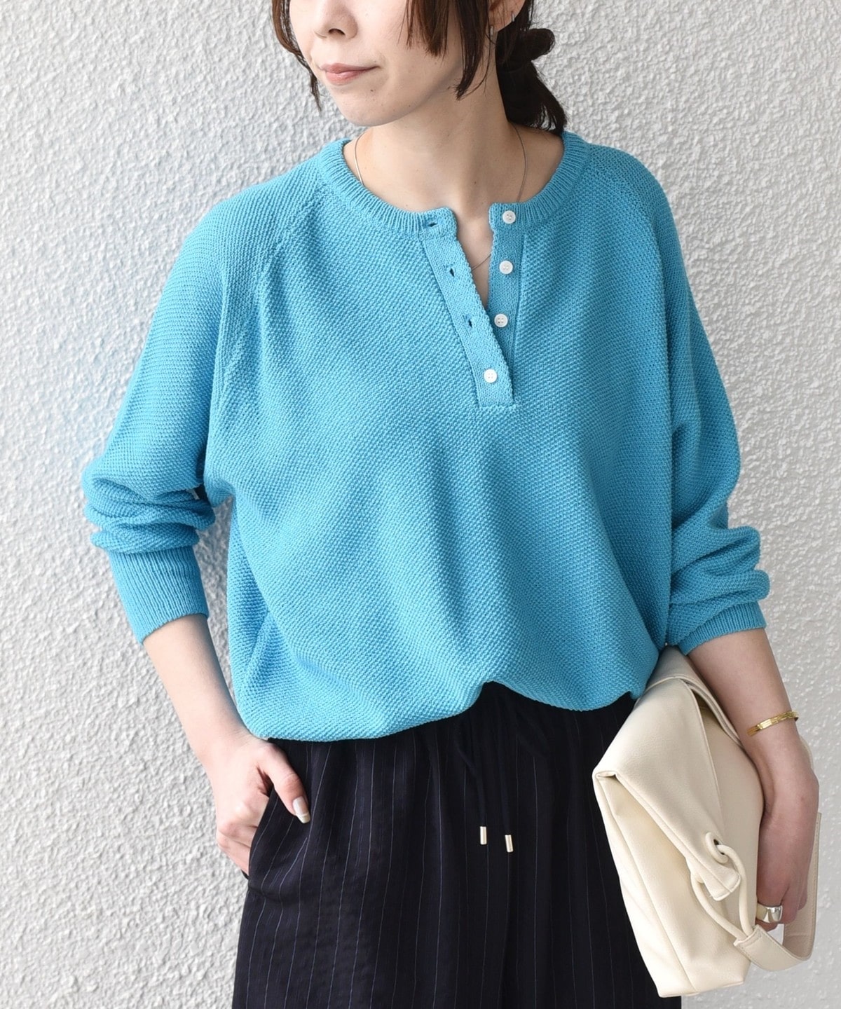 ヘンリーネックを前にして抜け感を出したり、クルーネックを前にしてシンプルにまとめたりと、雰囲気を変えて楽しんでいただけます。
