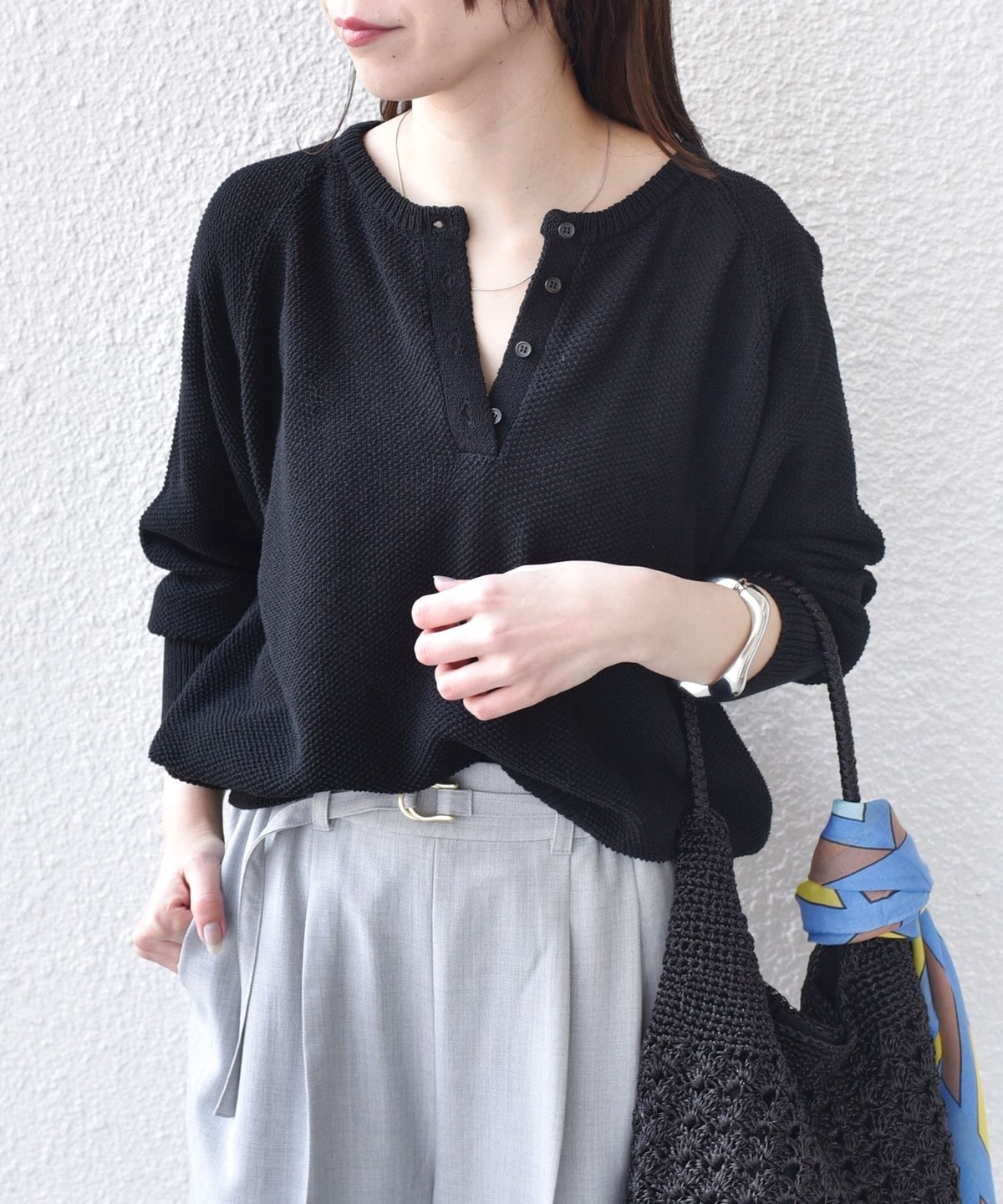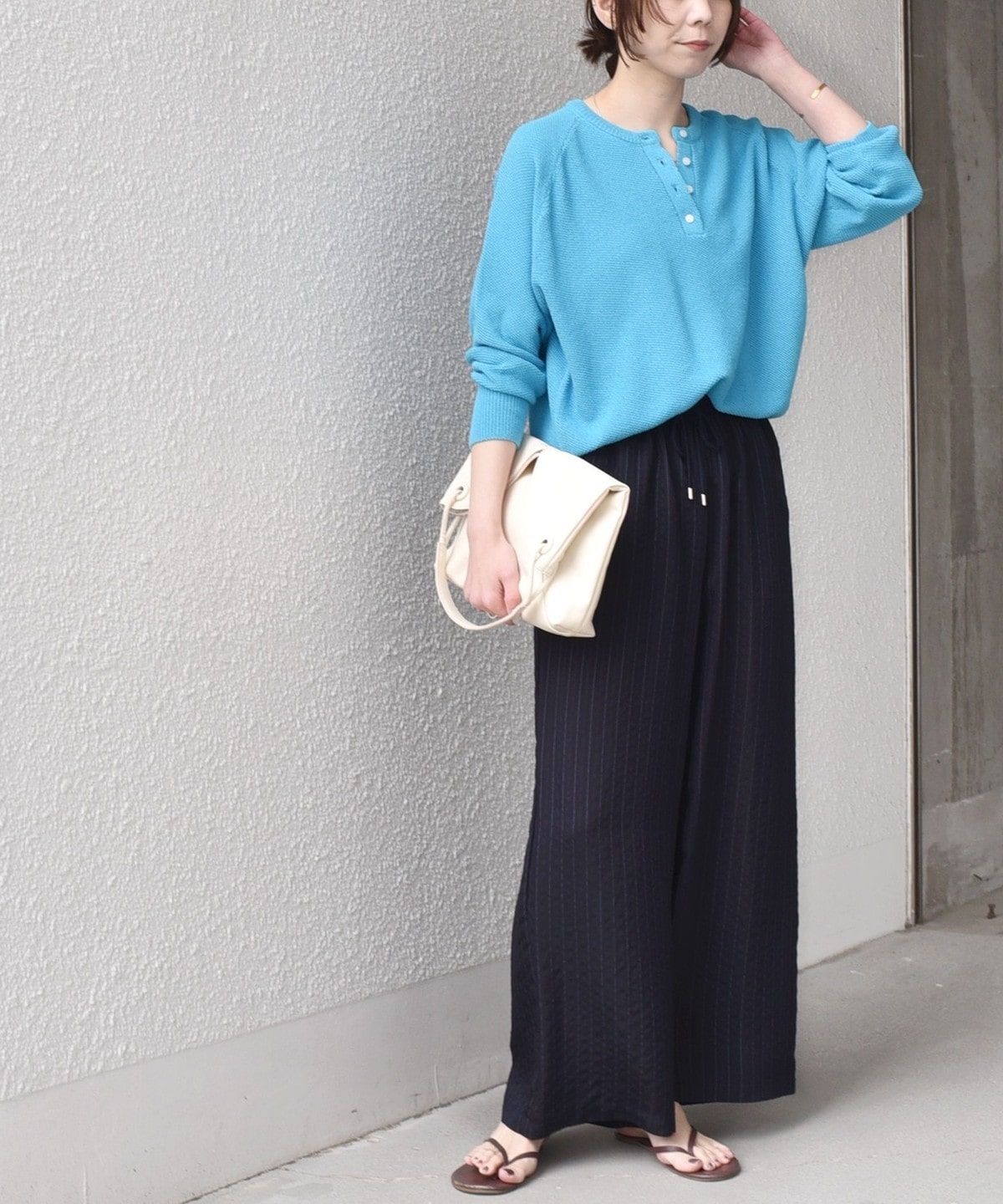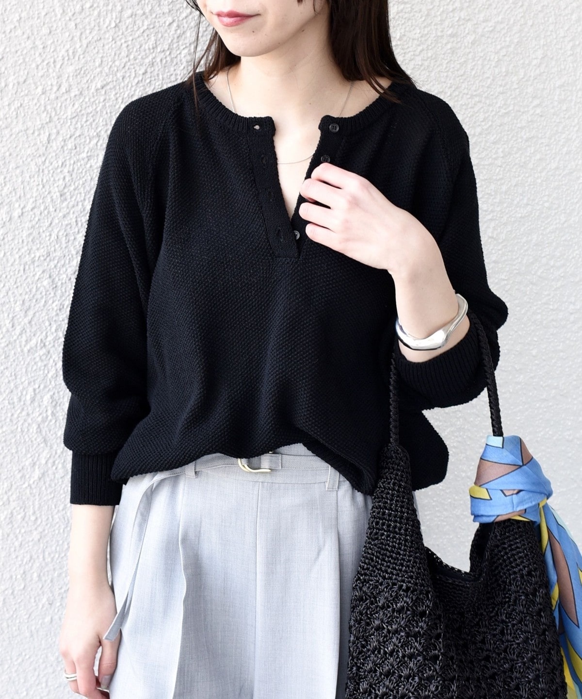 ヘンリーネックを前にして抜け感を出したり、クルーネックを前にしてシンプルにまとめたりと、雰囲気を変えて楽しんでいただけます。