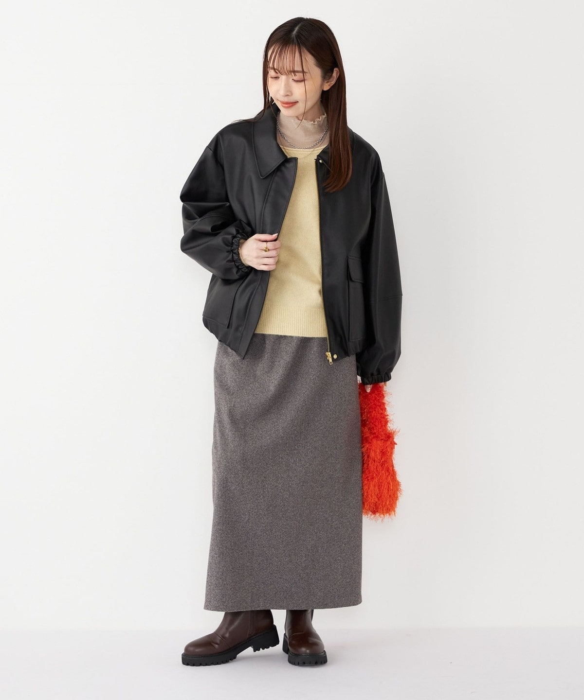 ややコンパクトめなシルエットで、スカートにもパンツにも好相性。