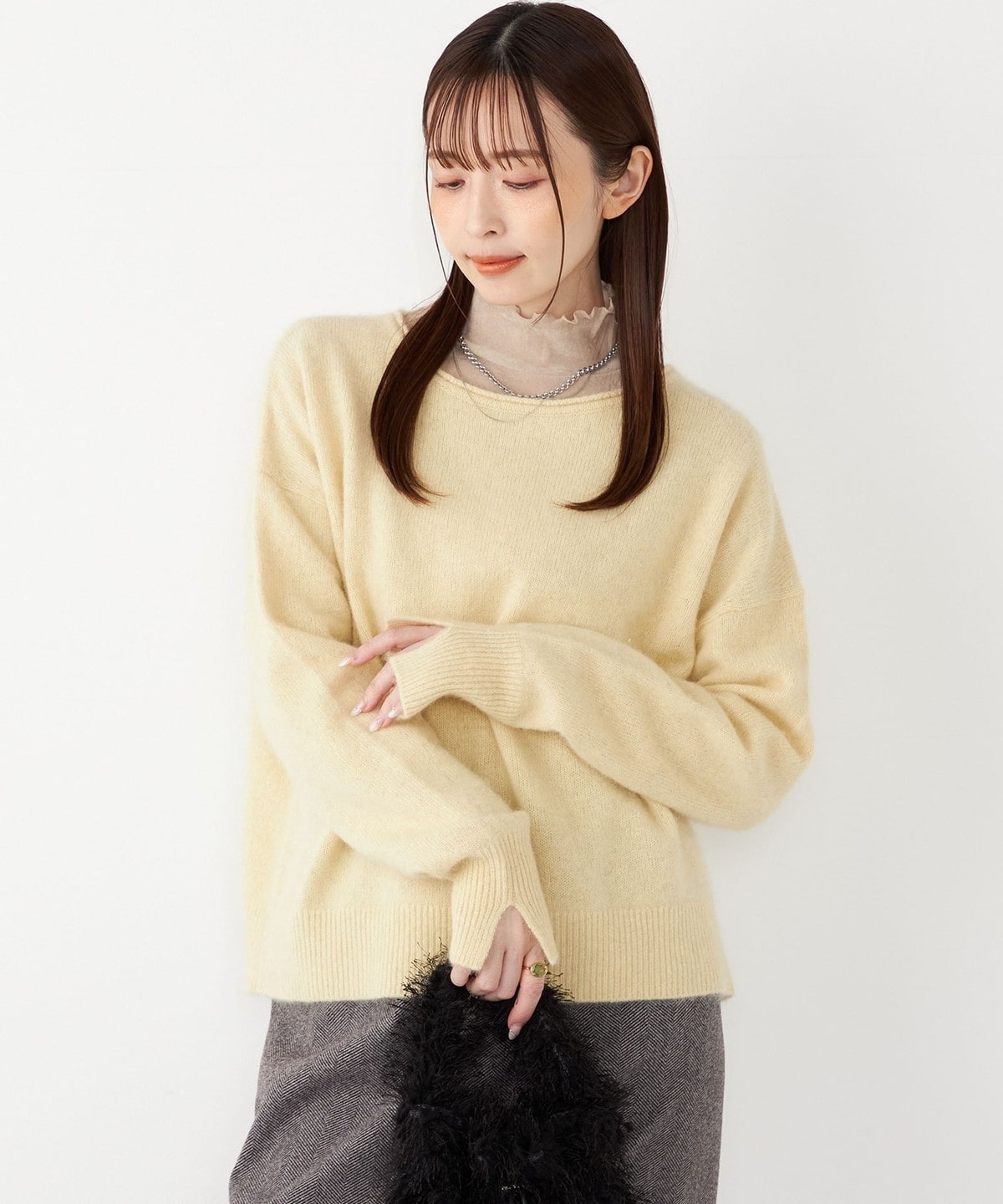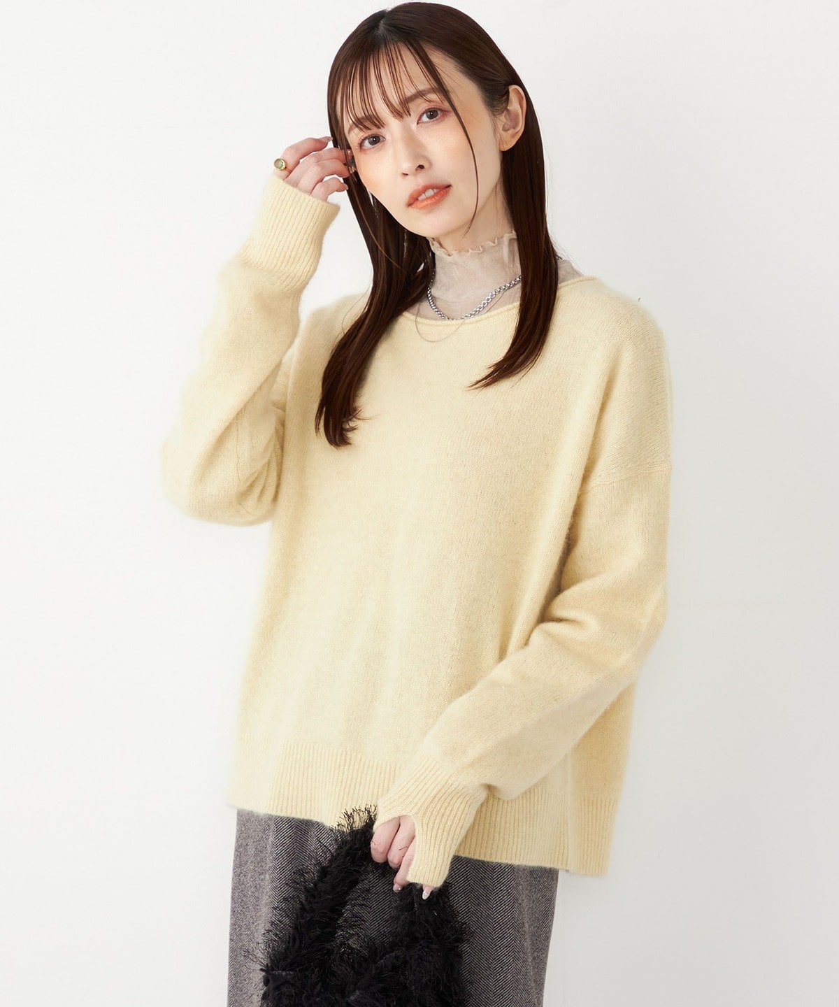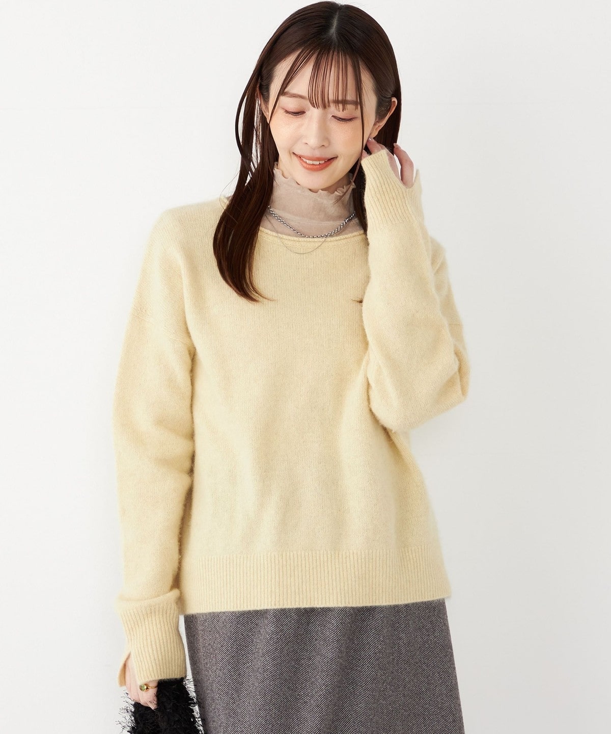 フォックス・アンゴラ混ならではの、繊細でふくらみのある生地感が魅力のニット。