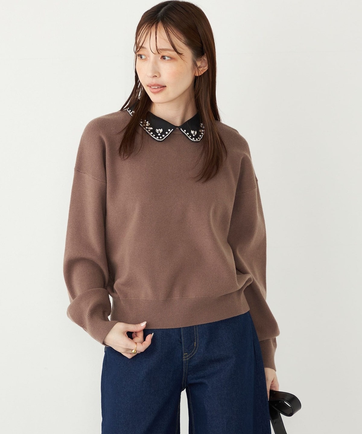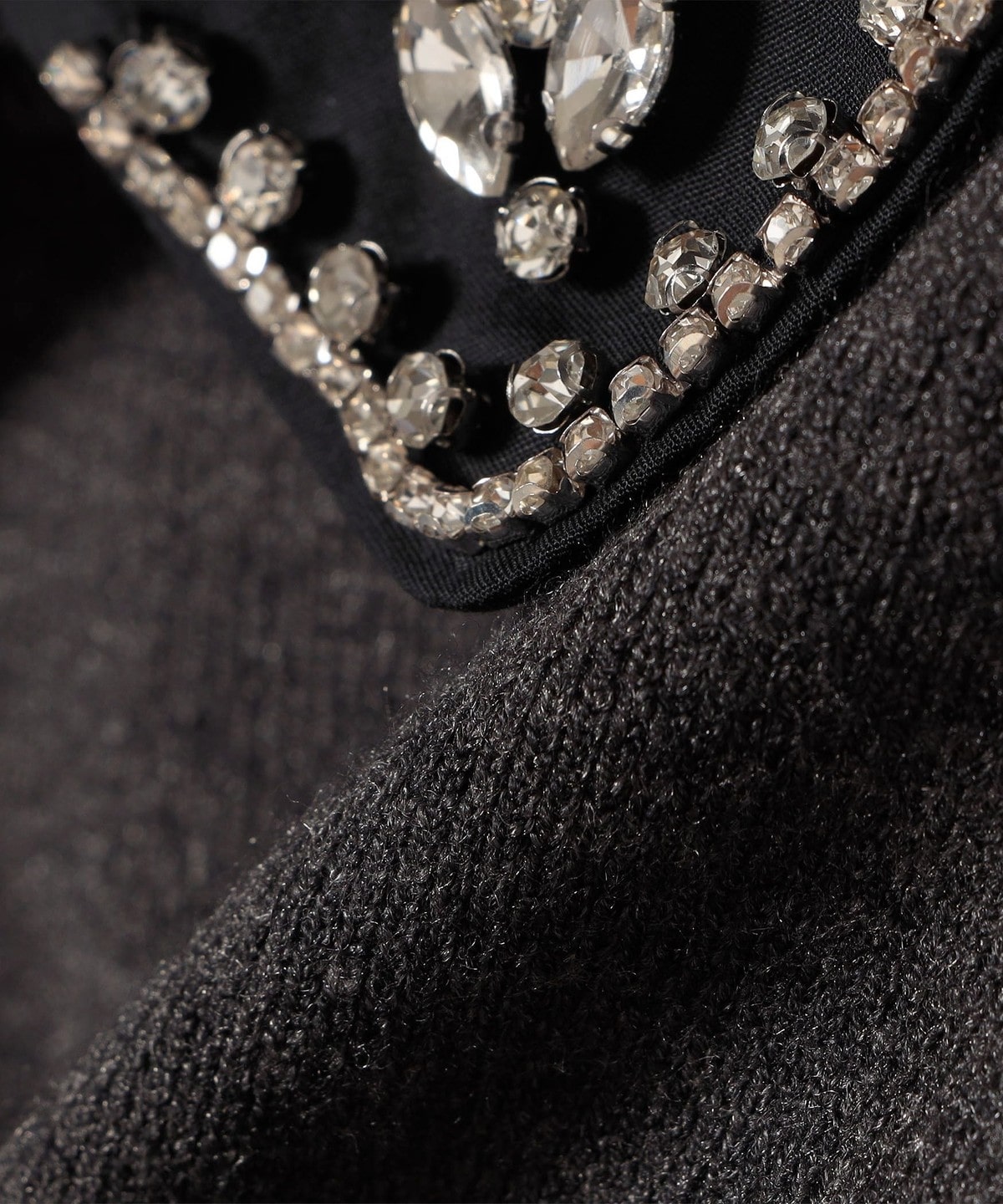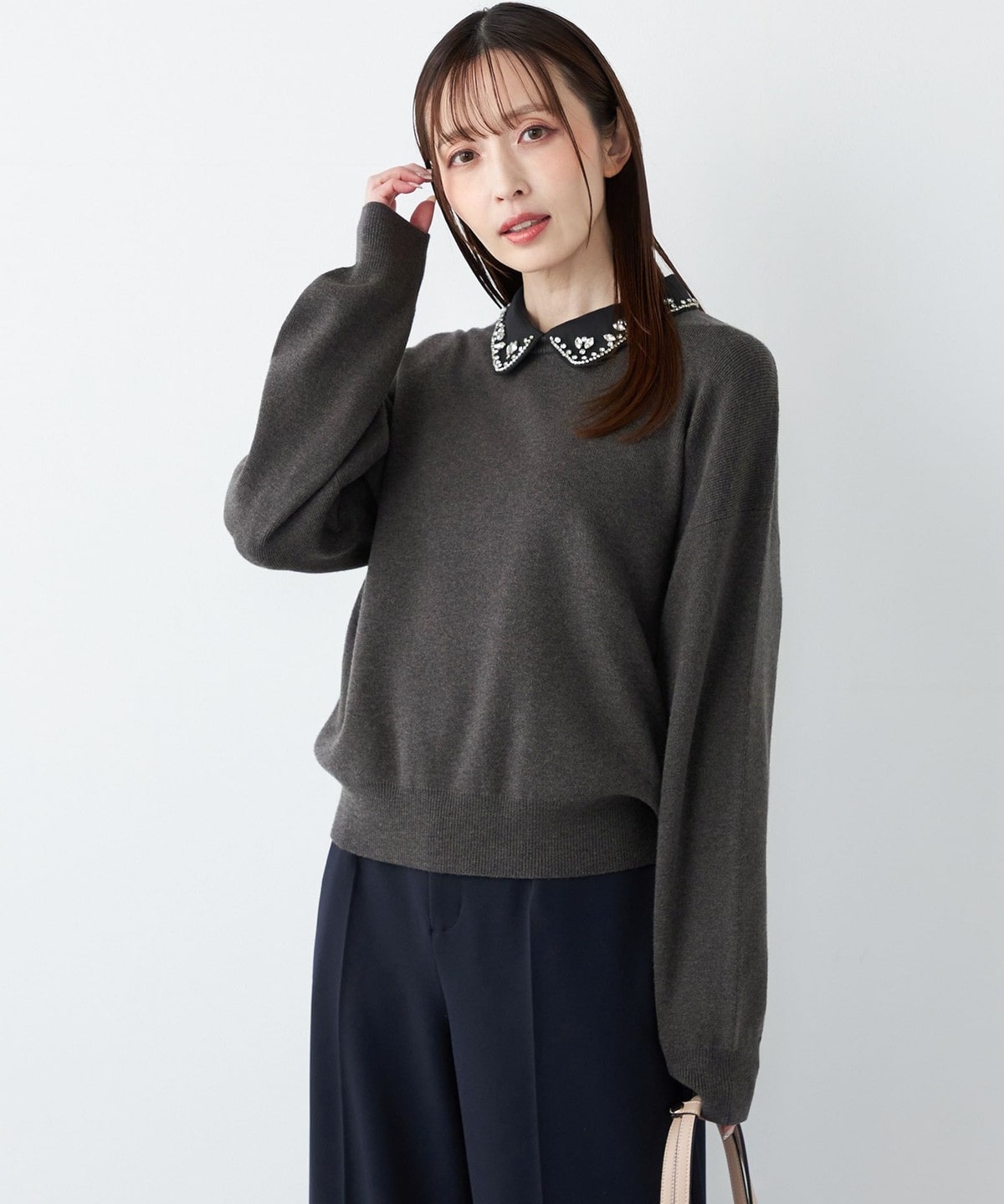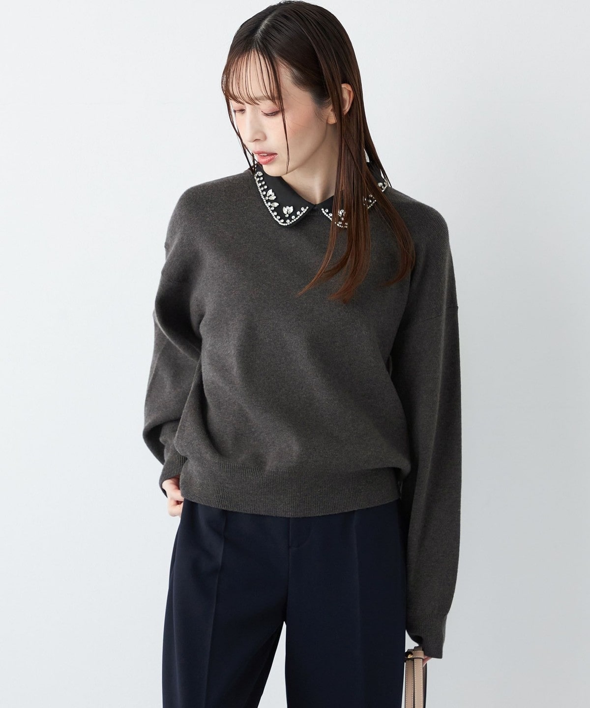 ベーシックながらも、襟元のビジューがアクセントになるニット。