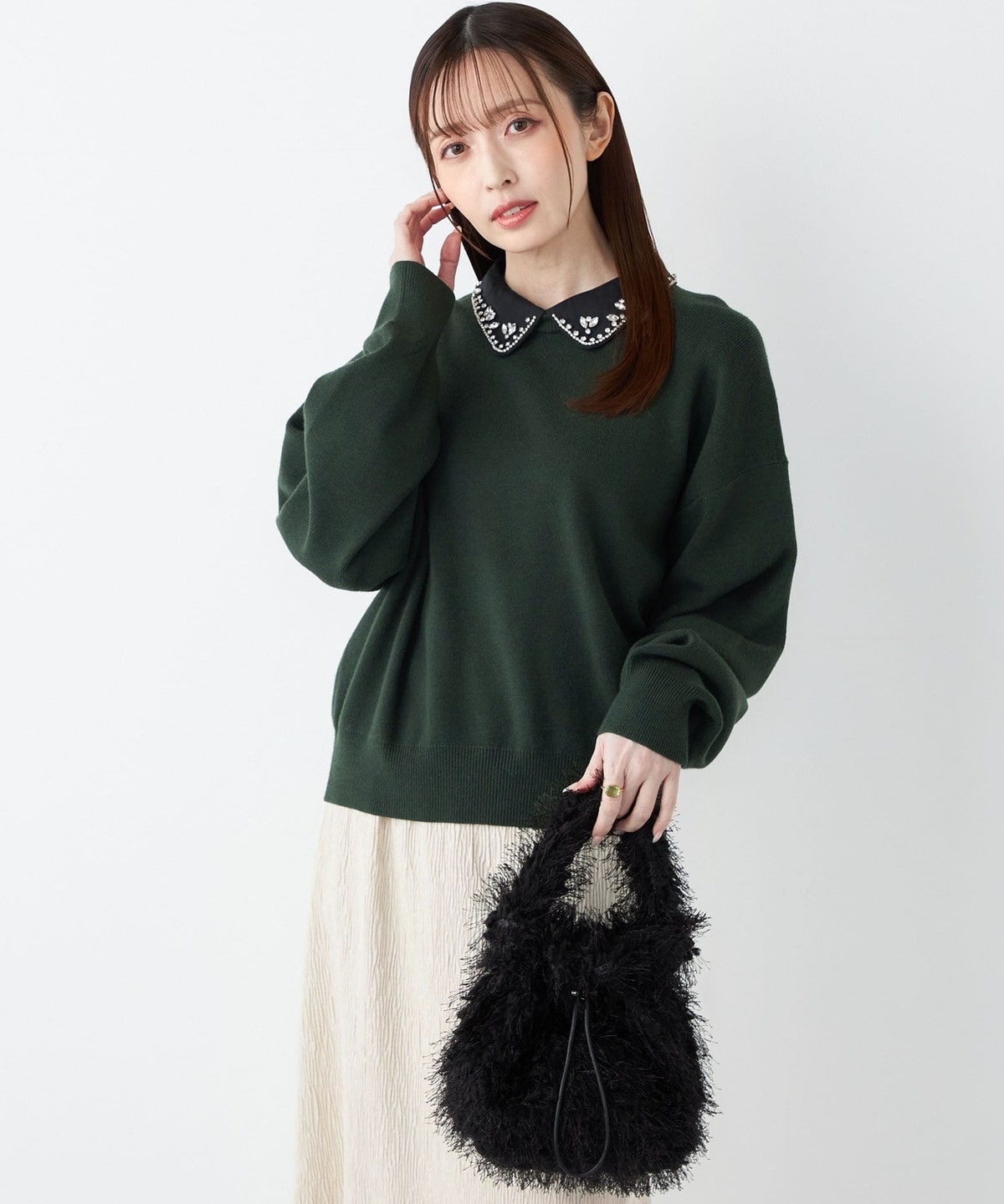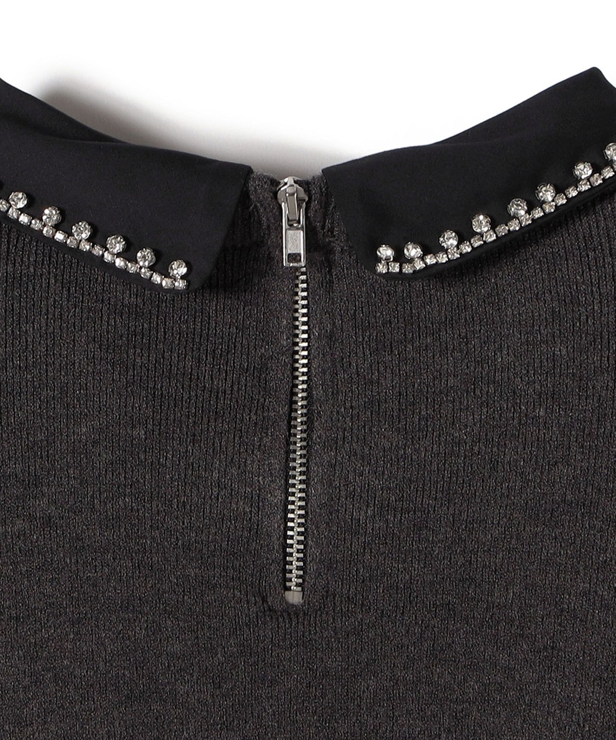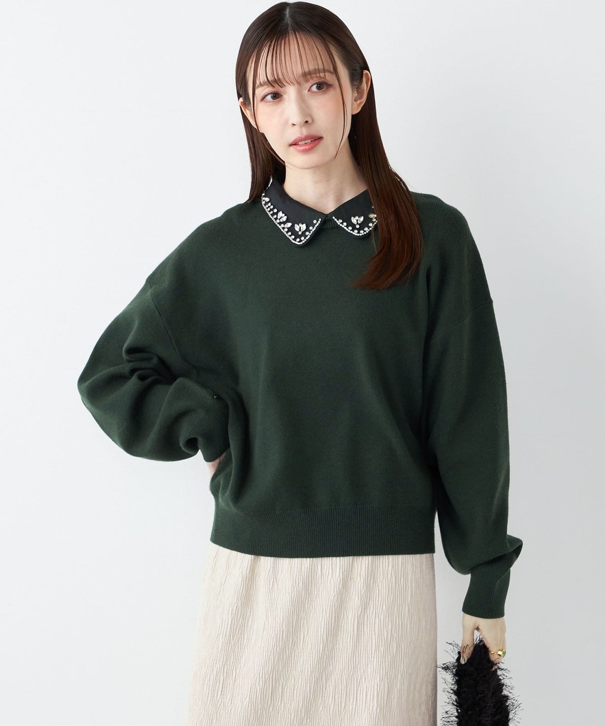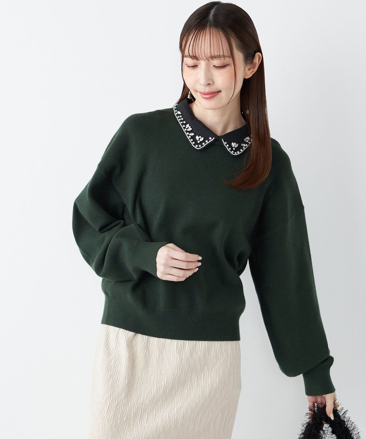 ベーシックながらも、襟元のビジューがアクセントになるニット。