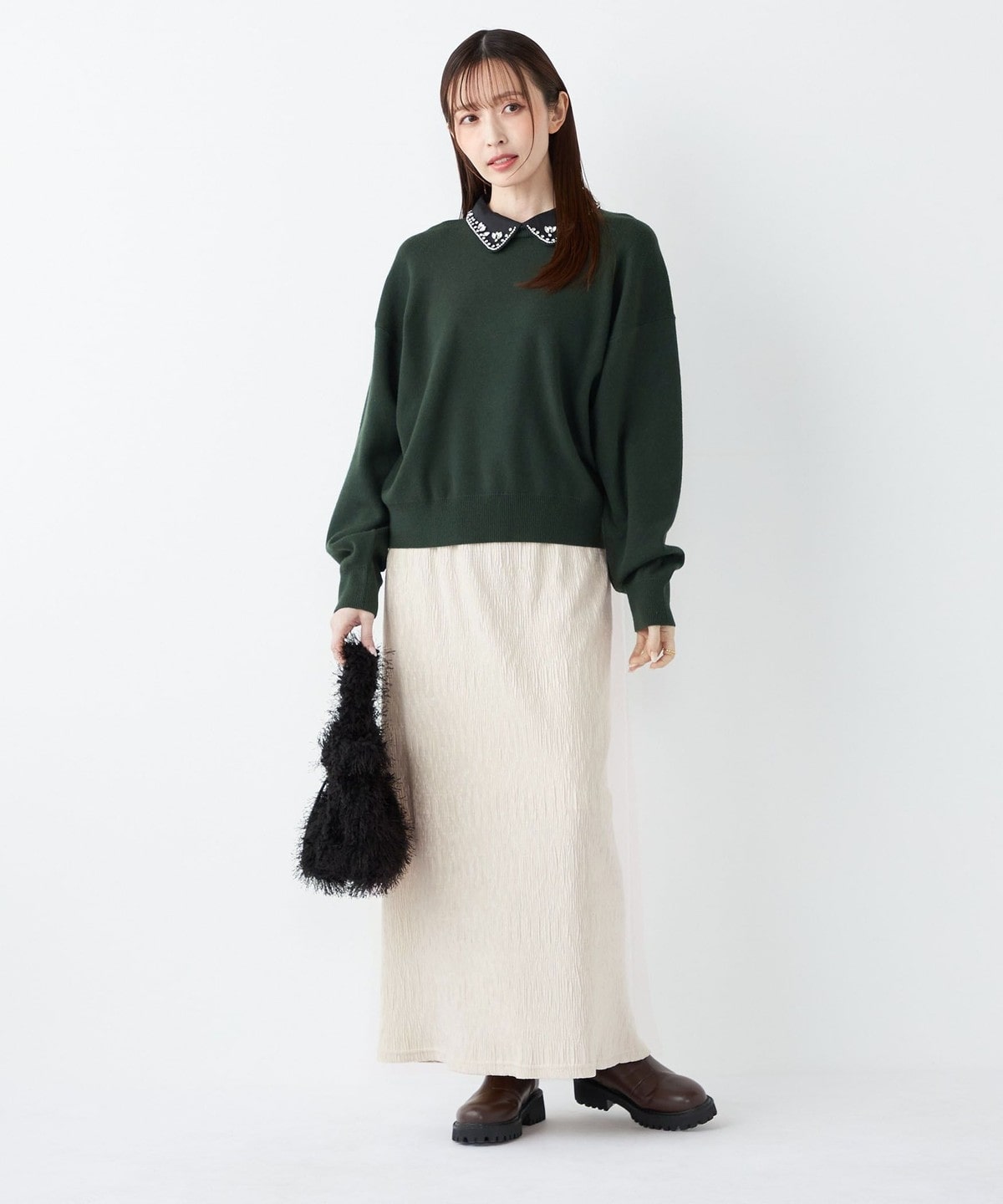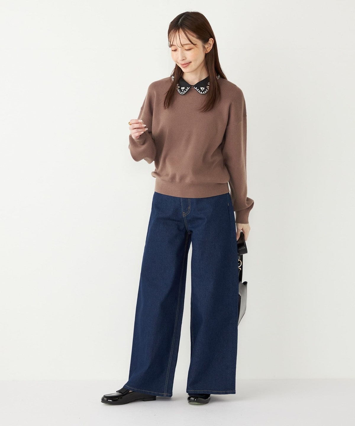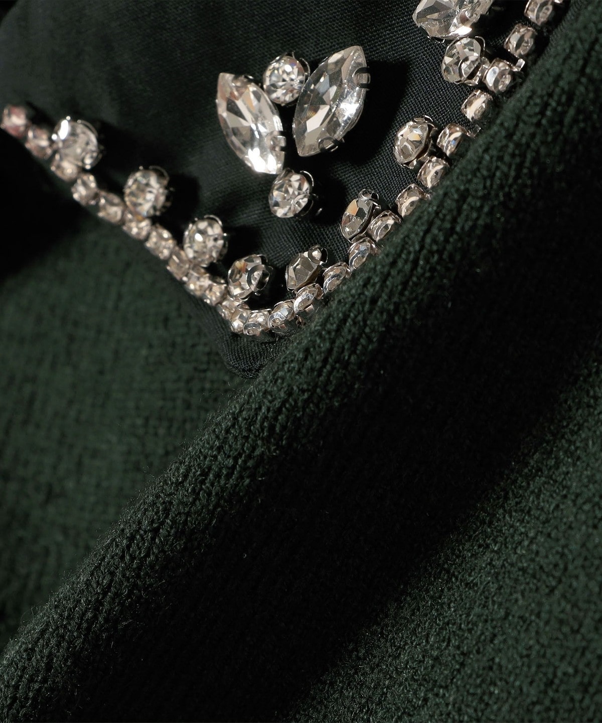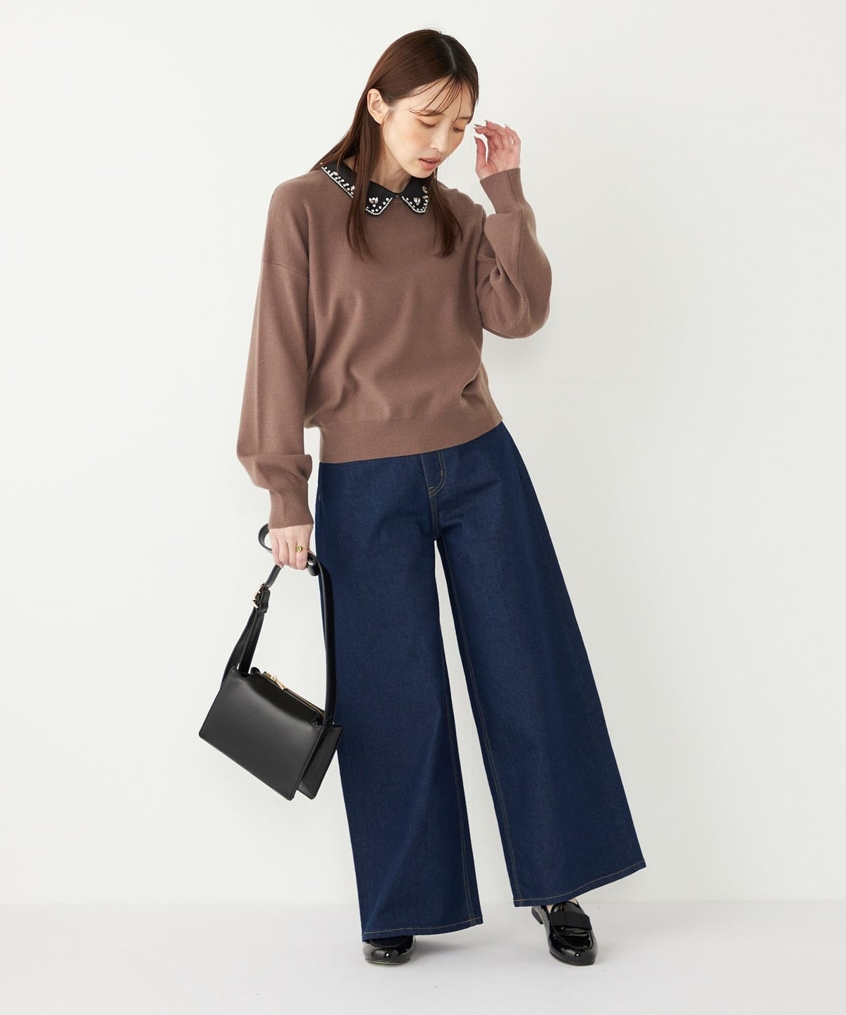 ベーシックながらも、襟元のビジューがアクセントになるニット。