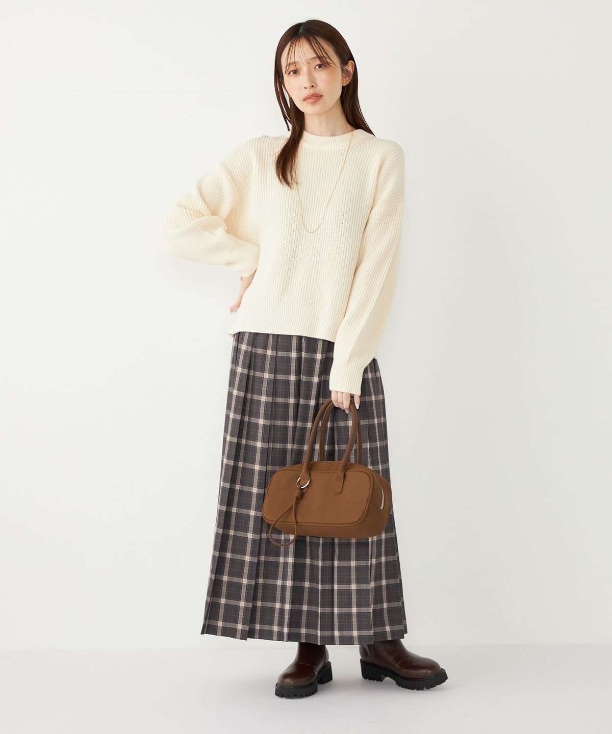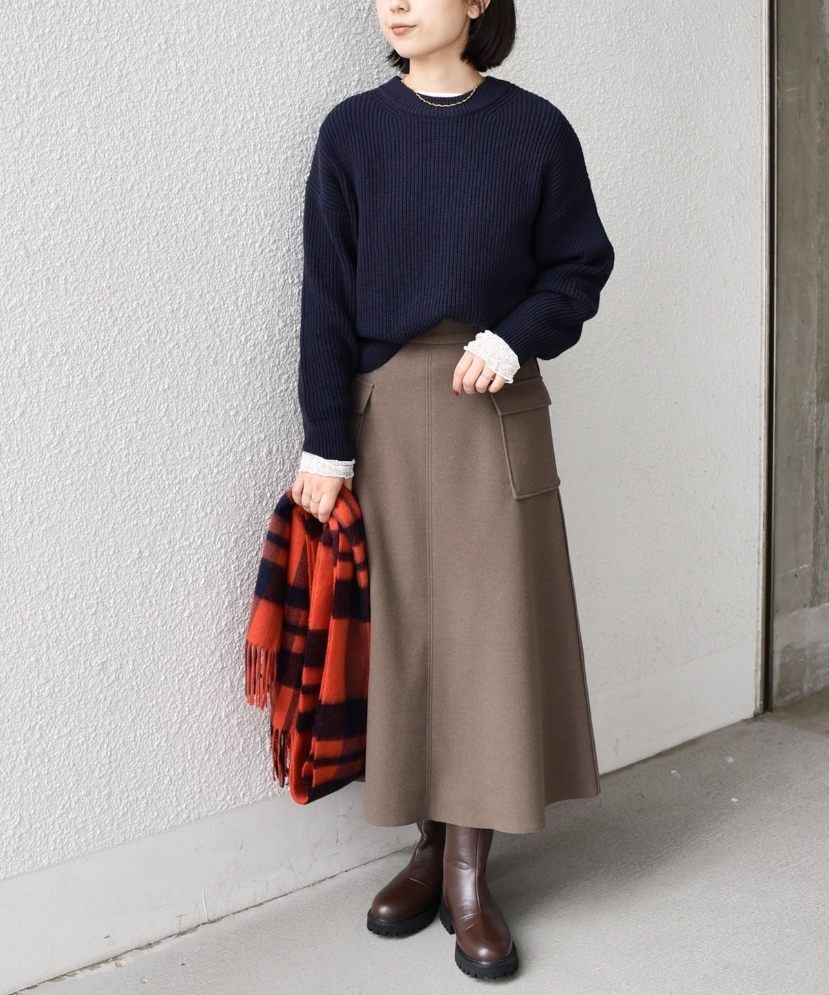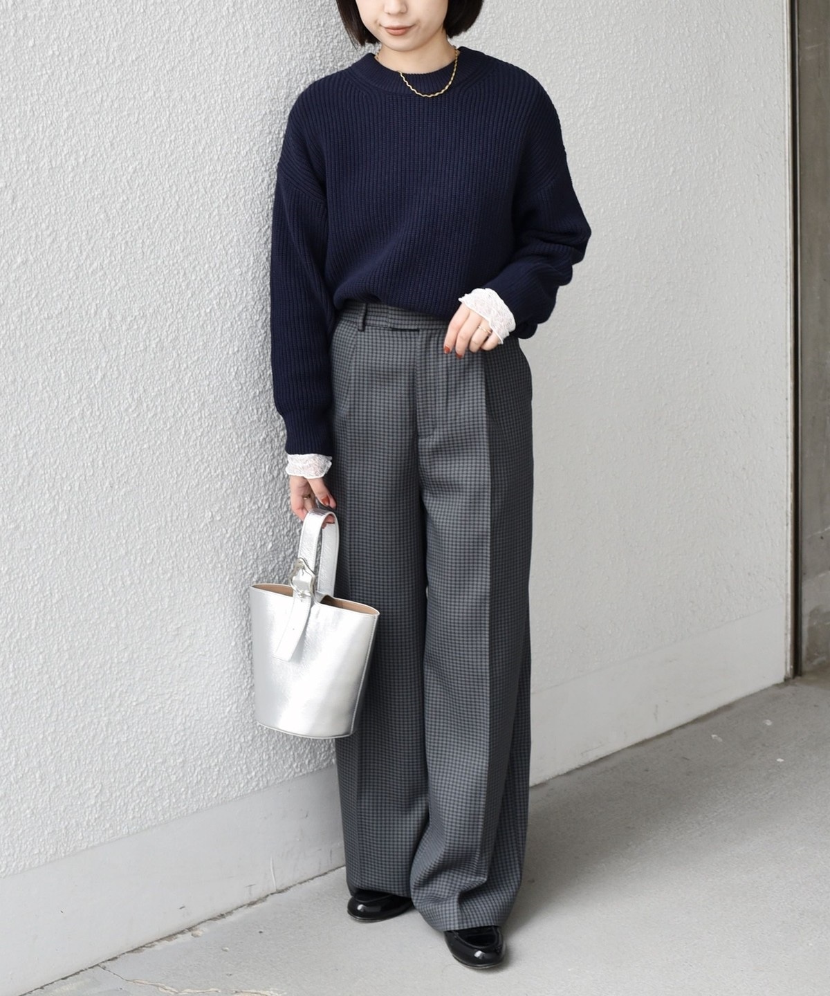 クルーネックなので、シャツをのぞかせたレイヤードスタイルもおすすめです。