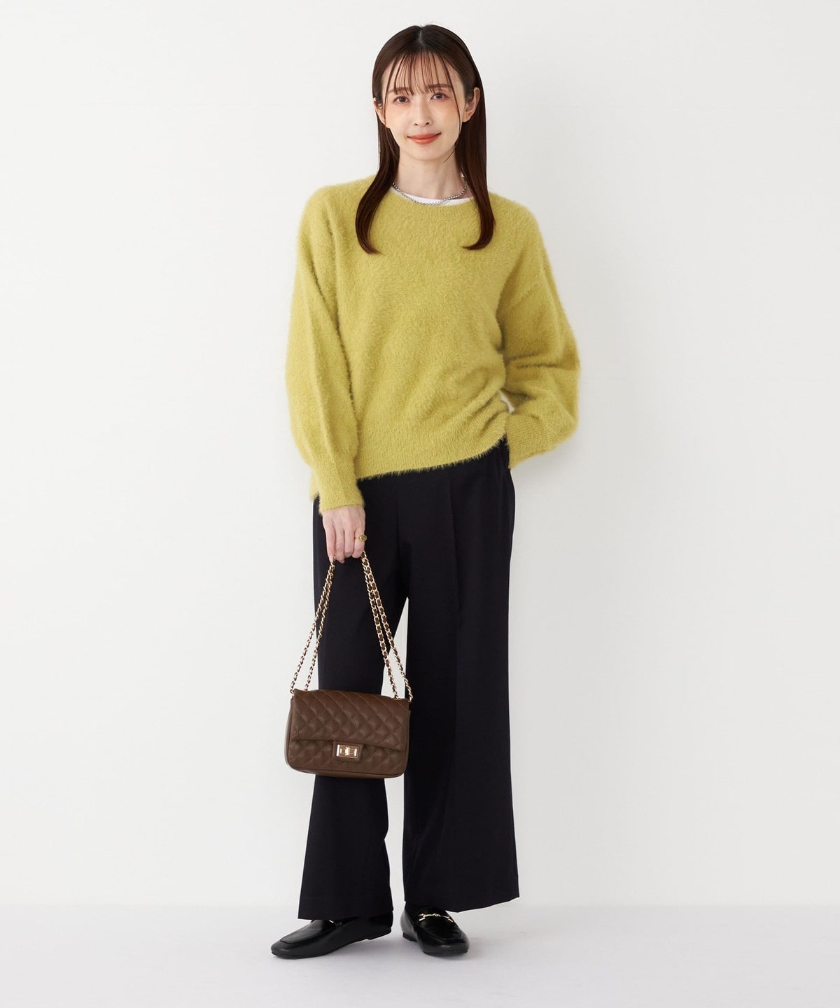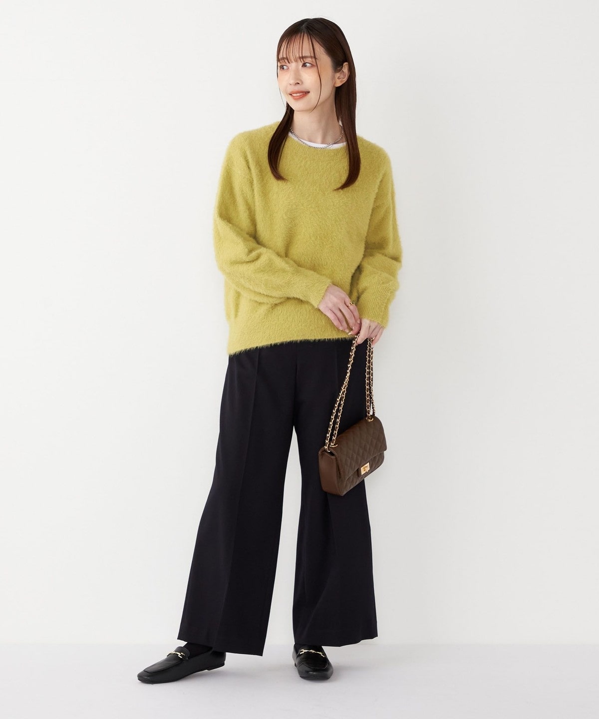 シンプルながら、やや広めに開いたクルーネックとふわふわの素材感が女性らしさを引き立ててくれます。