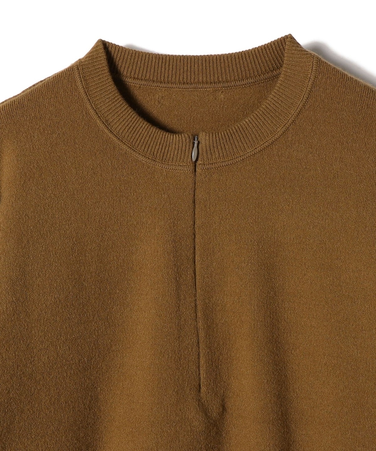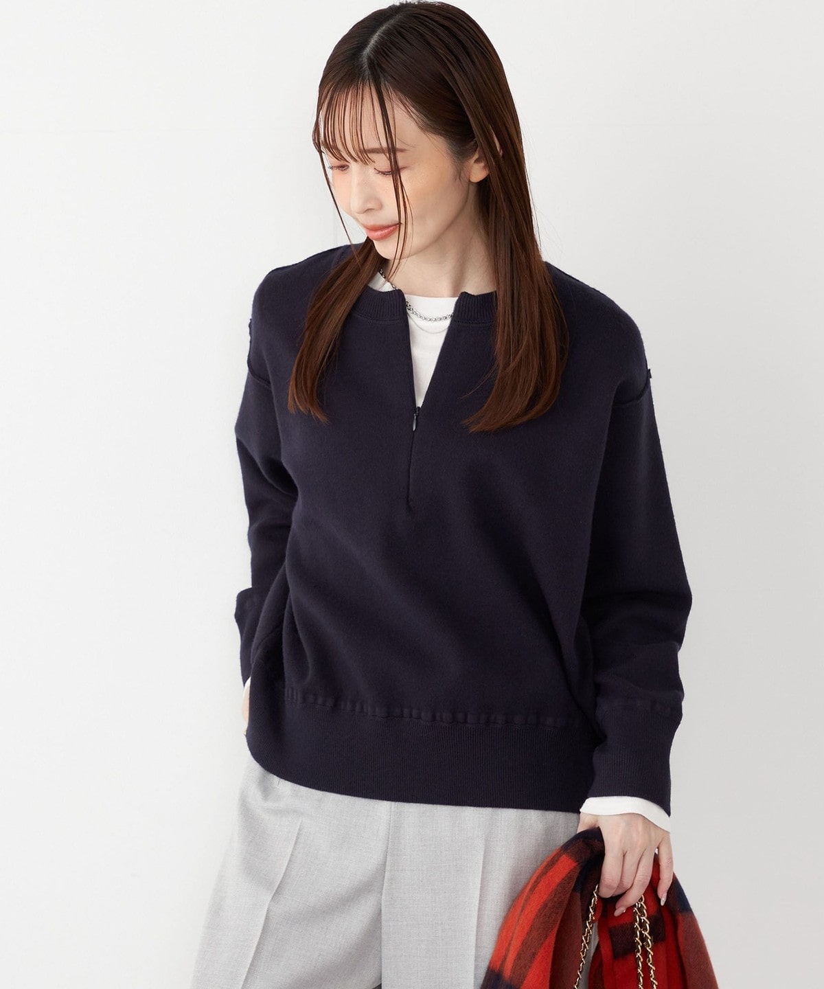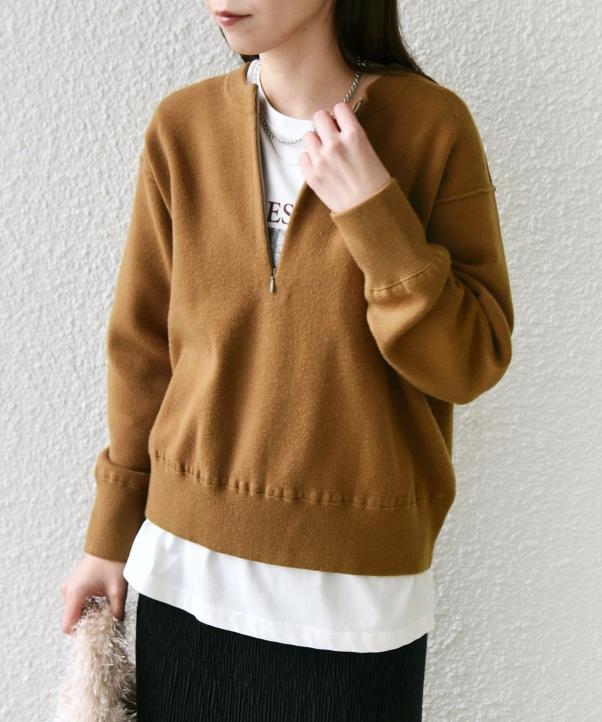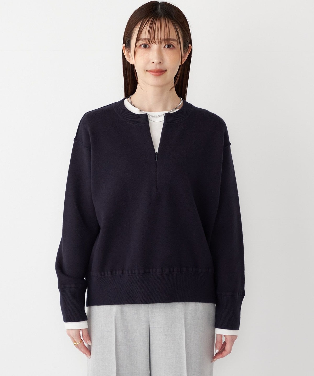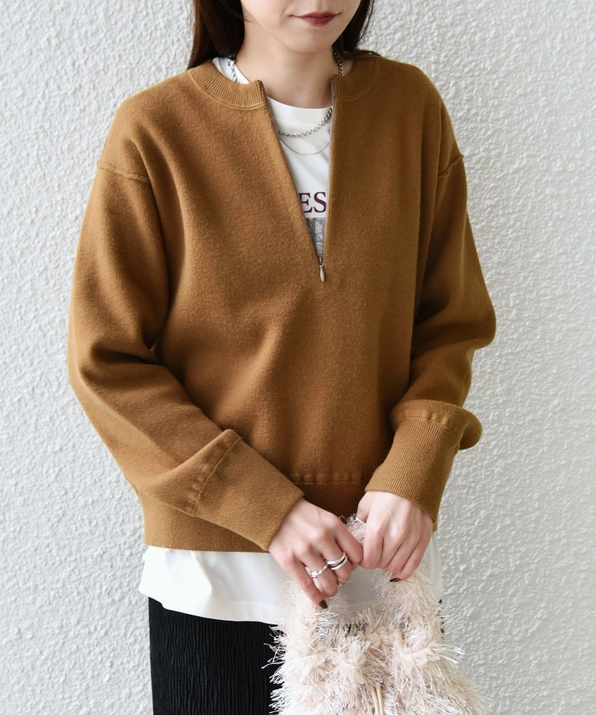 ジップを上まで閉じるとすっきりとしたクルーネックに、少し開けると抜け感のあるこなれた印象に。