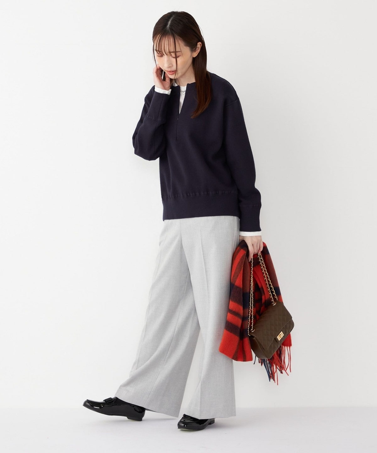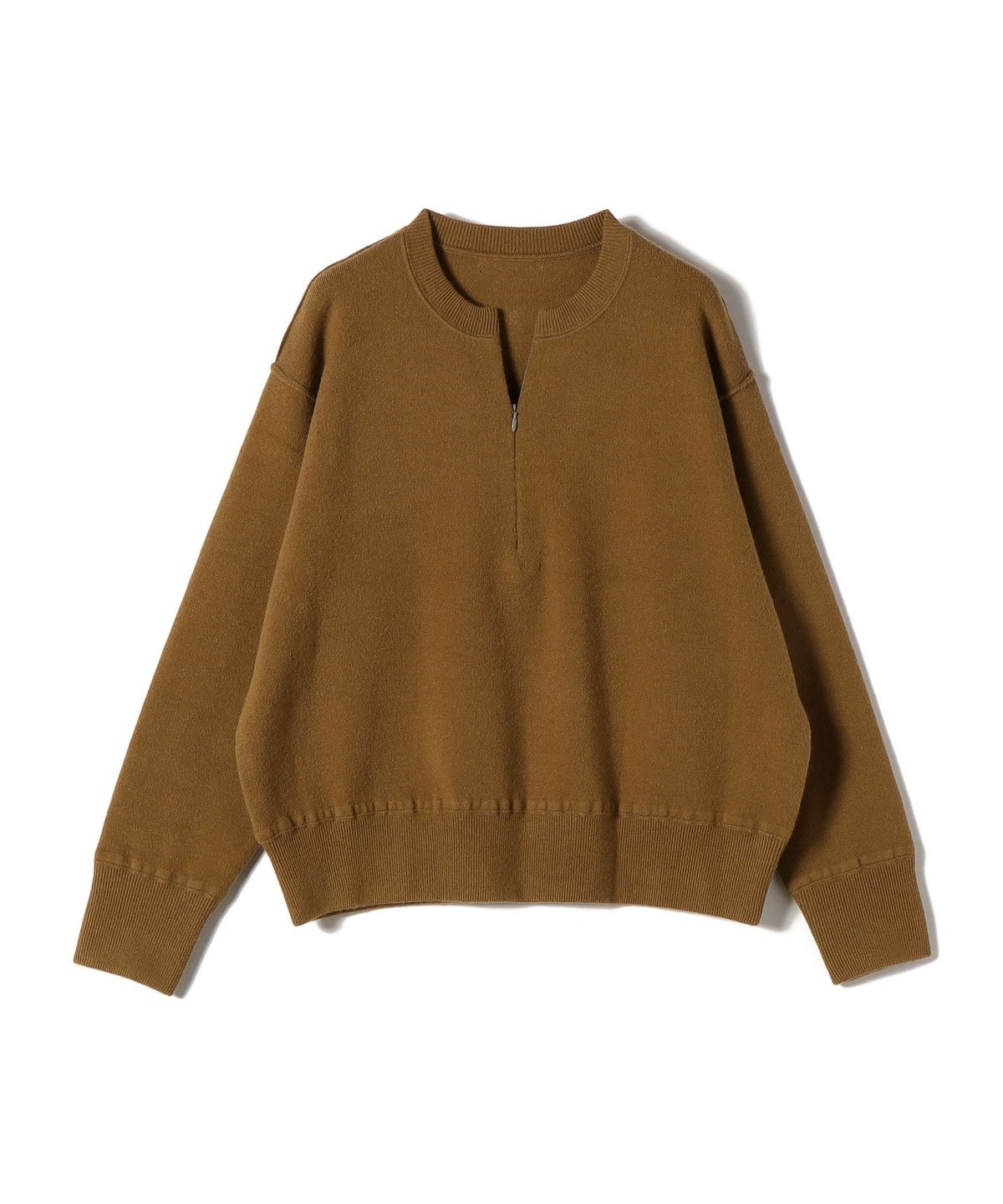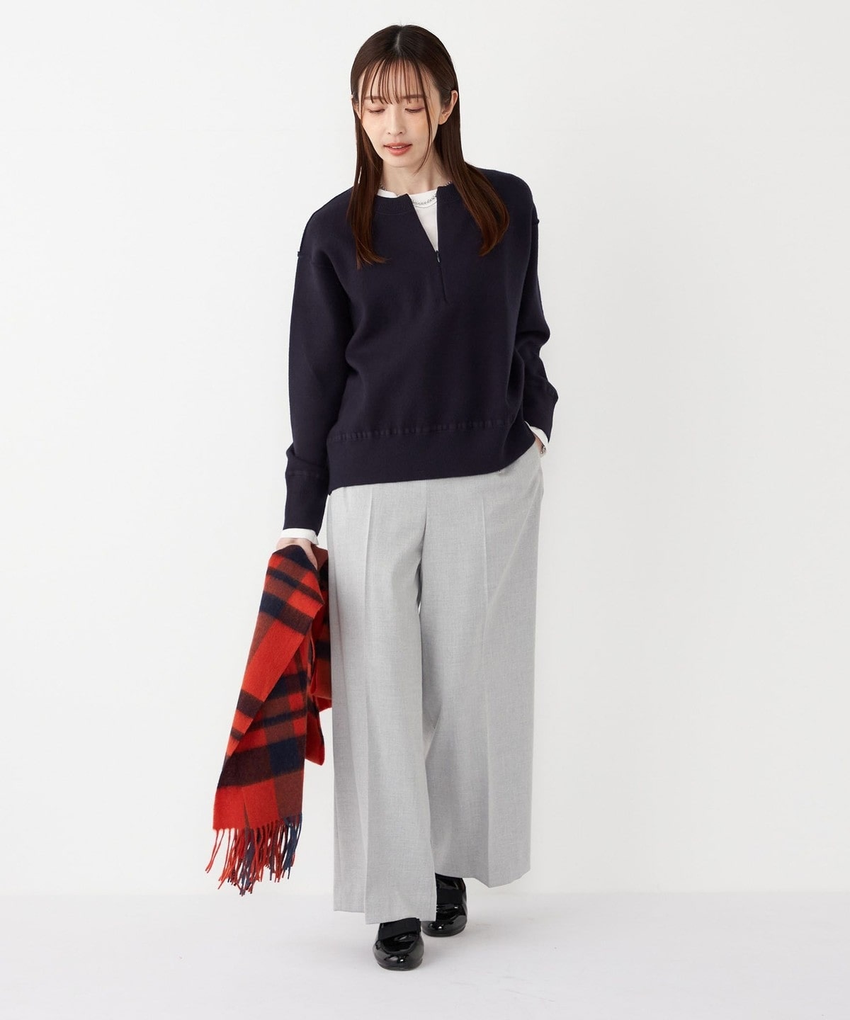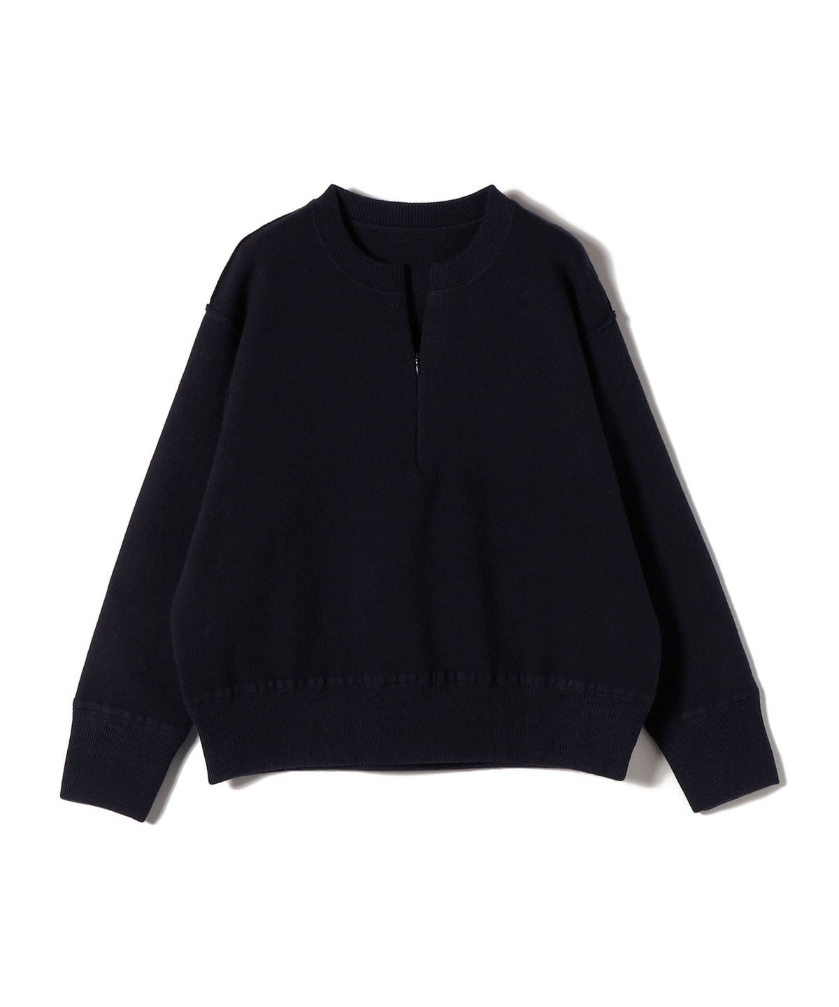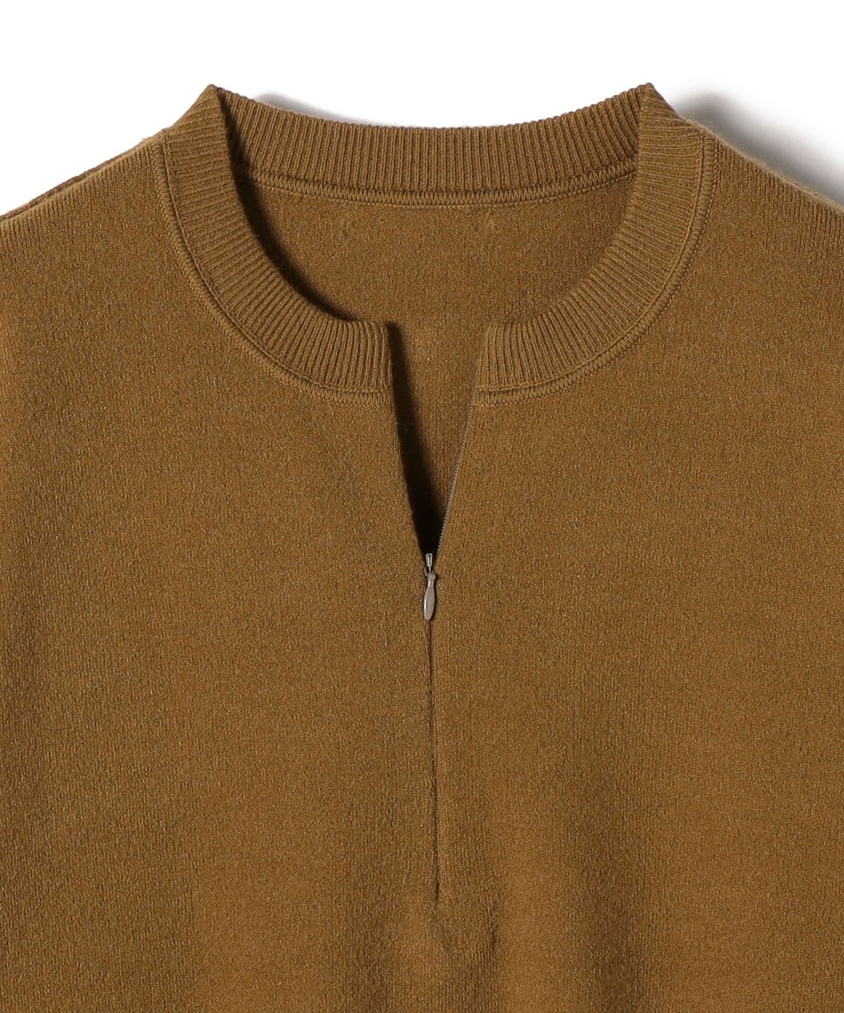 ジップを上まで閉じるとすっきりとしたクルーネックに、少し開けると抜け感のあるこなれた印象に。