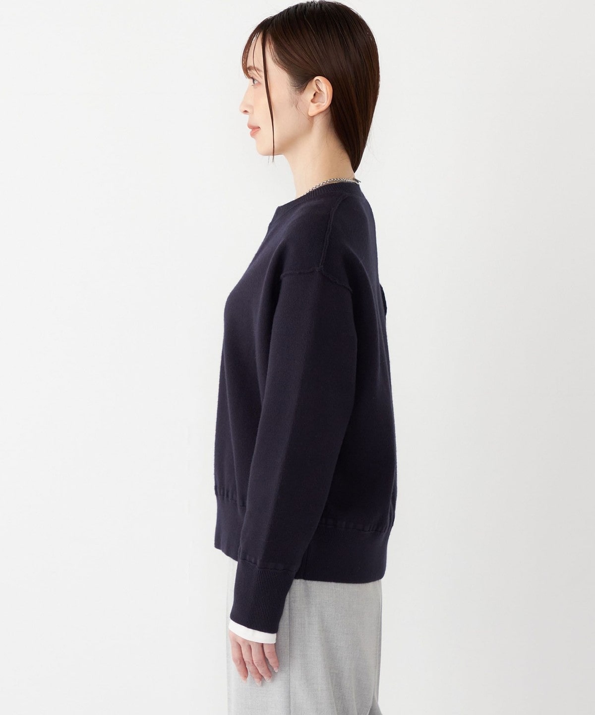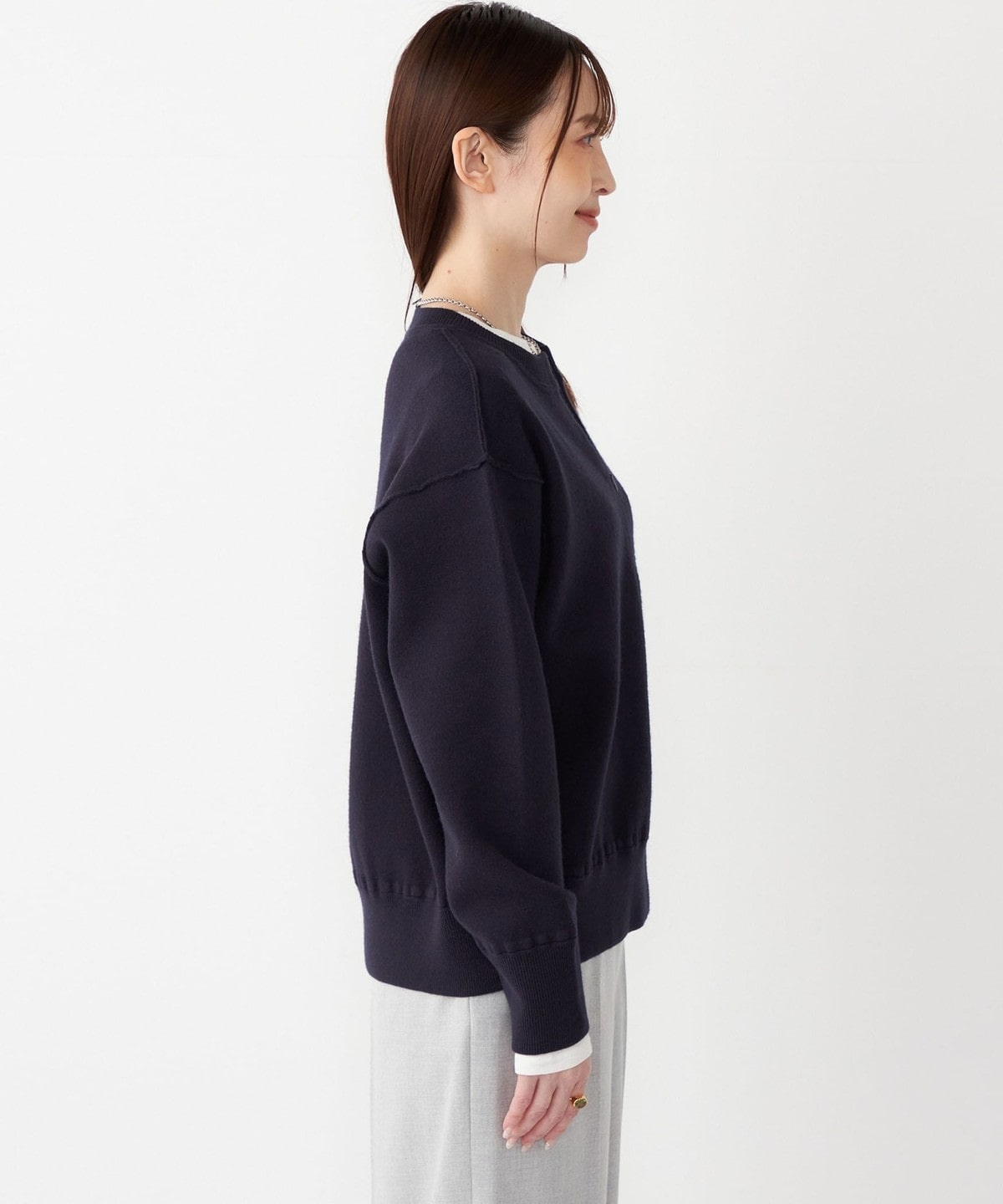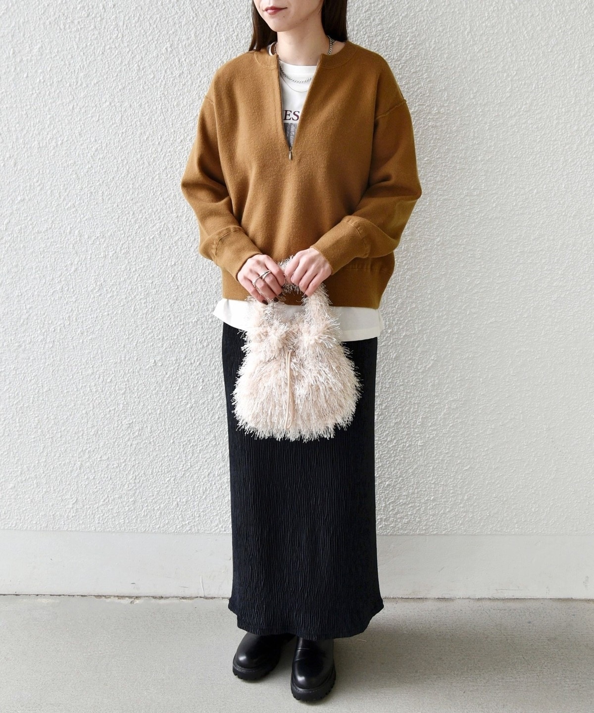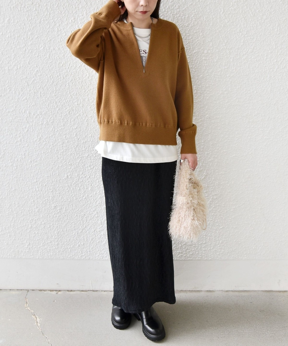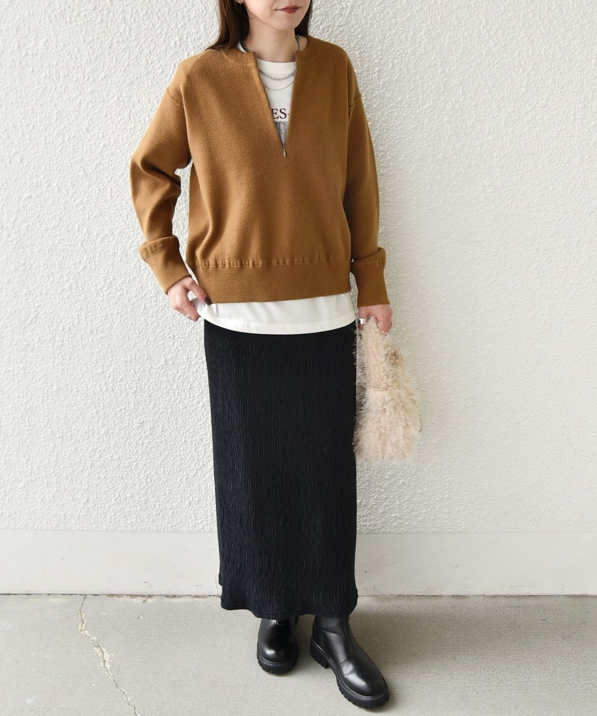 ジップを上まで閉じるとすっきりとしたクルーネックに、少し開けると抜け感のあるこなれた印象に。