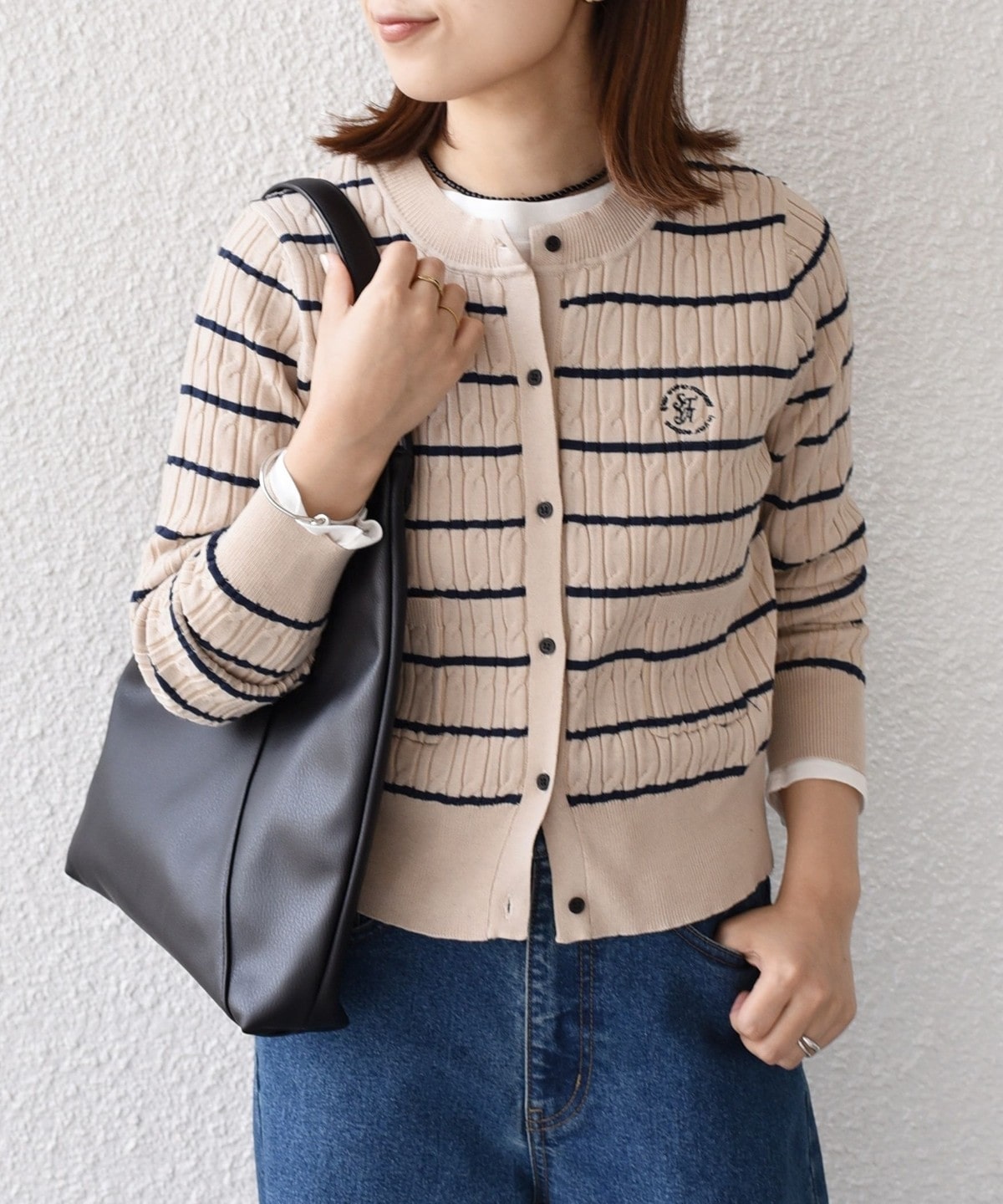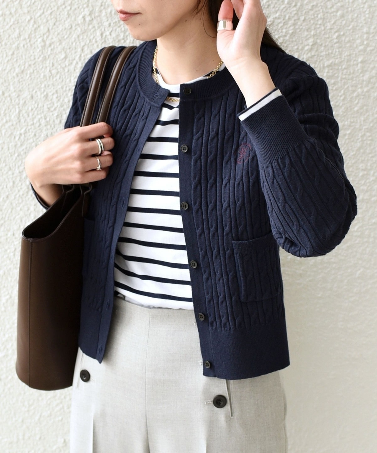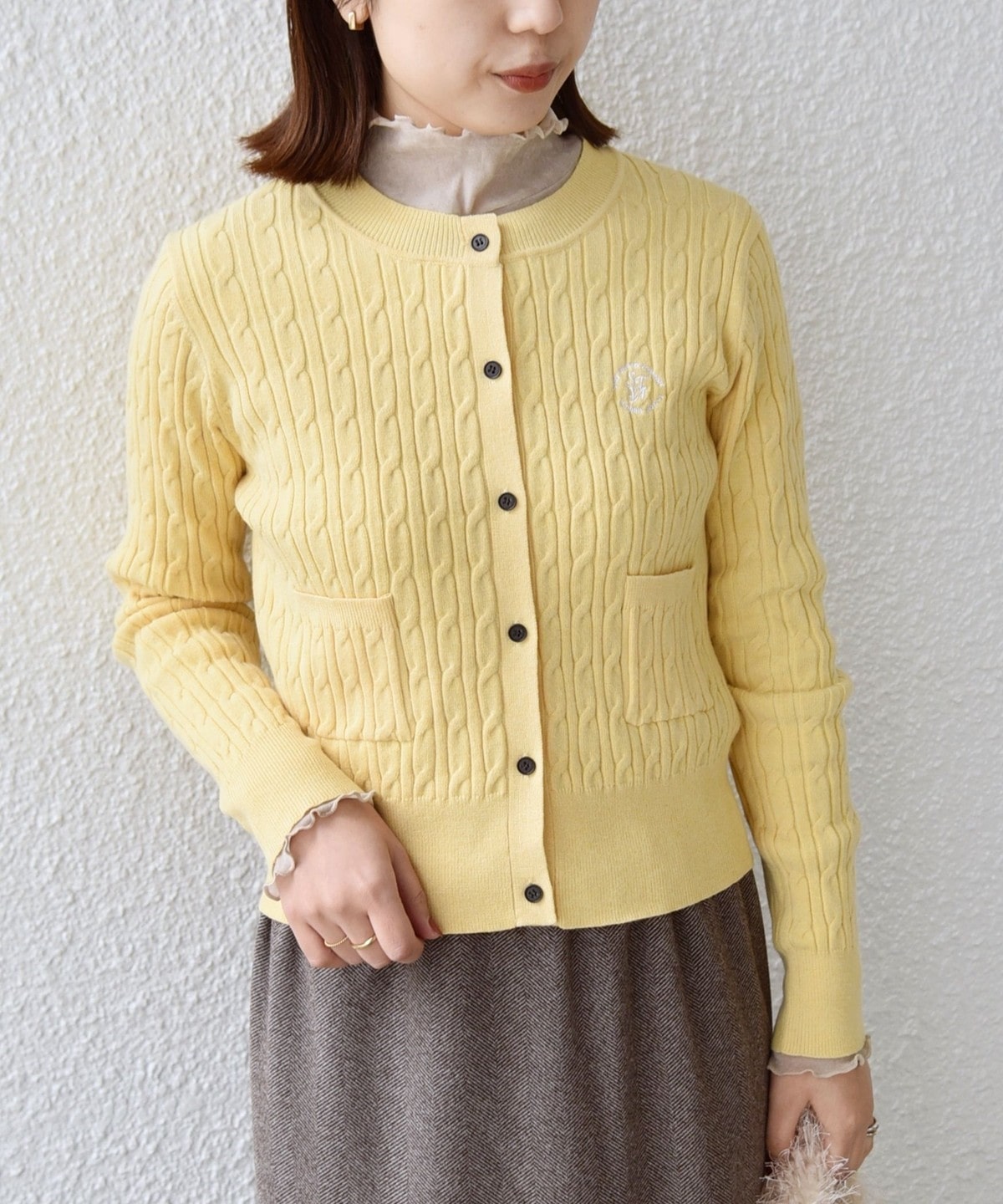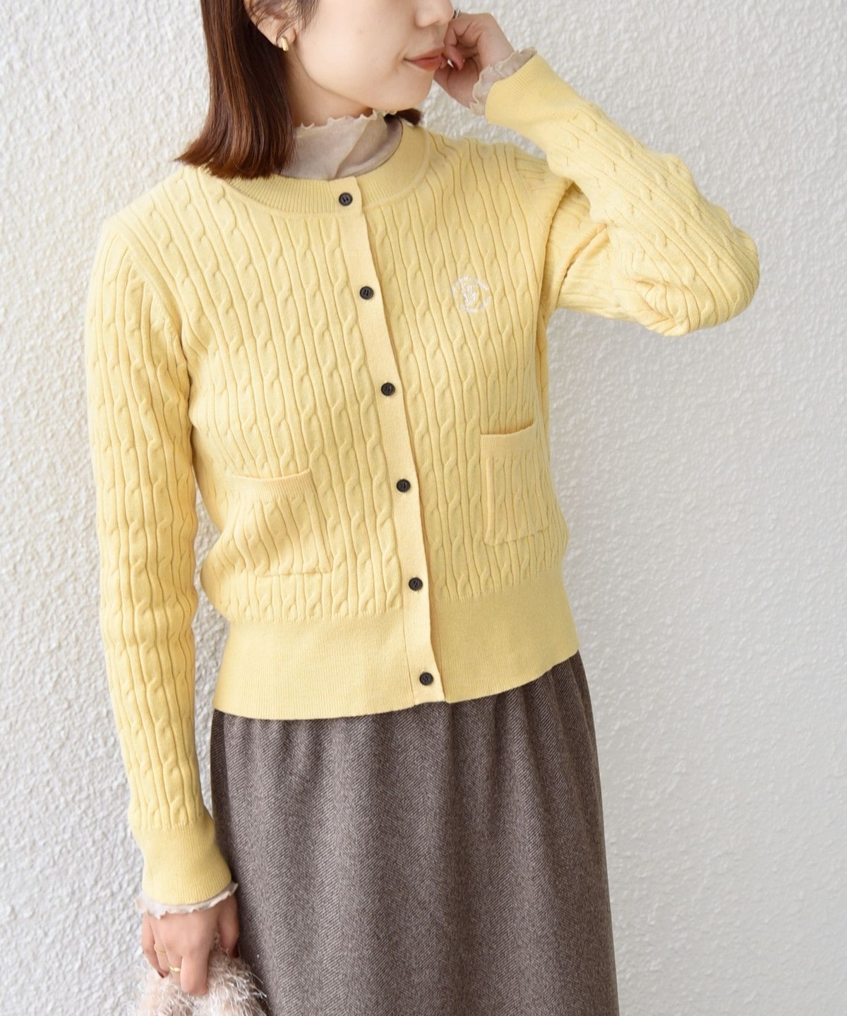 ミニケーブル編みと胸元の刺繍ロゴがさりげないアクセントに。