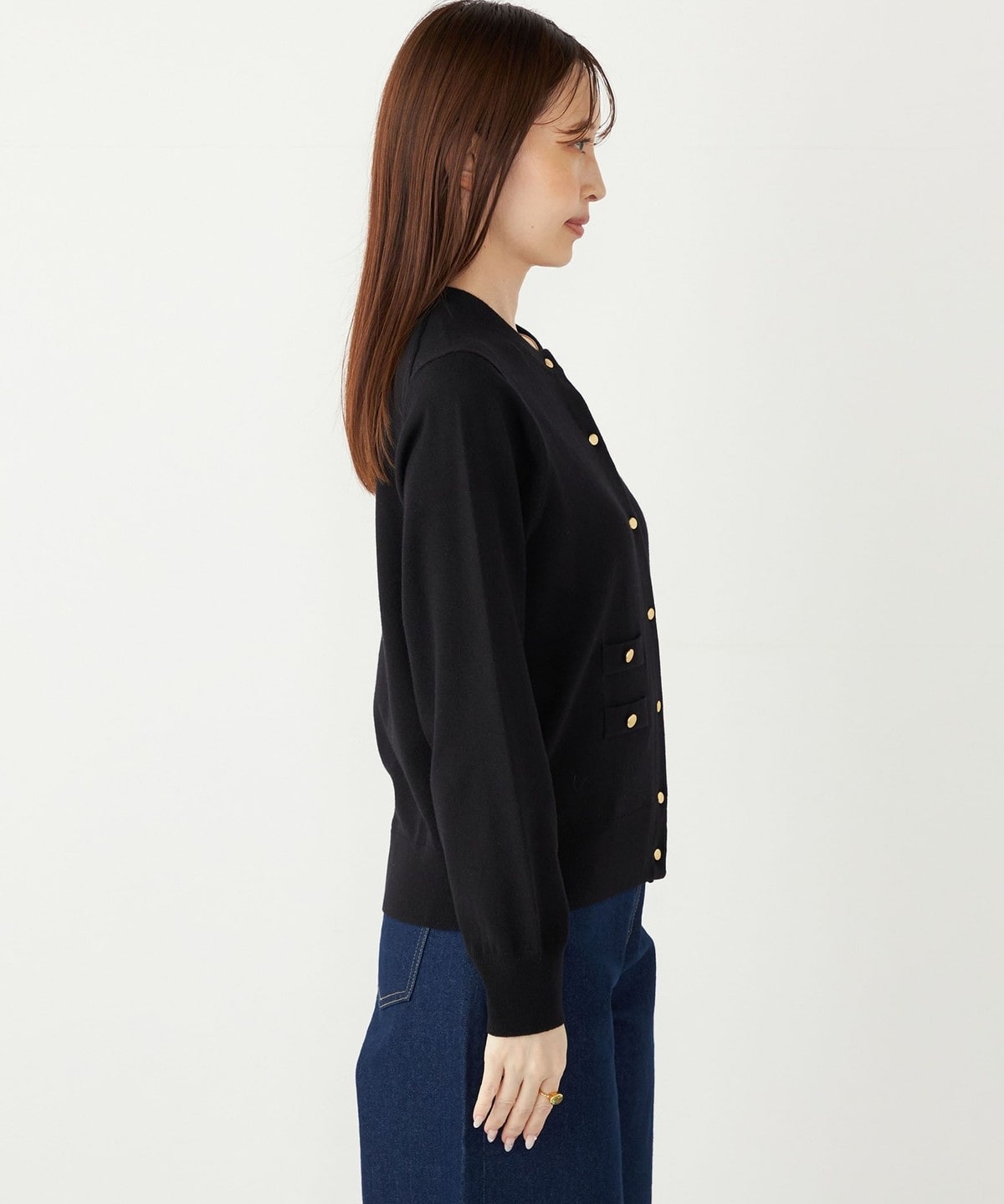 ゴールドカラーのボタンがアクセントになる上品な印象のカーディガン。