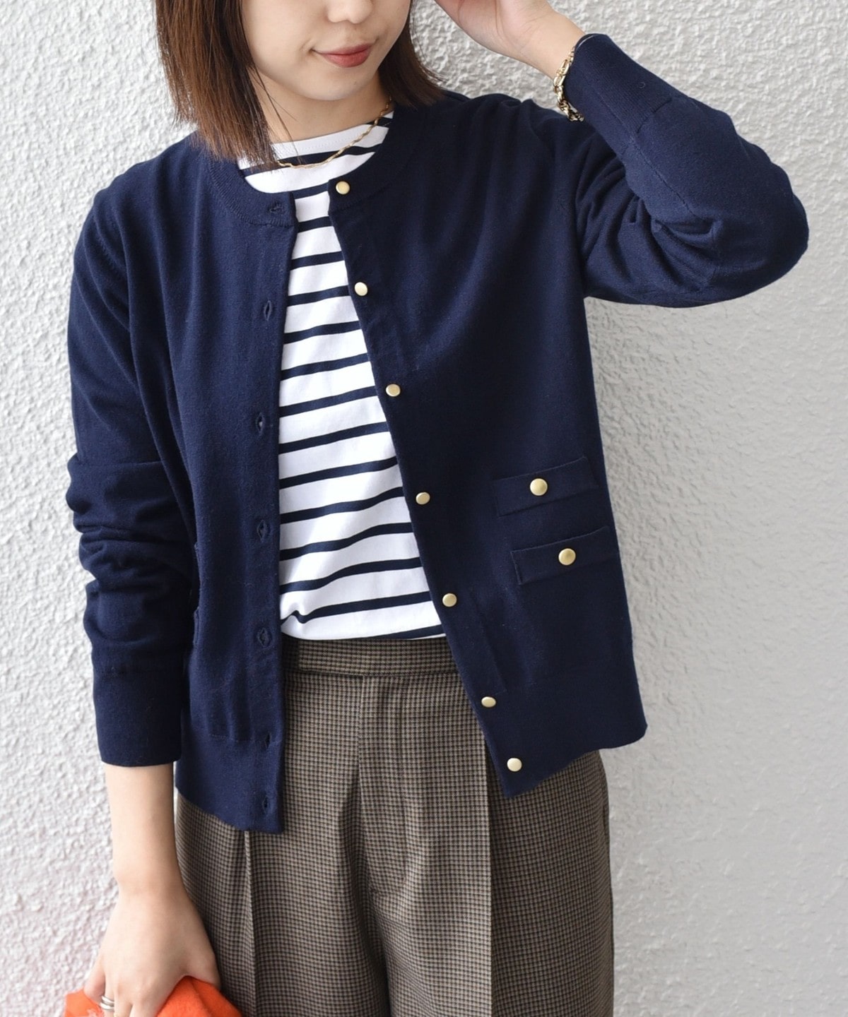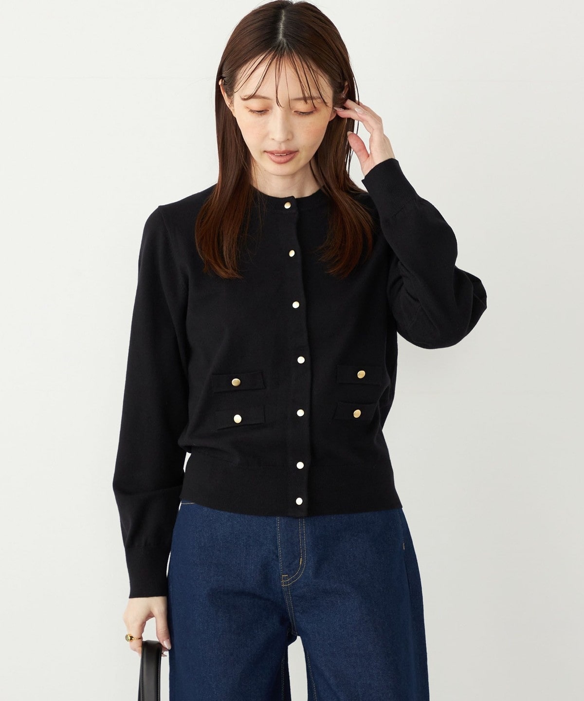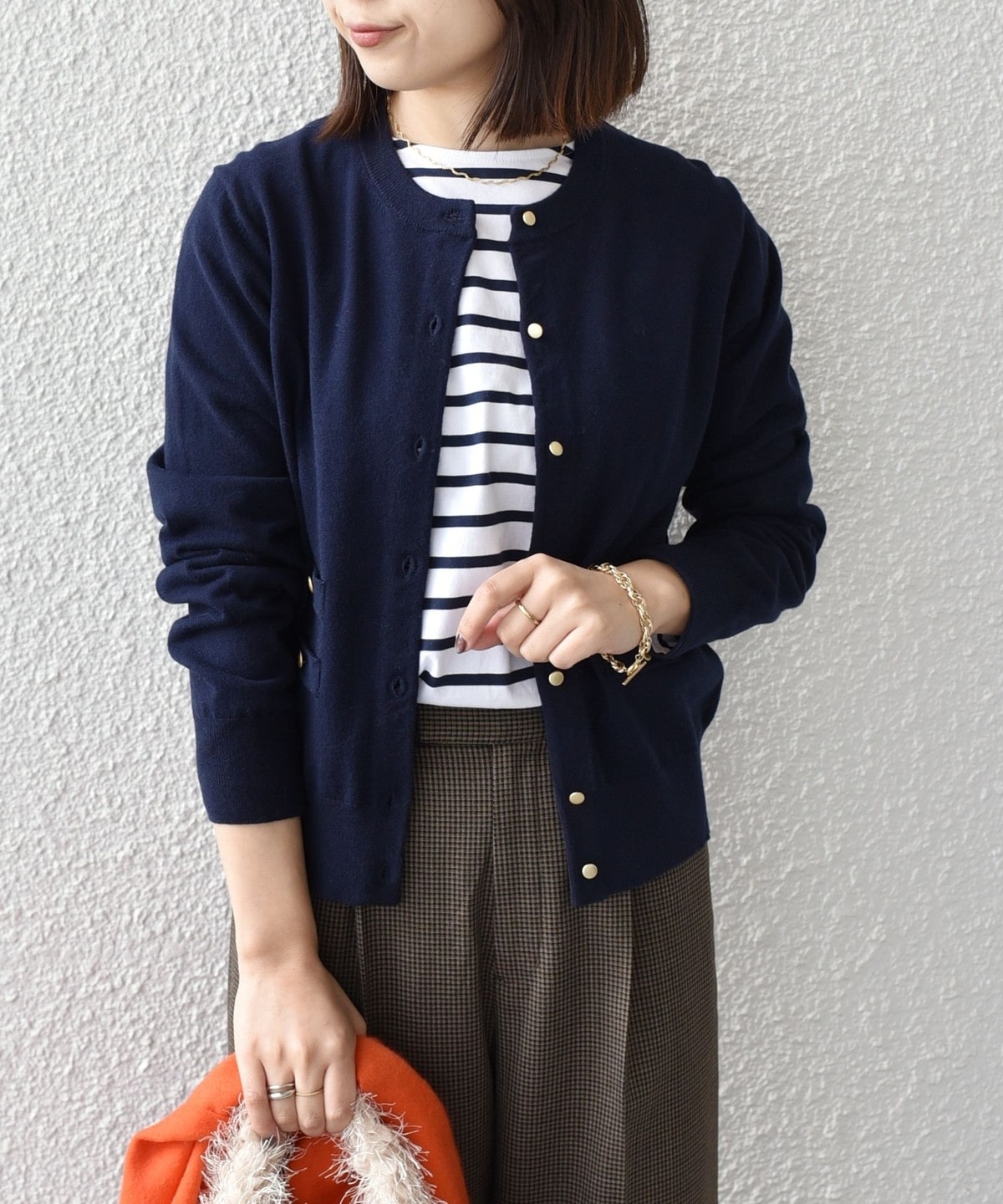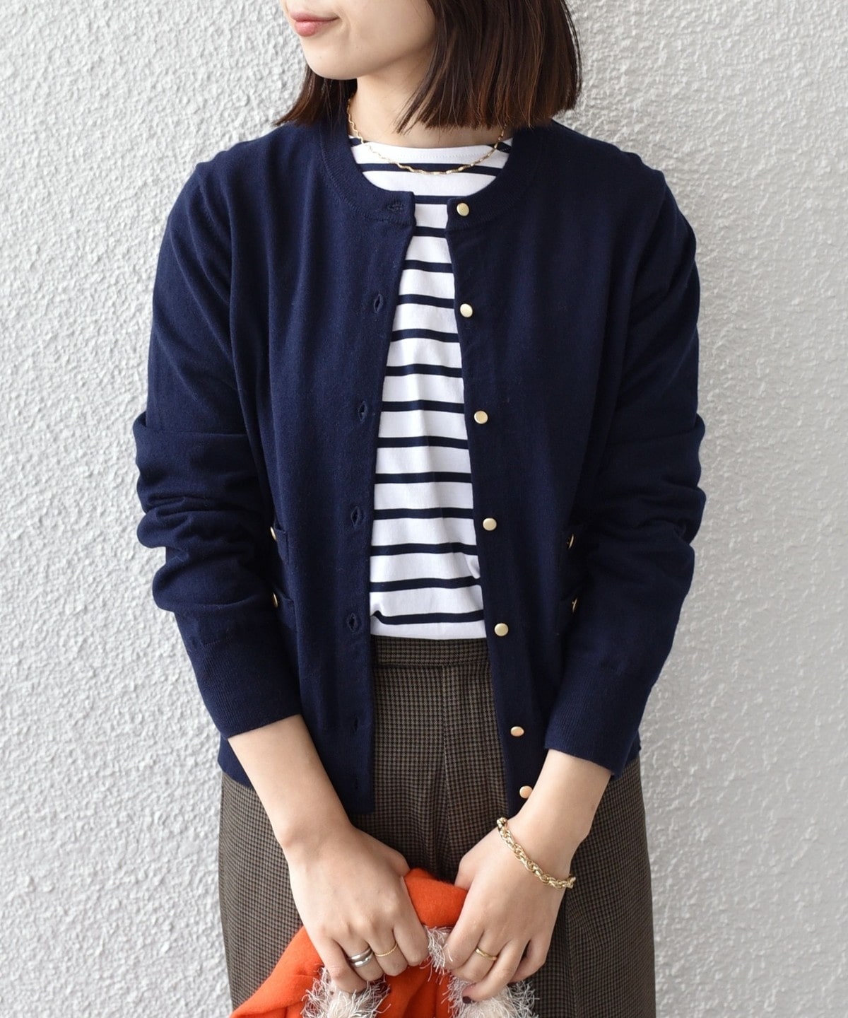 ゴールドカラーのボタンが目を惹く、着回し力の高いハイゲージカーディガン。