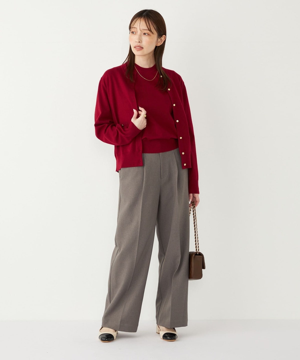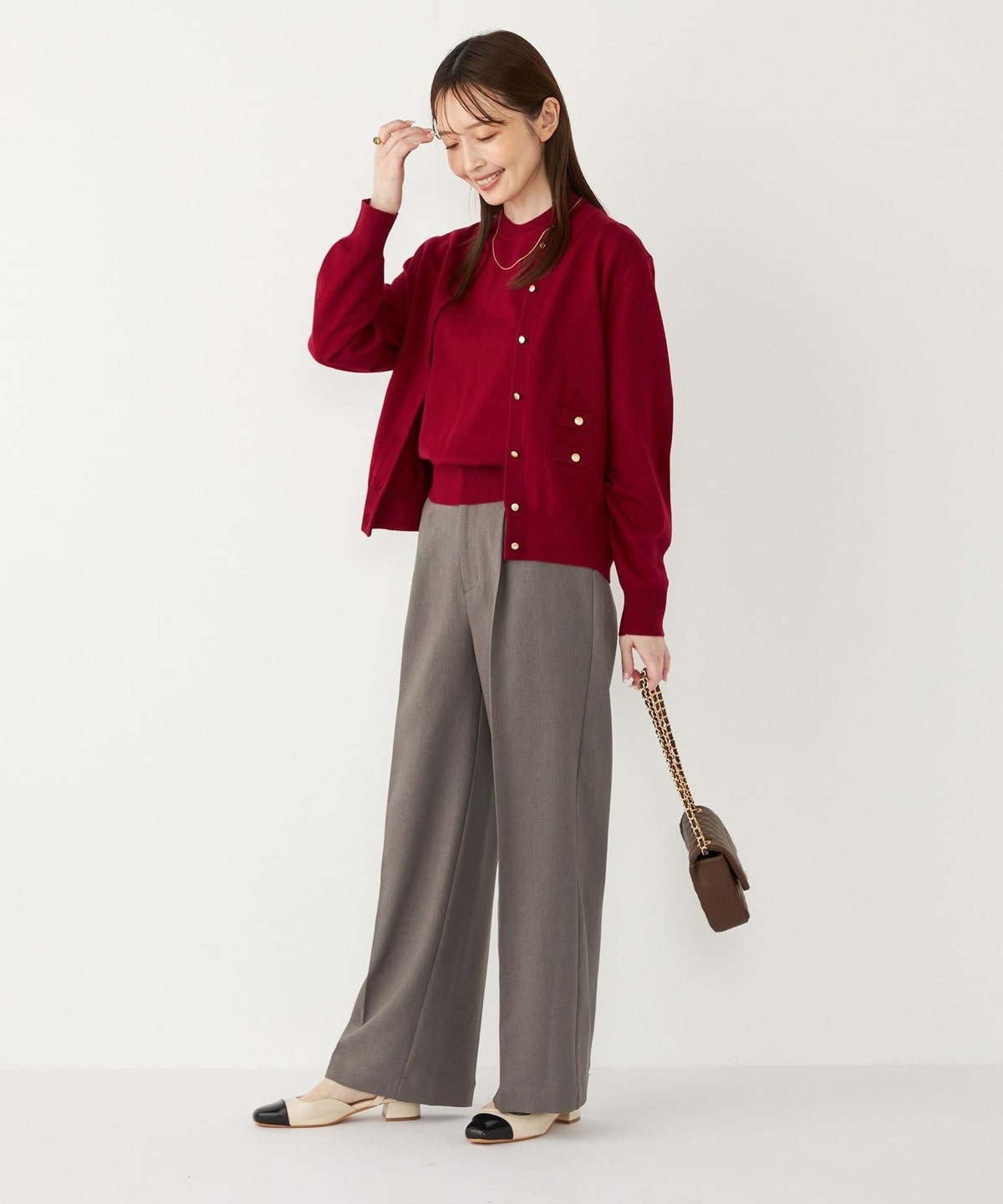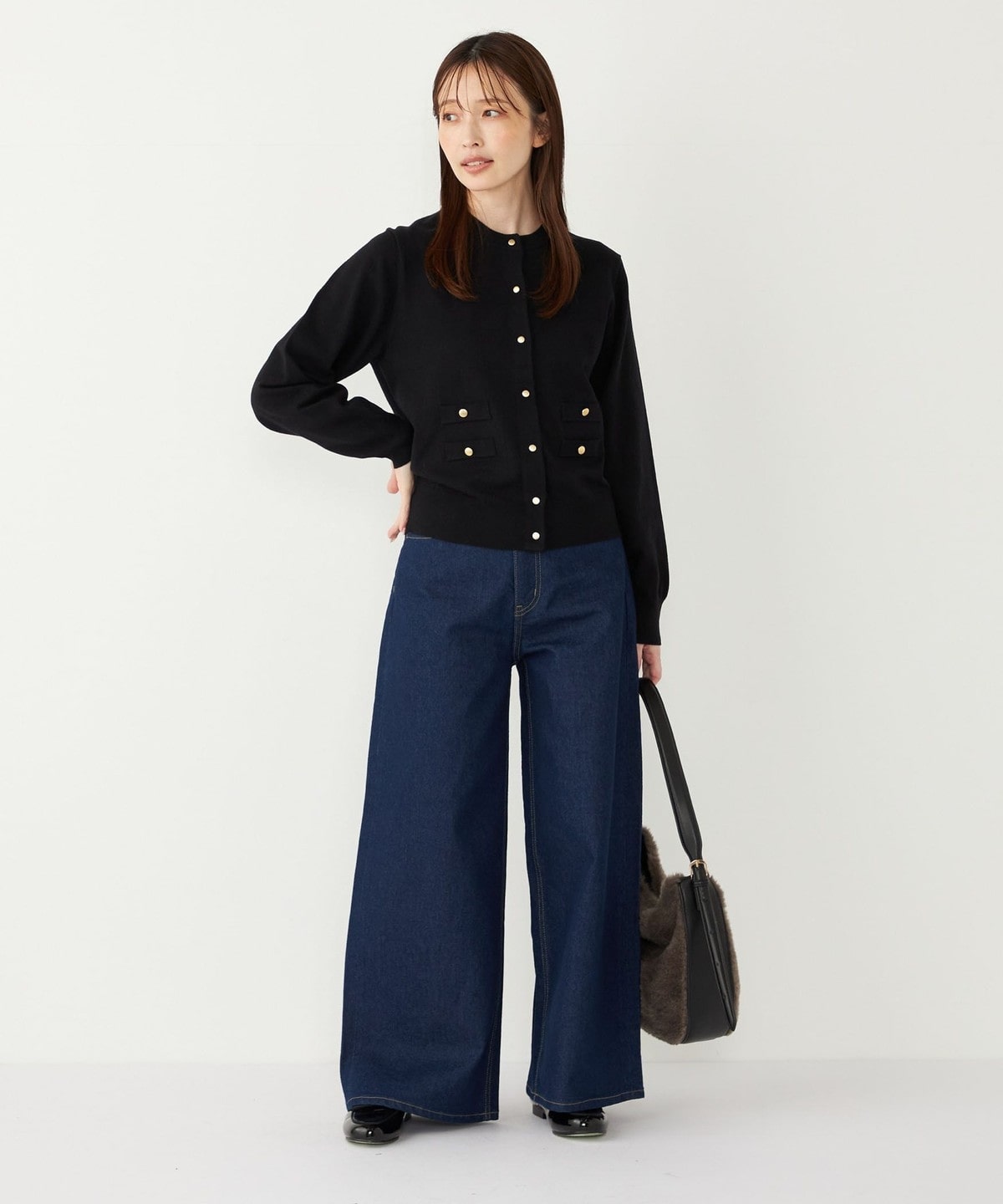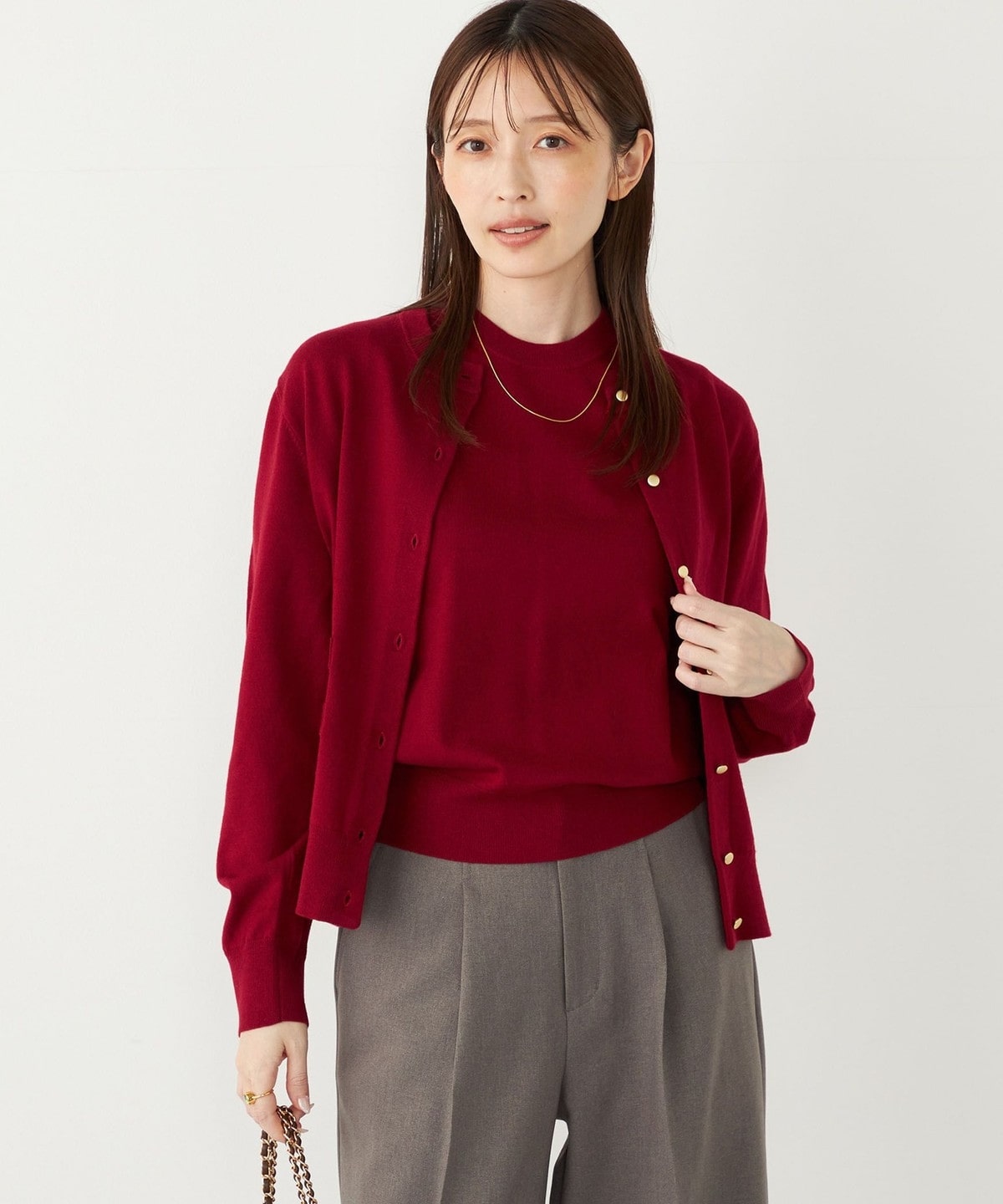 ゴールドカラーのボタンが目を惹く、着回し力の高いハイゲージカーディガン。