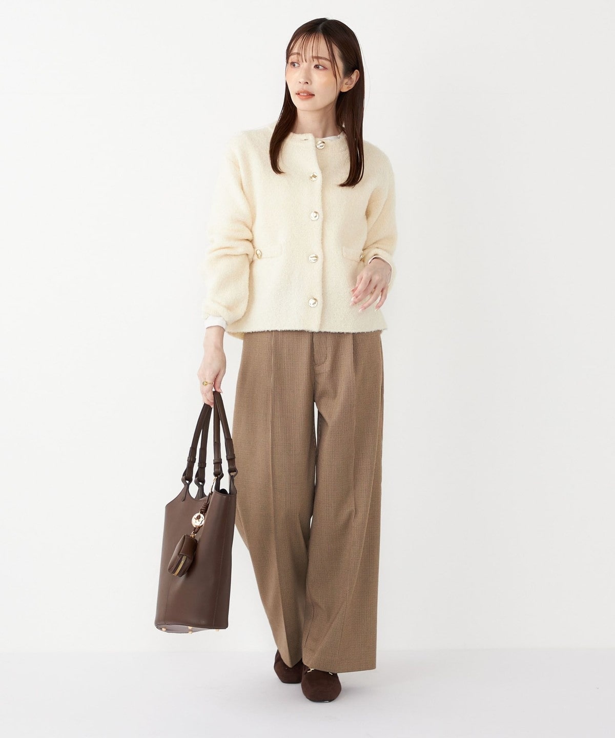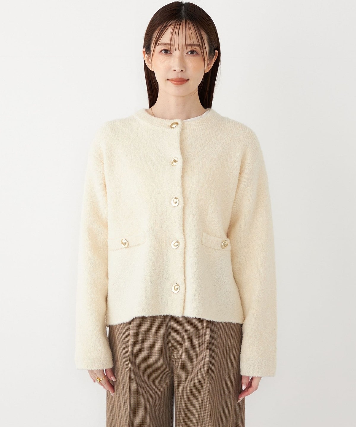 ゴールドカラーのボタンがアクセントになり、洗練された印象を与えてくれるニットジャケット。