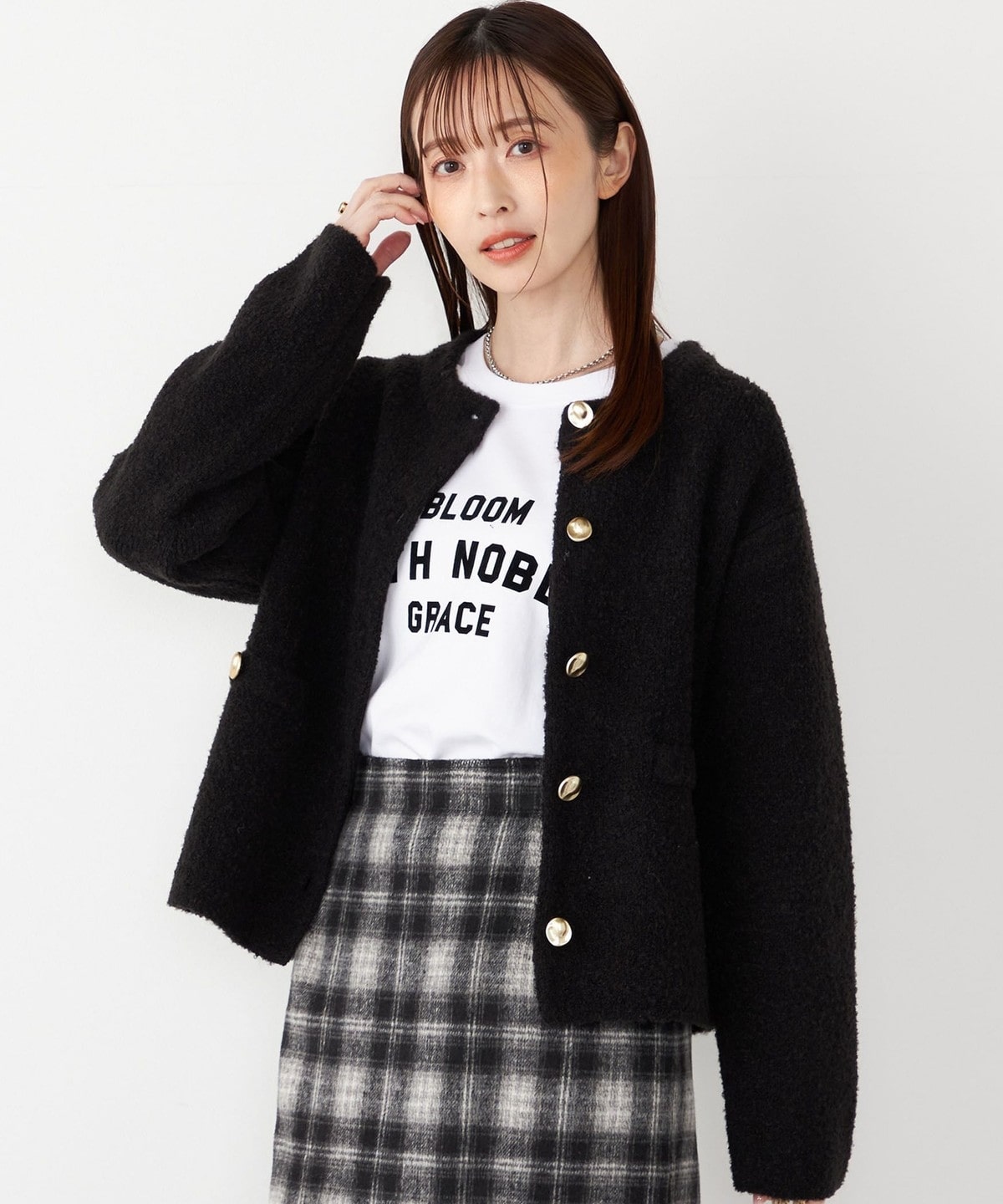 ボタンを開けて羽織としても、留めて一枚着トップスとしても着用可能。