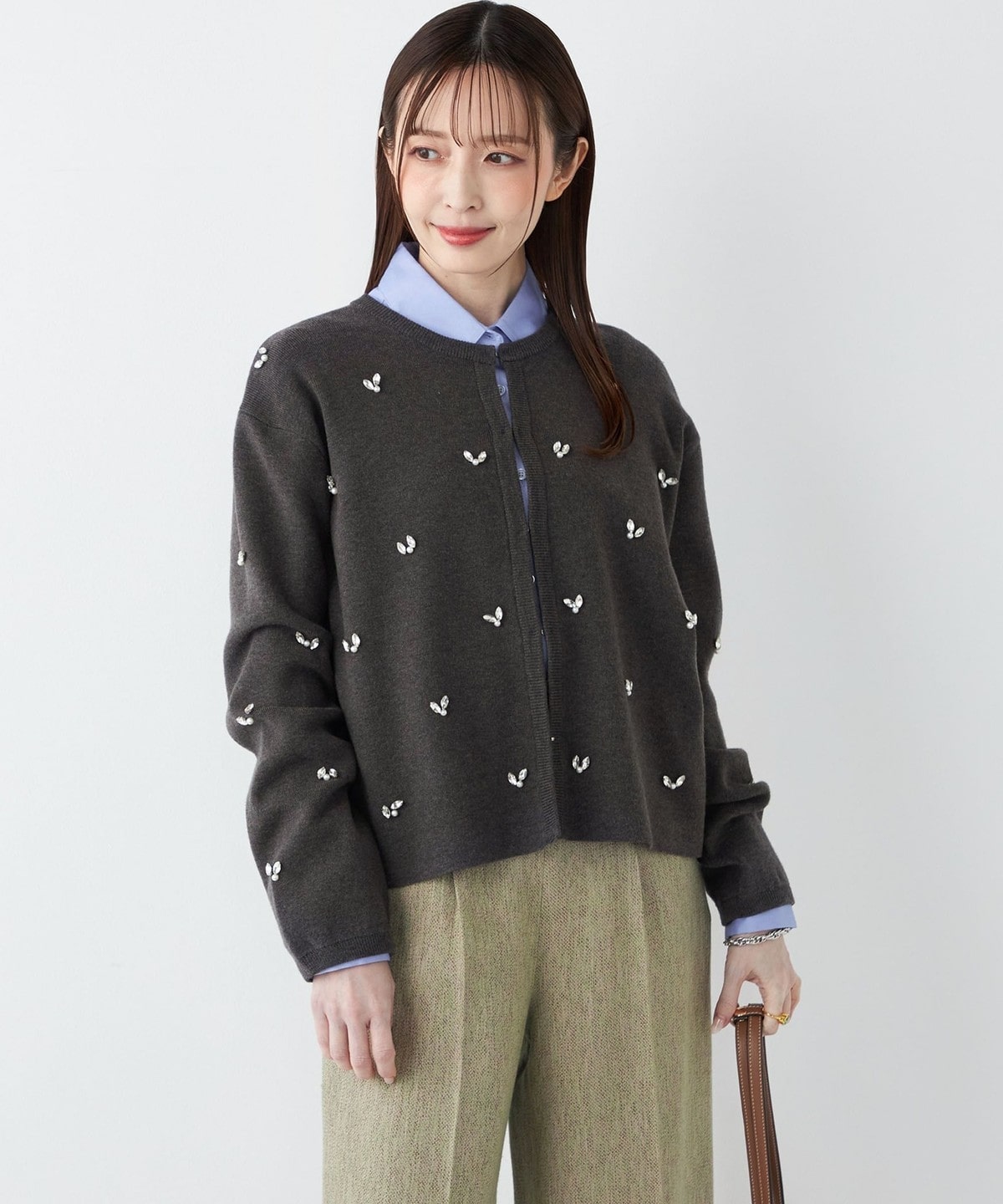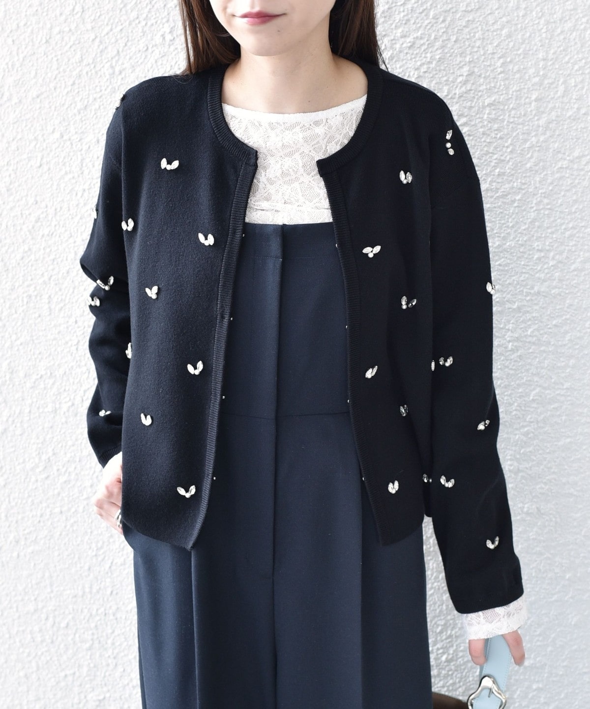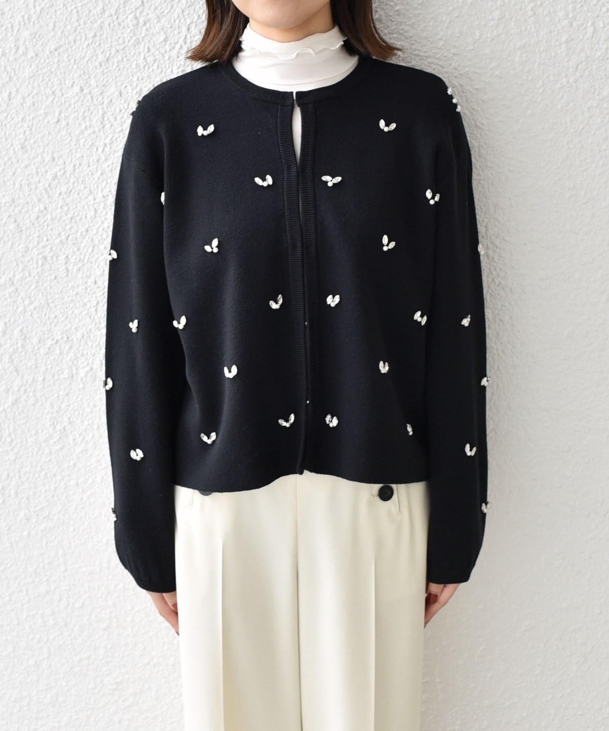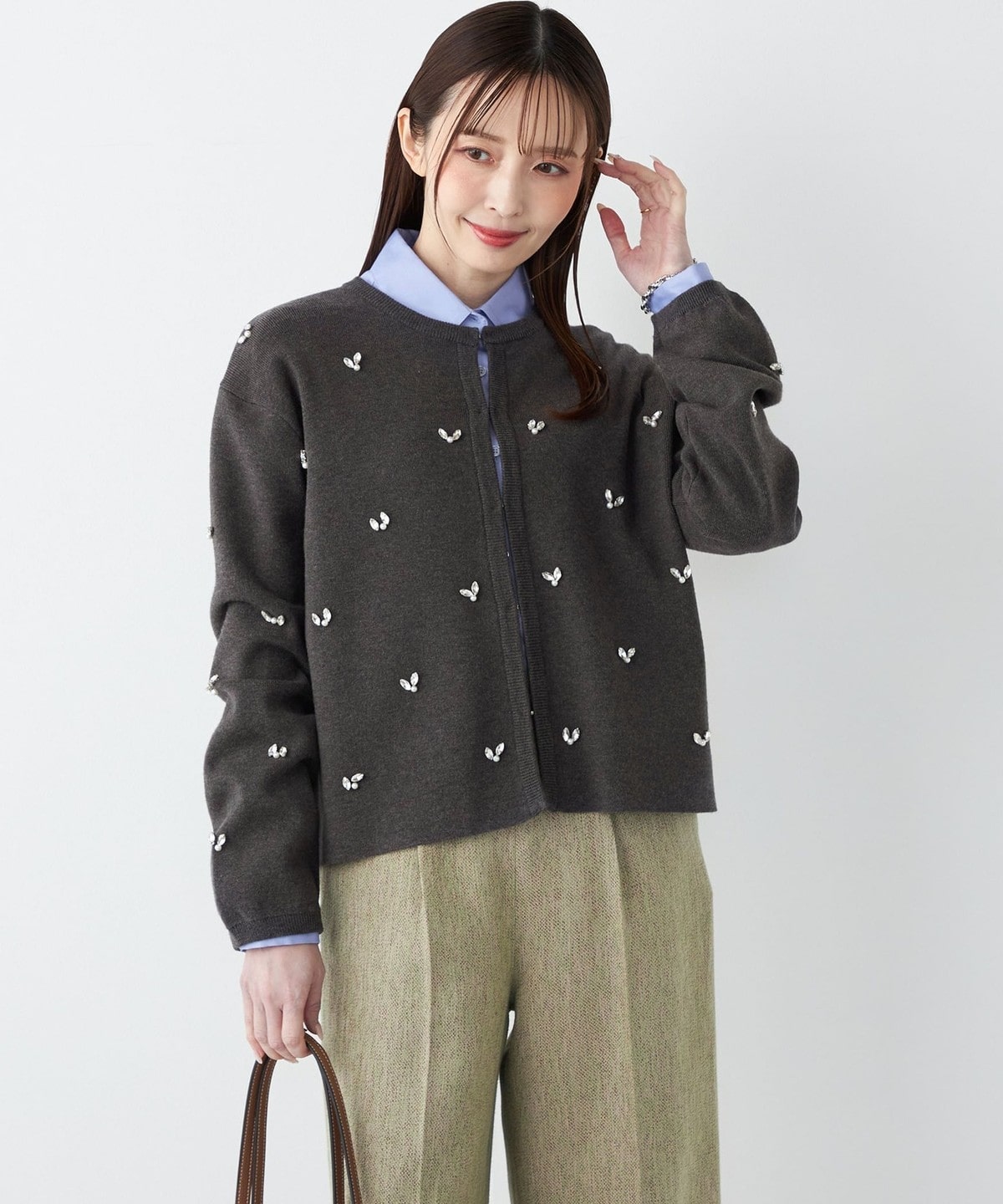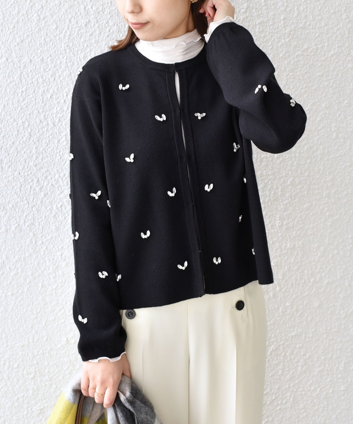 パールモチーフとリーフ型のビジューを組み合わせた模様がポイントの、今季らしいカーディガン。