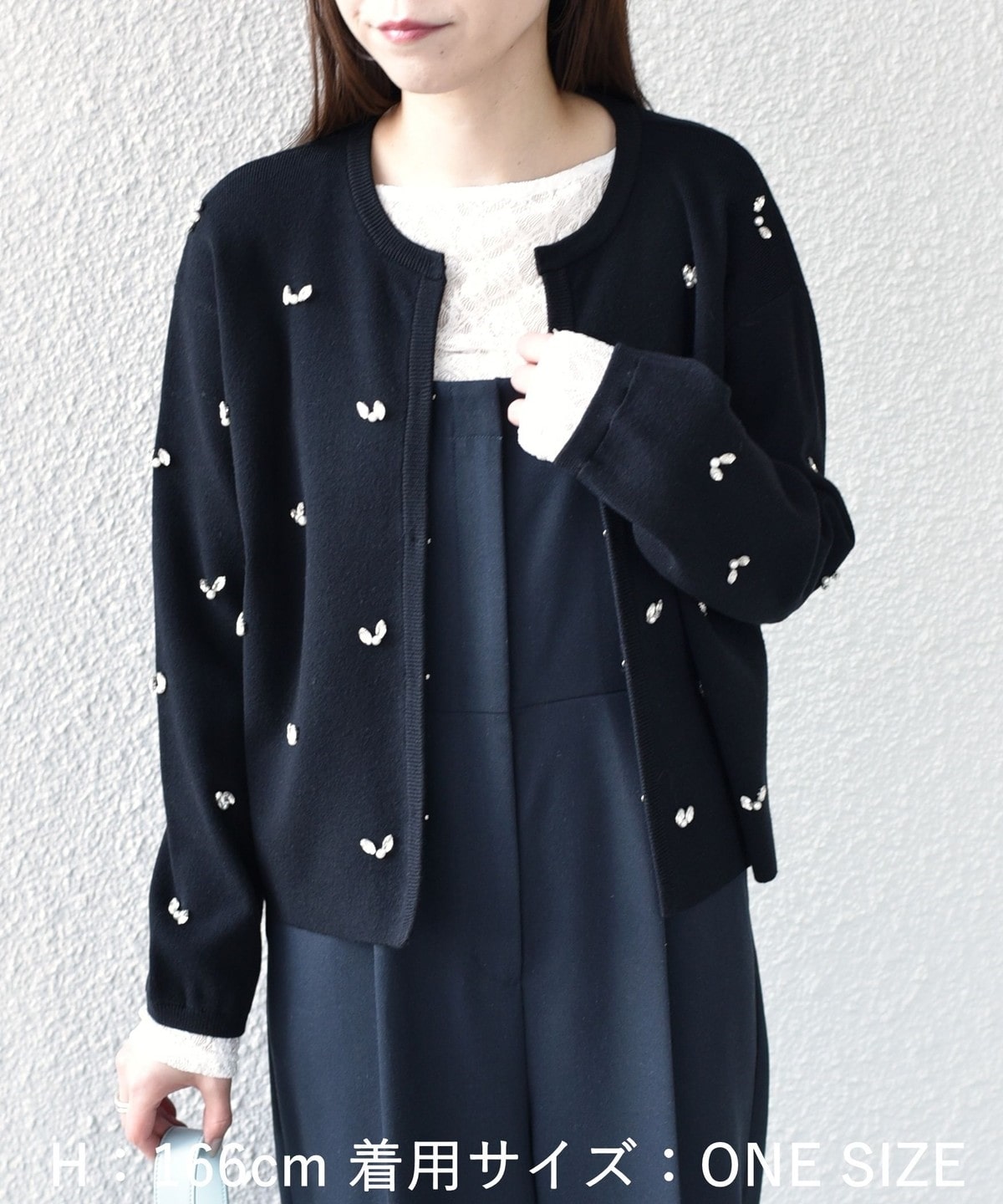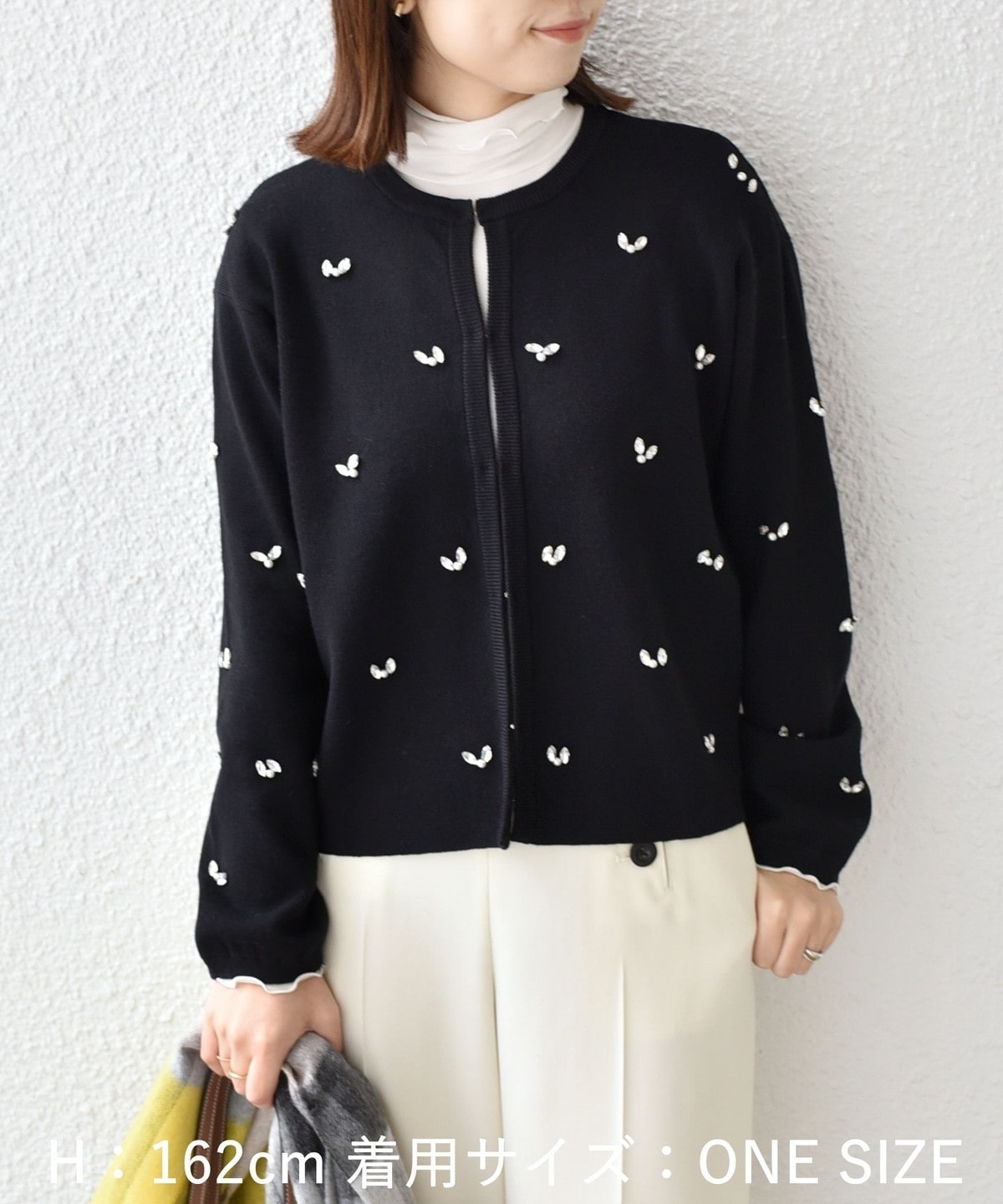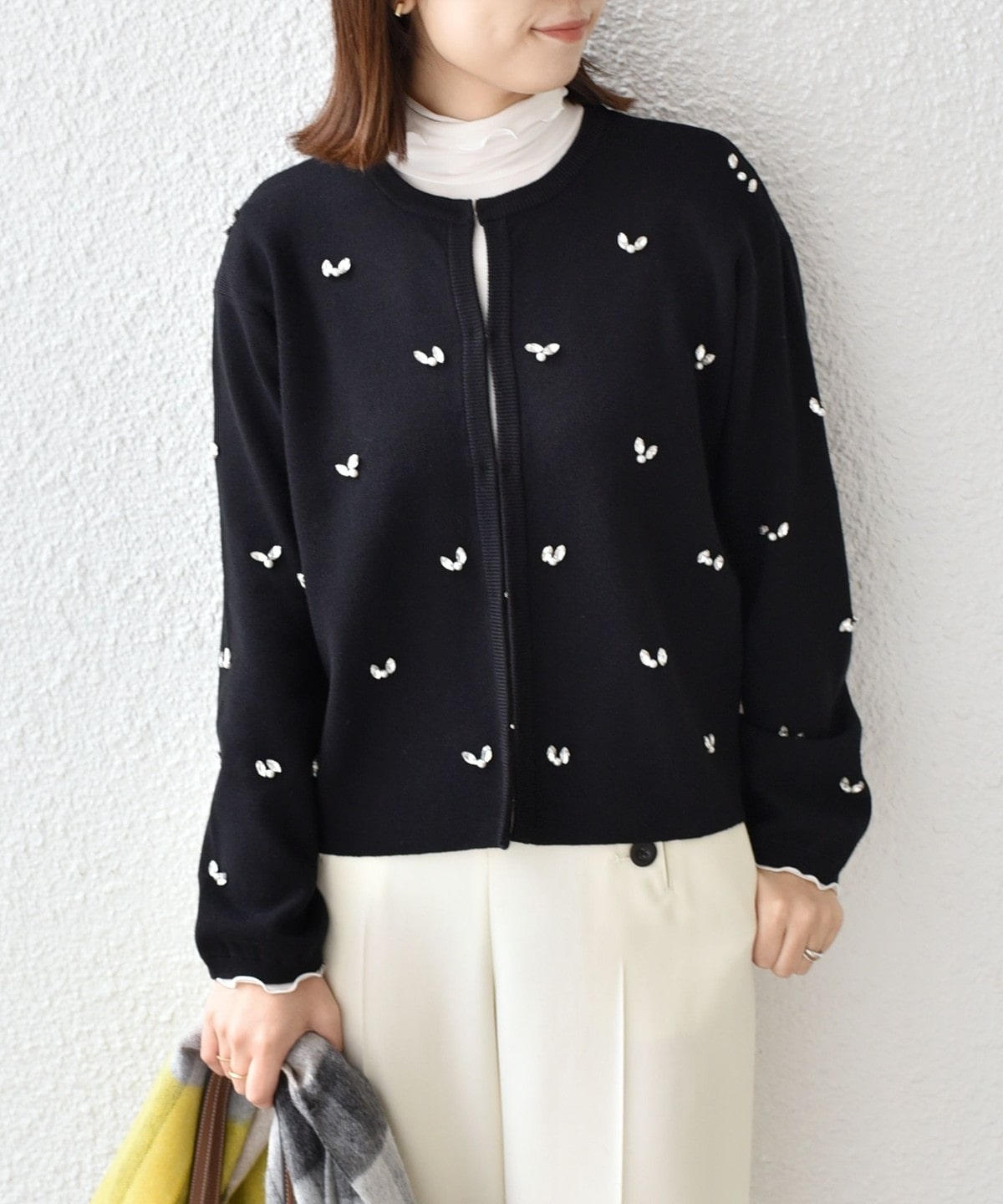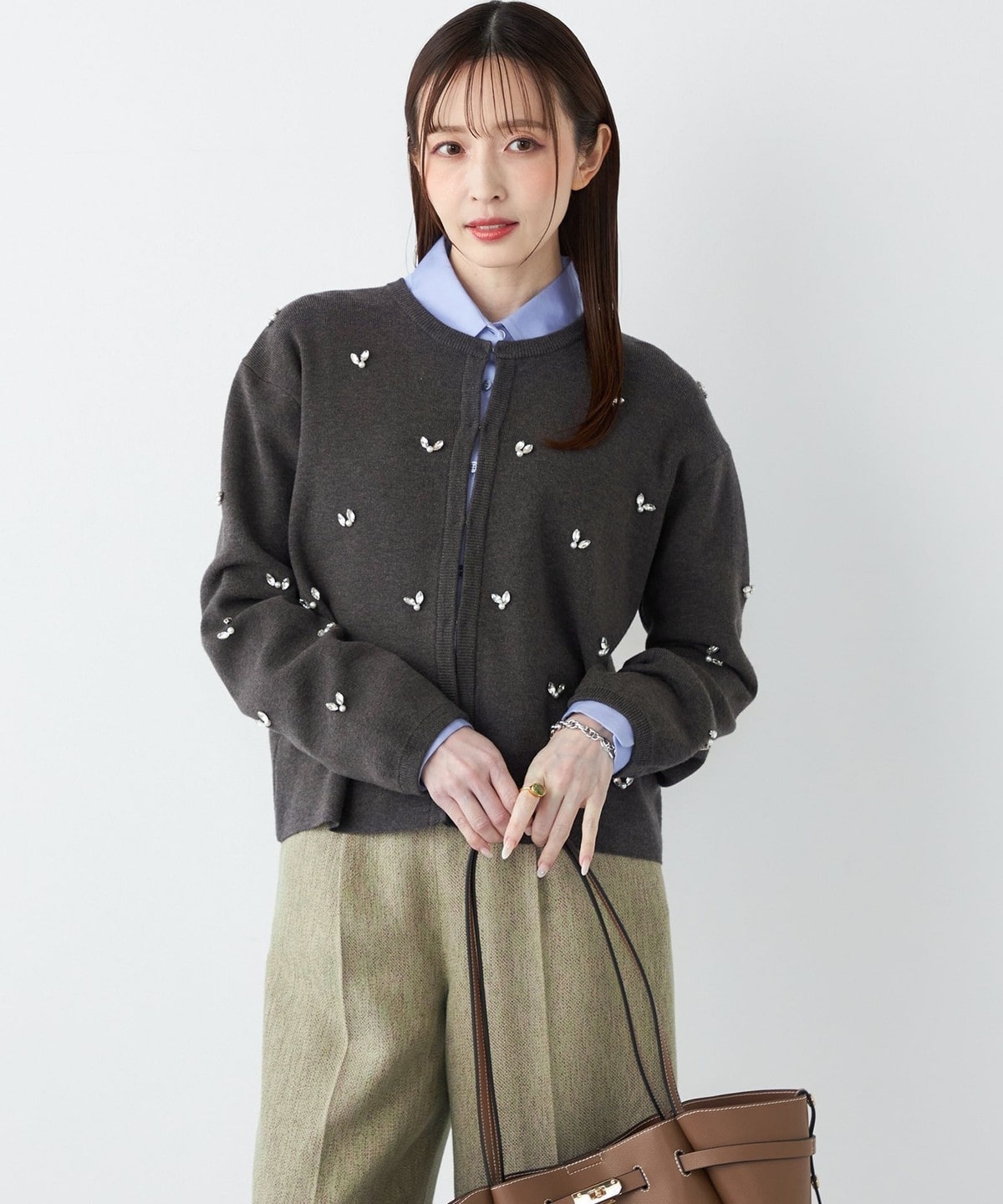 パールモチーフとリーフ型のビジューを組み合わせた模様がポイントの、今季らしいカーディガン。