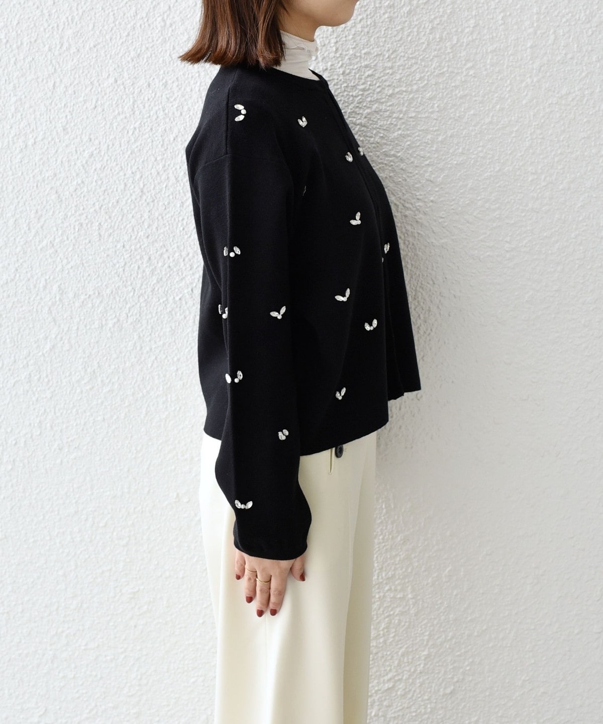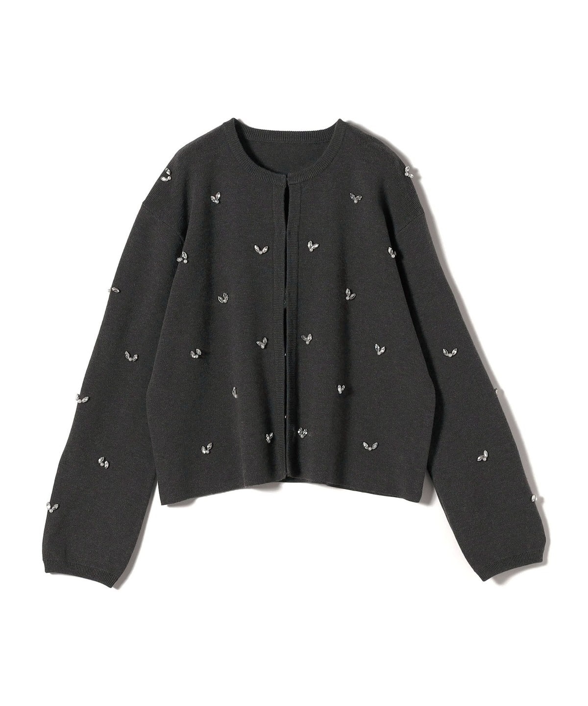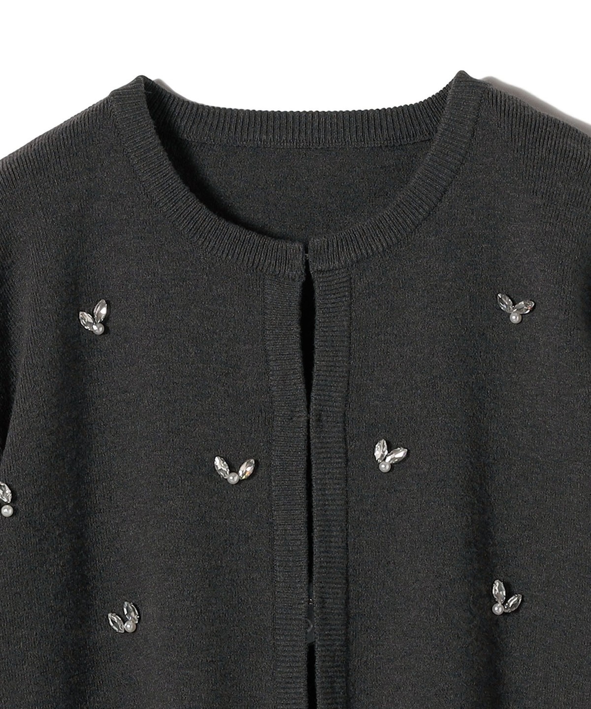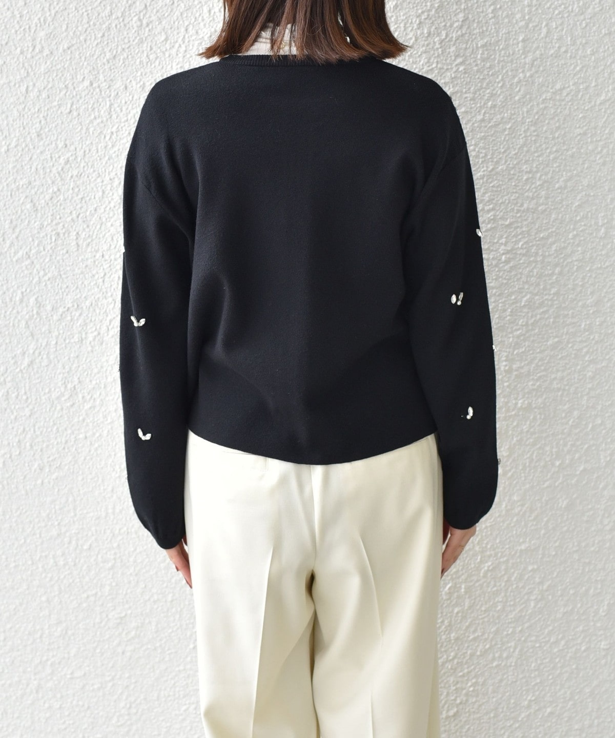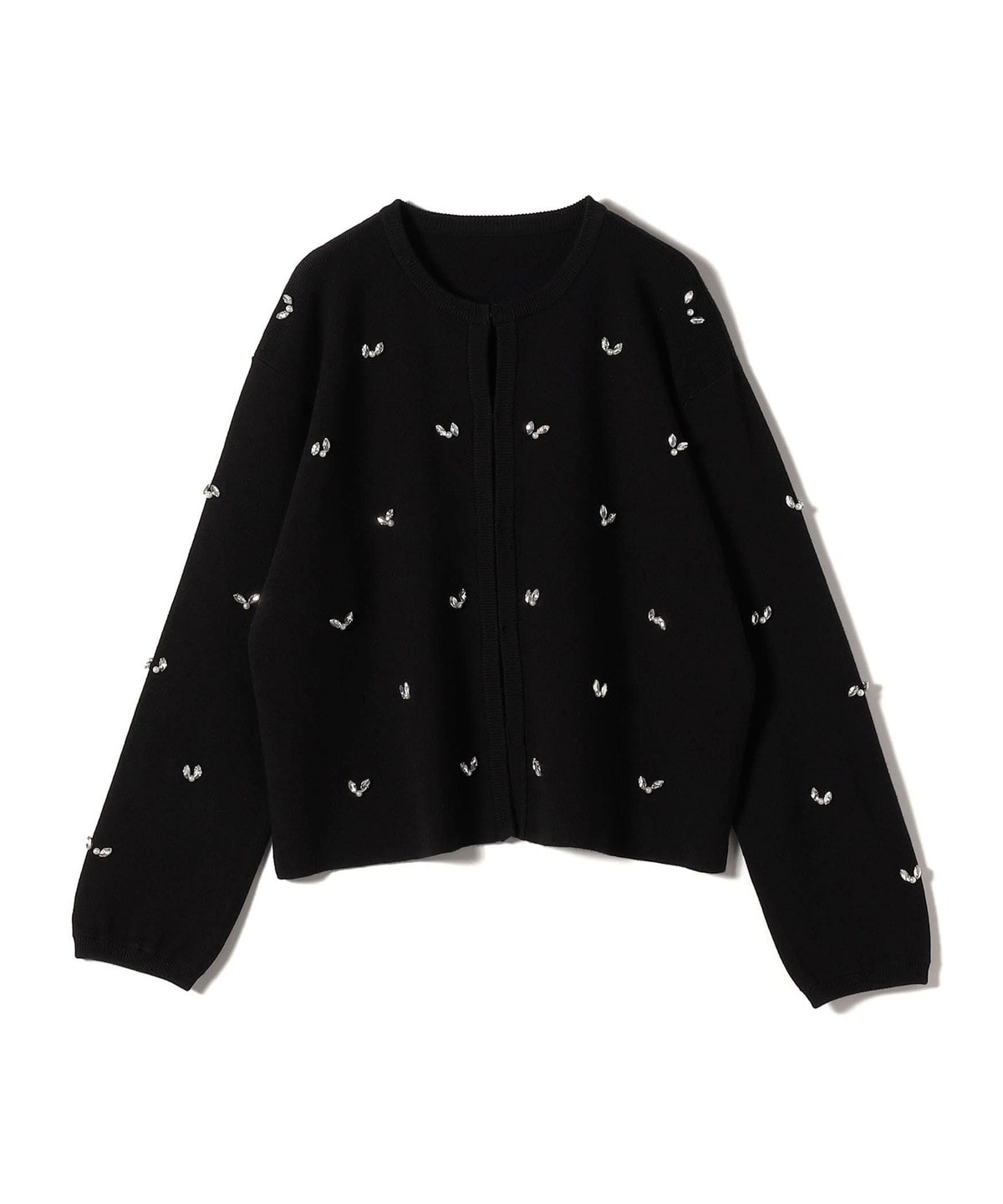 パールモチーフとリーフ型のビジューを組み合わせた模様がポイントの、今季らしいカーディガン。