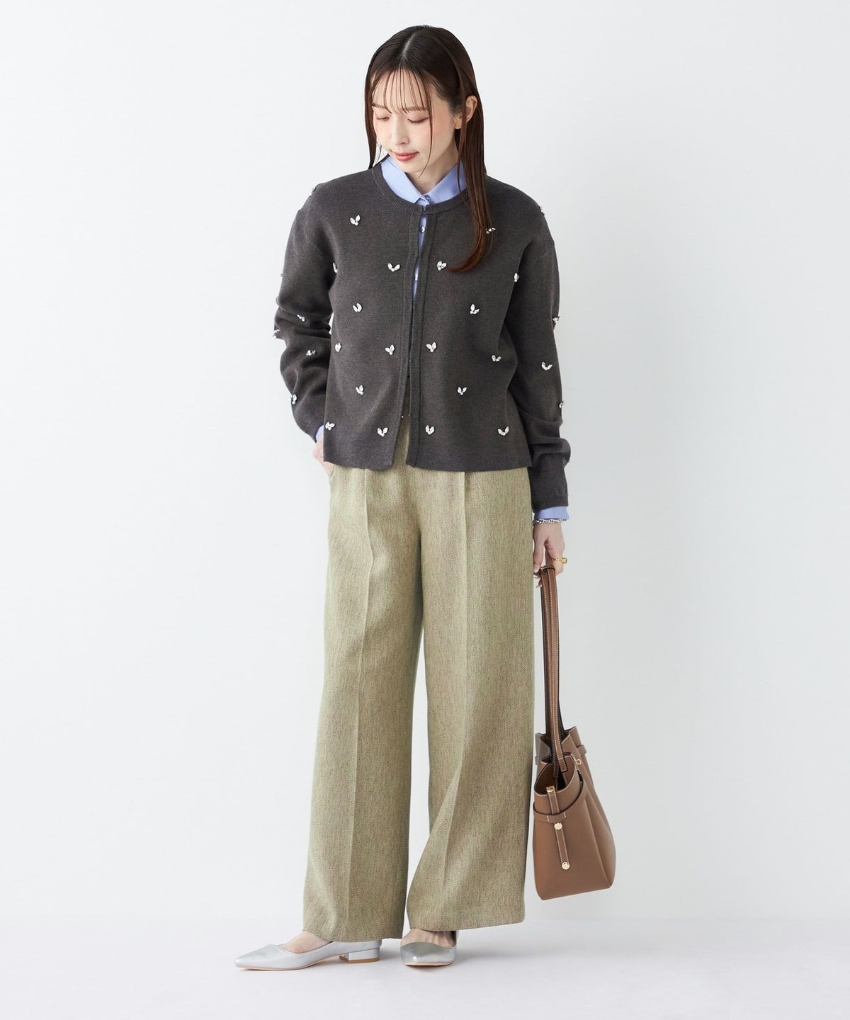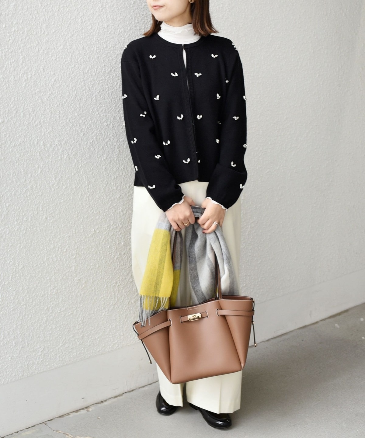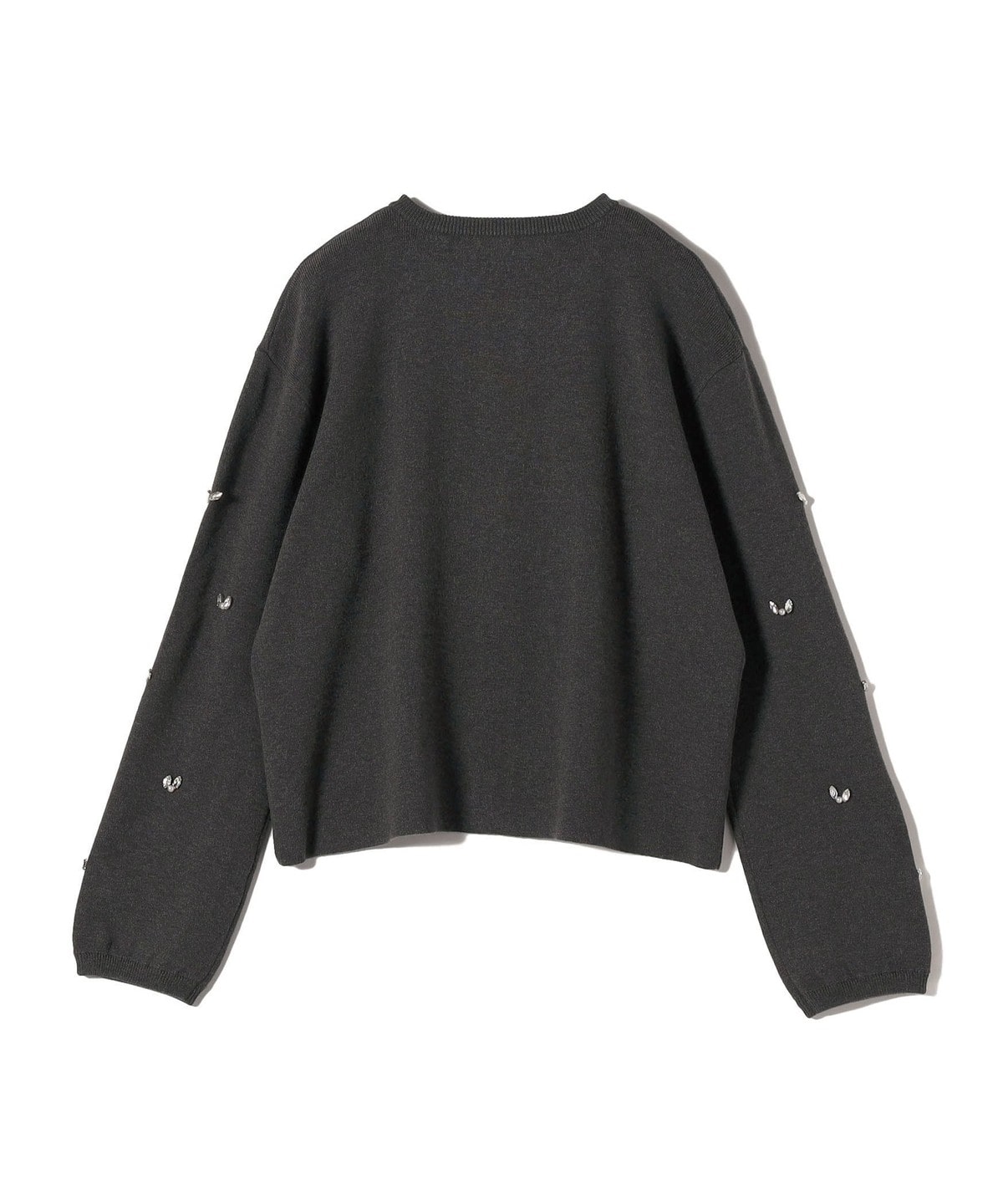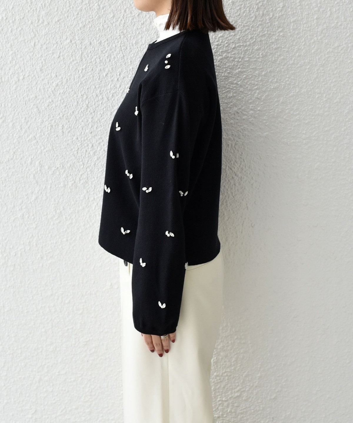 パールモチーフとリーフ型のビジューを組み合わせた模様がポイントの、今季らしいカーディガン。