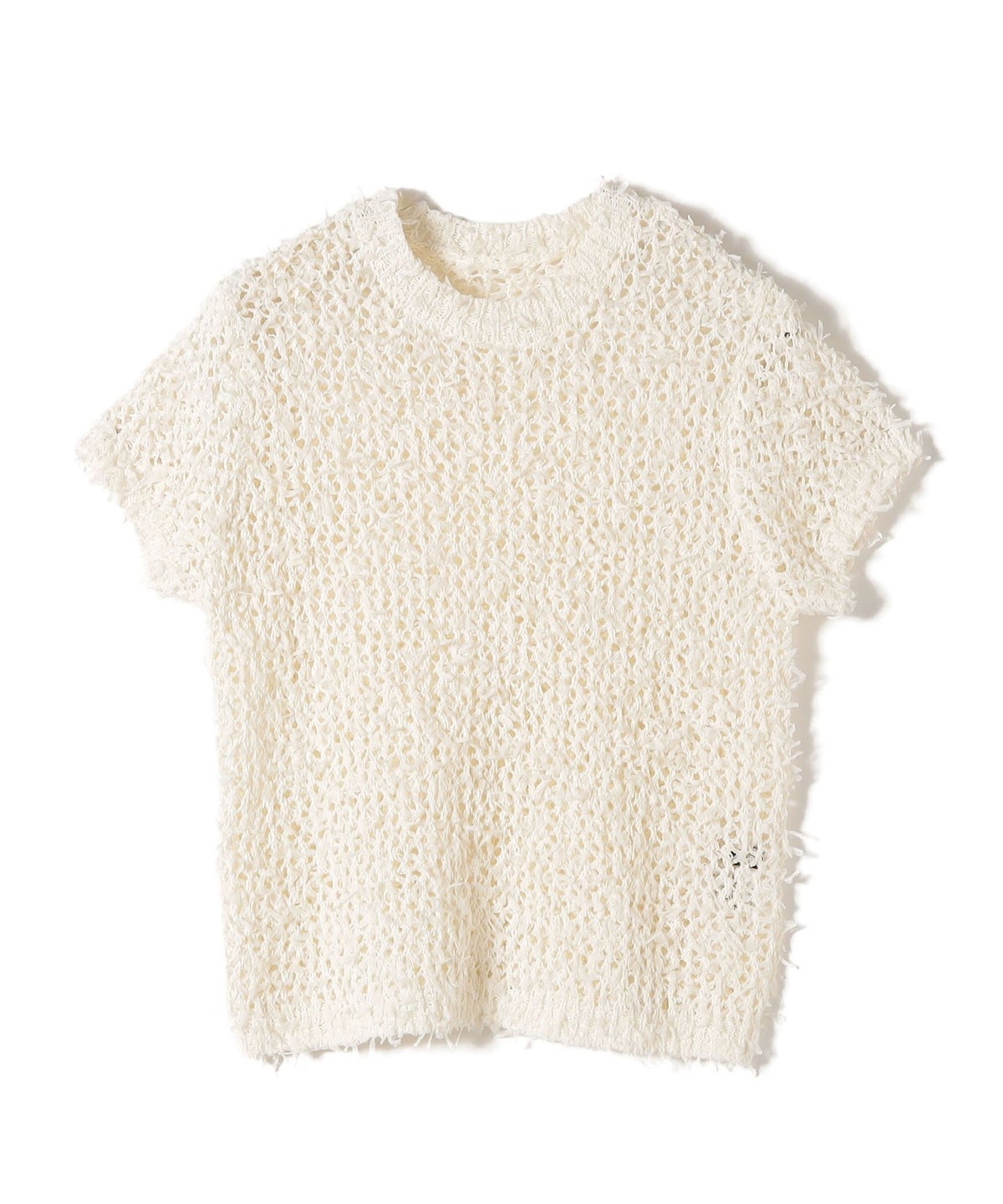 チュールテープを引きそろえた、表情豊かな編地が目を惹くサマーニット。