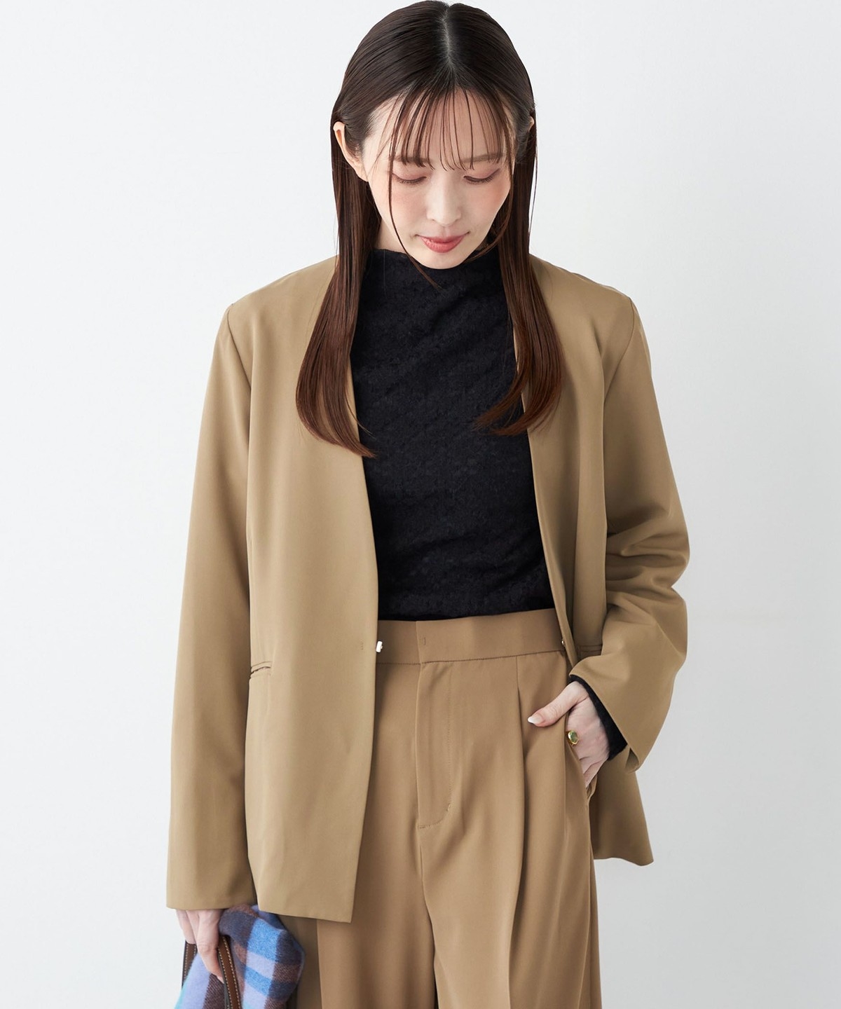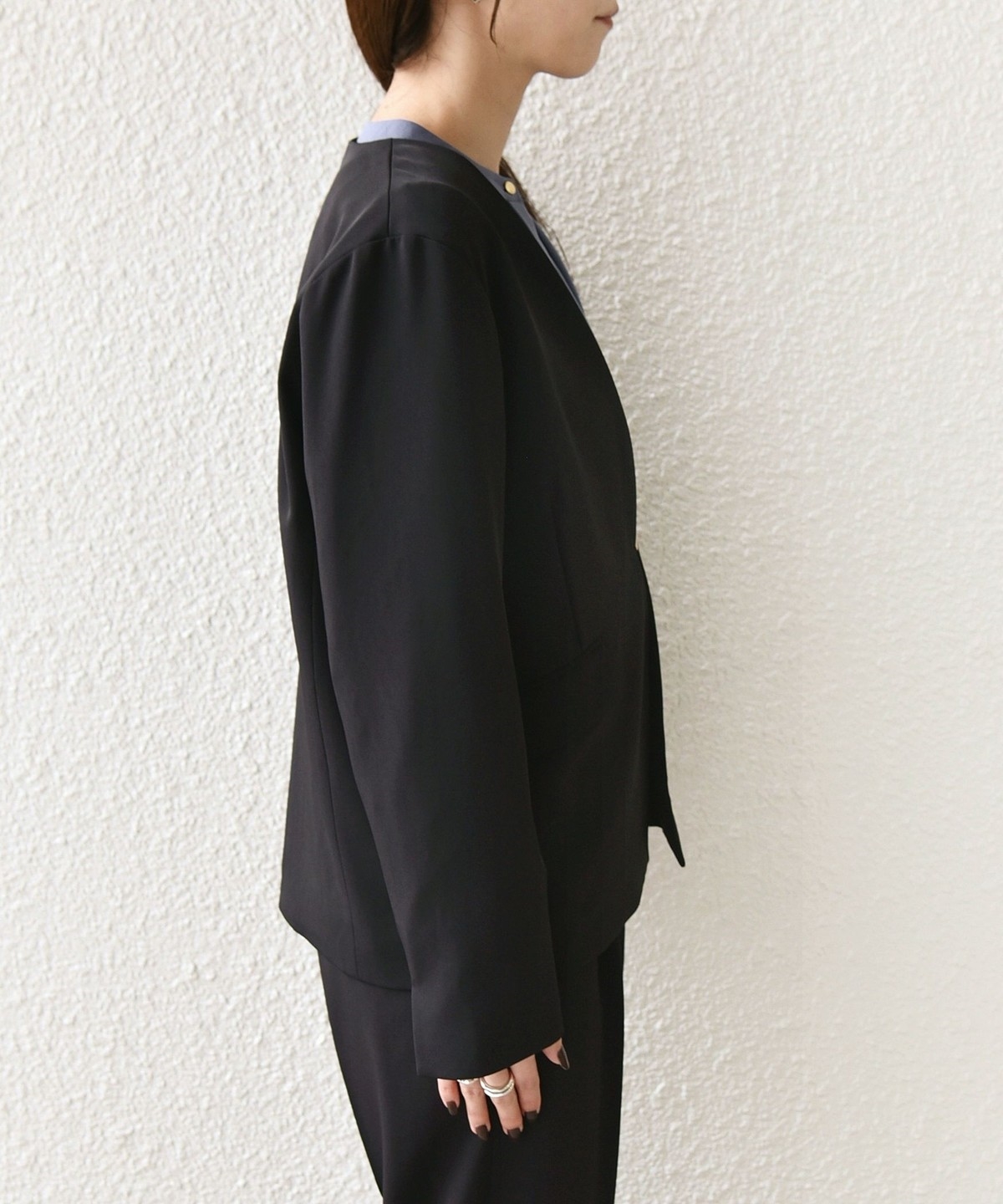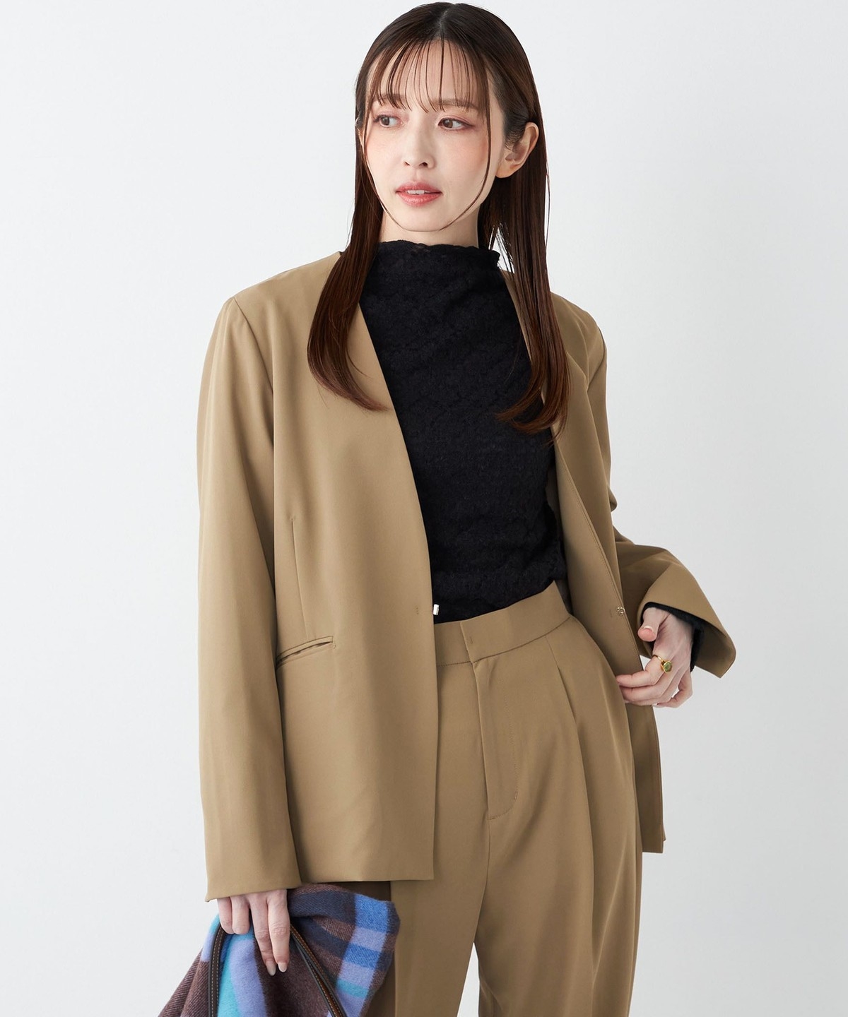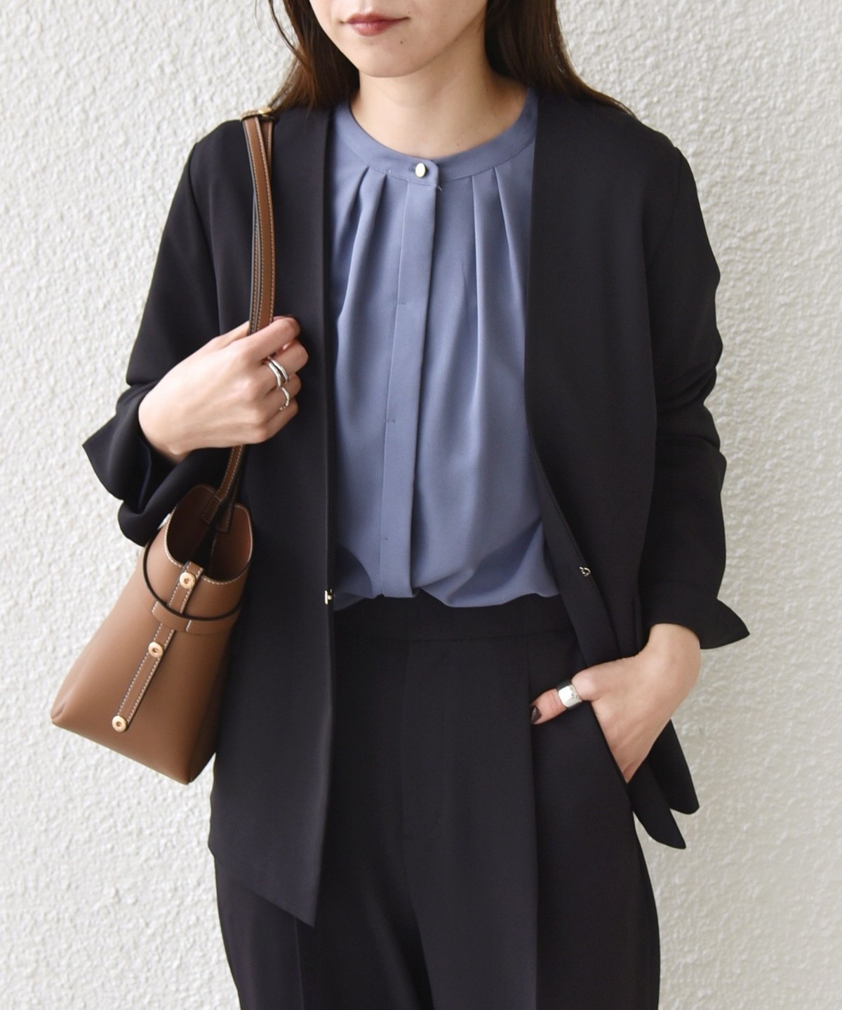 深めのVカラーが顔まわりをすっきりと見せ、程よい抜け感をプラスしてくれます。
