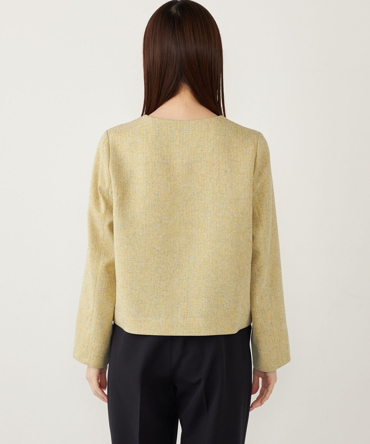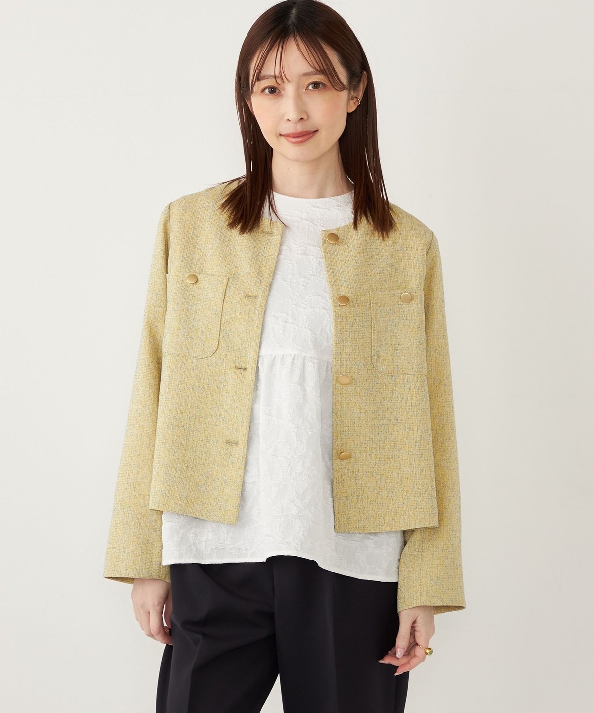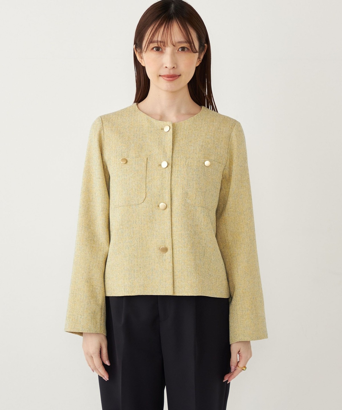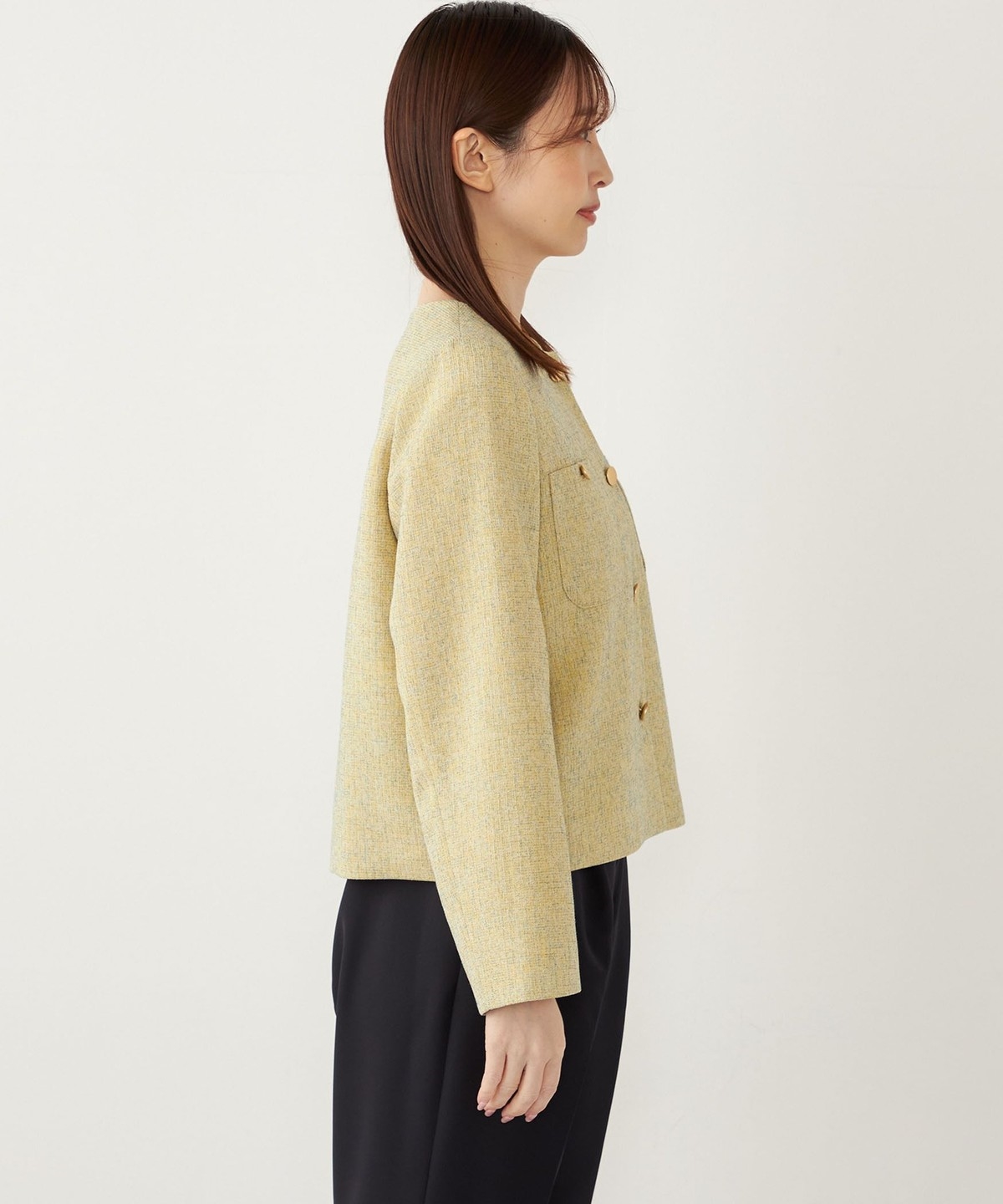 ノーカラーですっきりとした印象を演出し、さらっと羽織っていただけます。