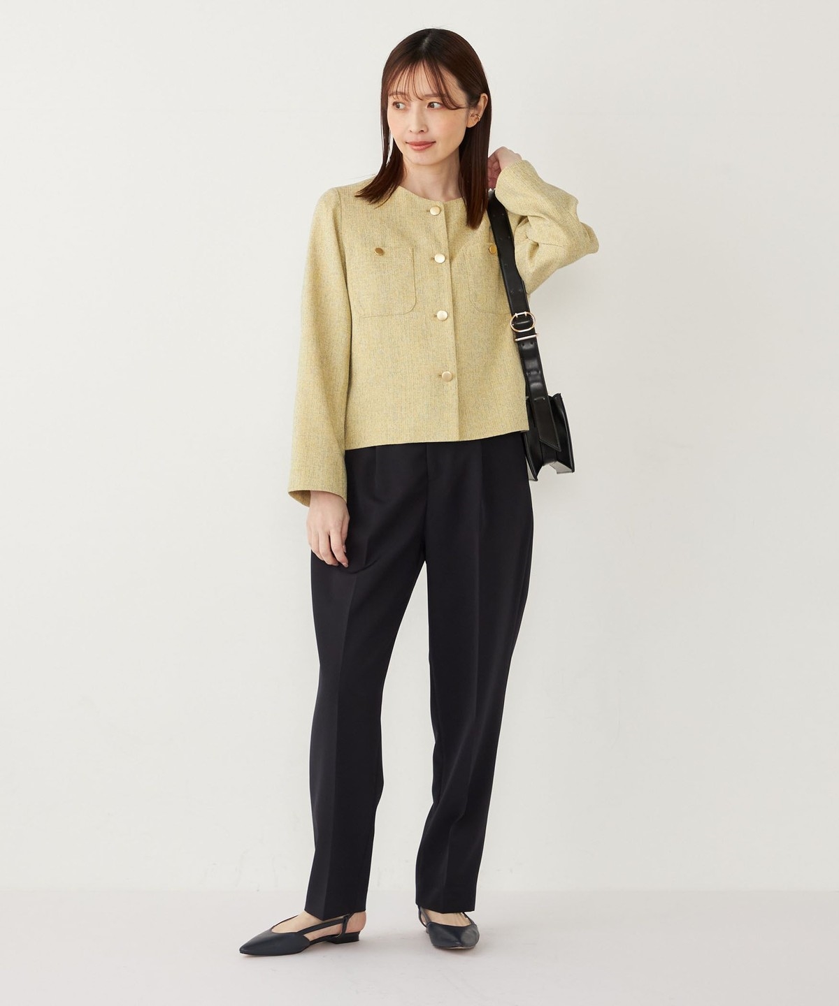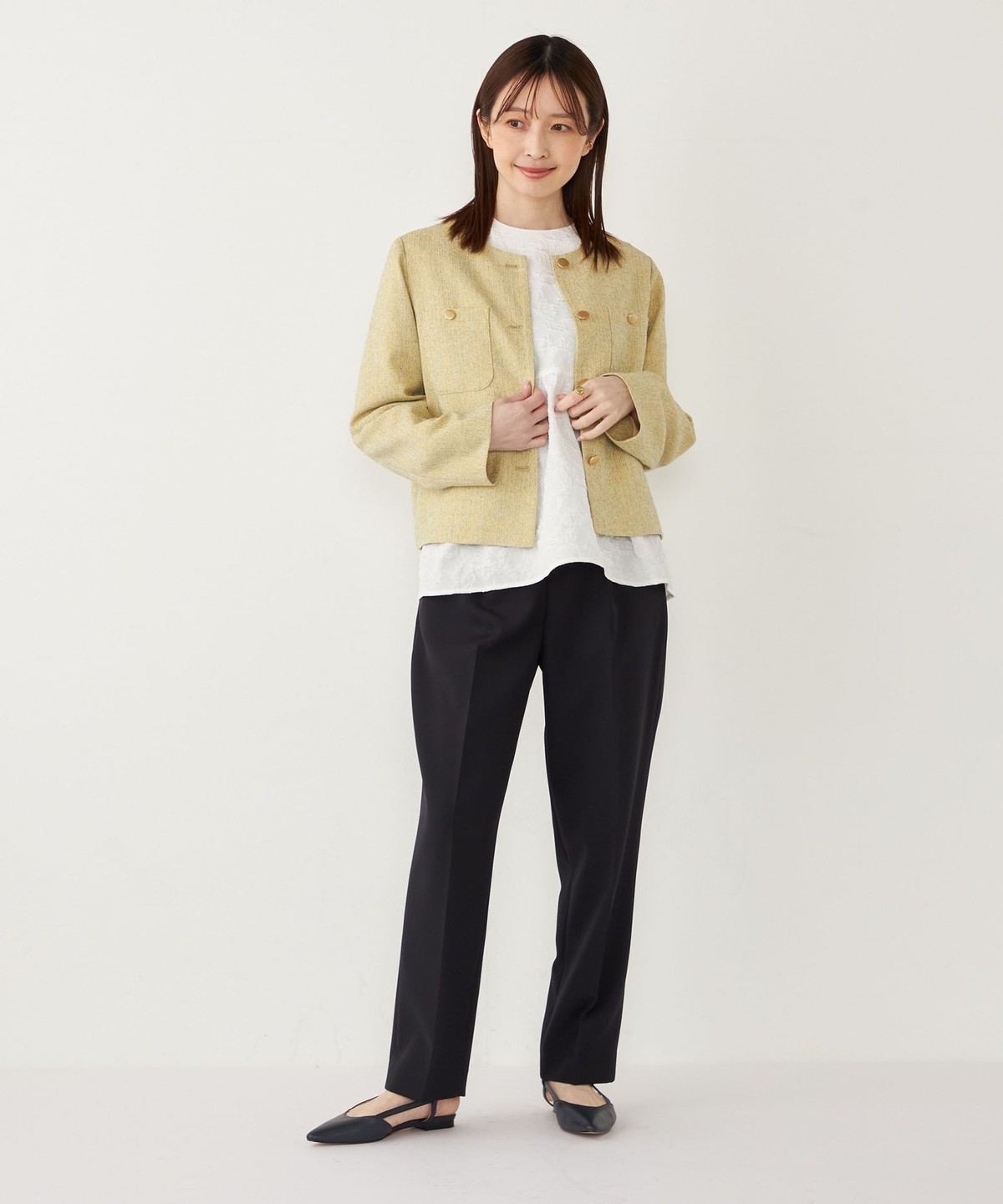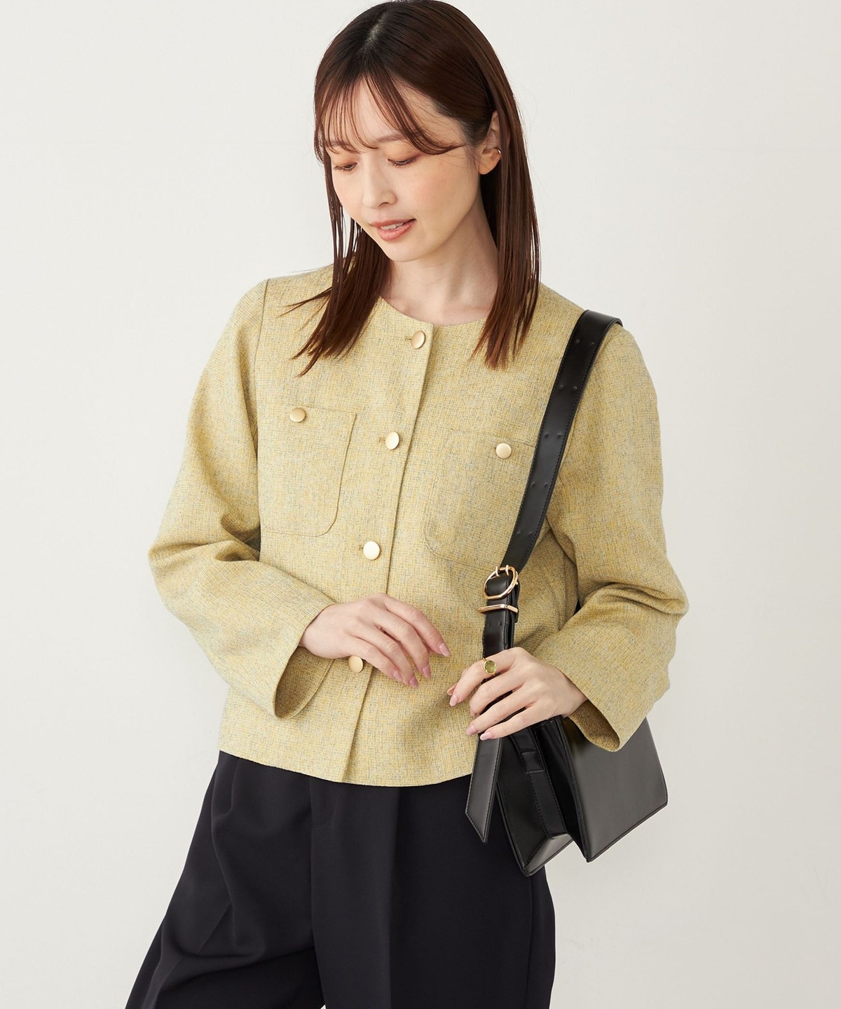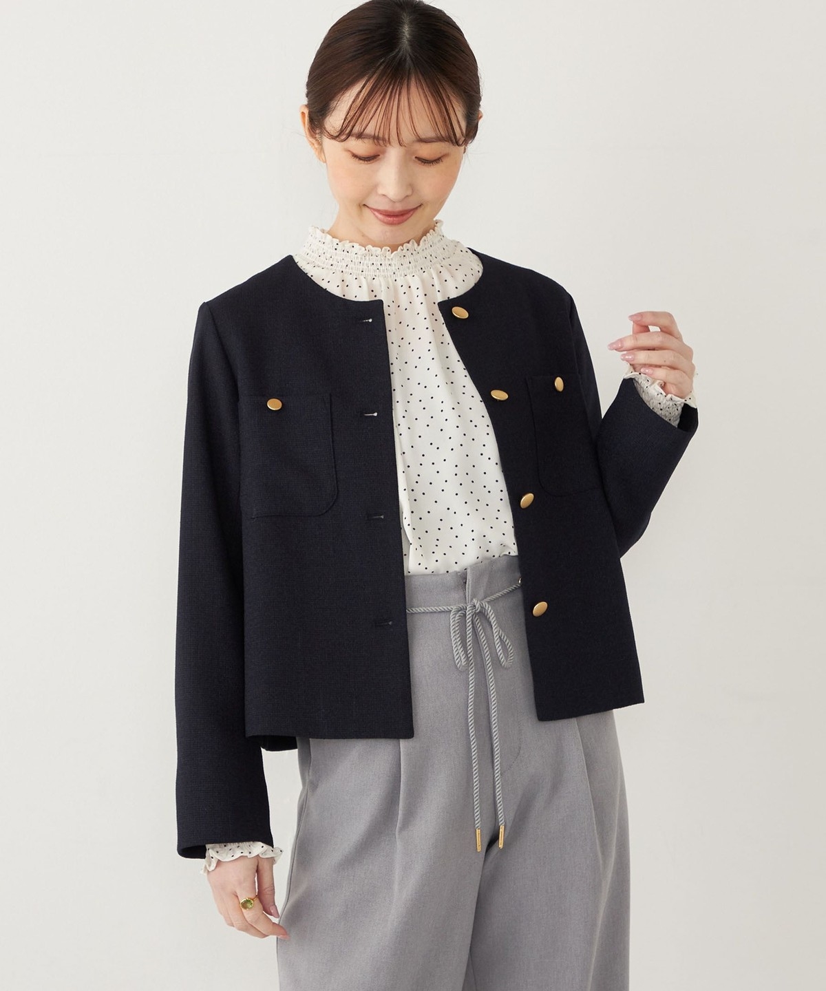 ノーカラーですっきりとした印象を演出し、さらっと羽織っていただけます。
