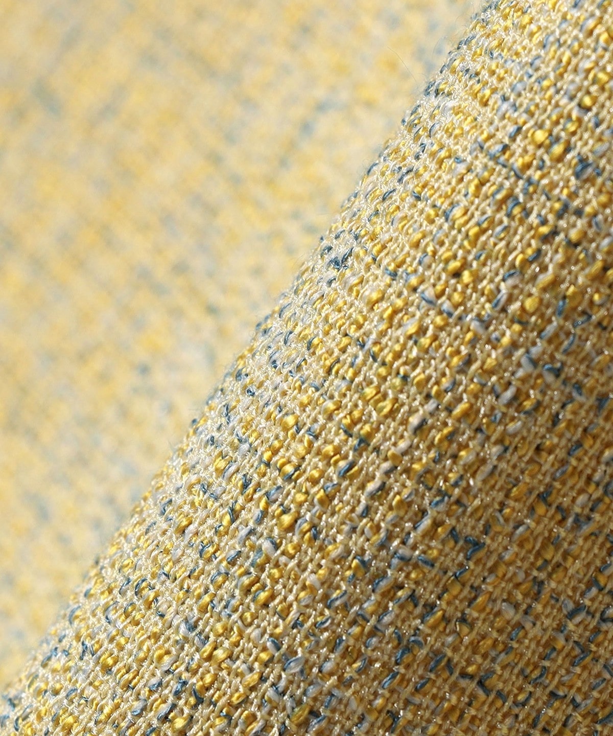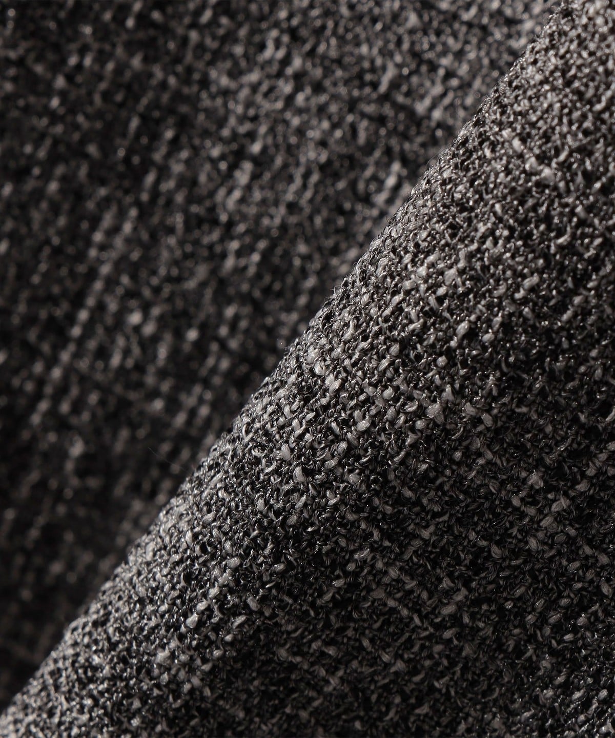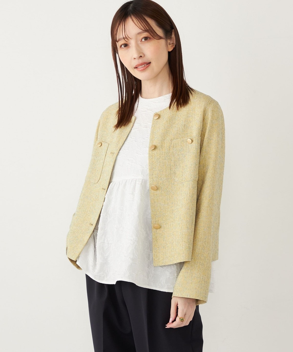 凹凸感のあるツイード見えする生地に、ゴールドカラーのボタンが目を惹くジャケット。