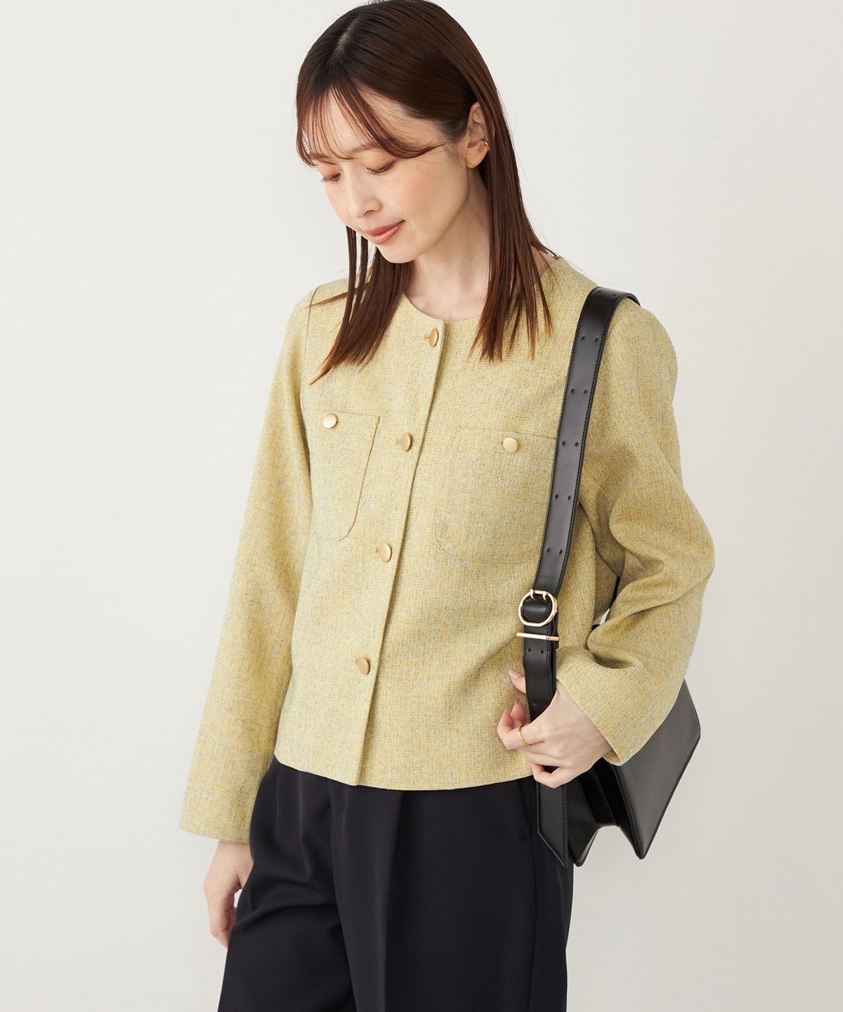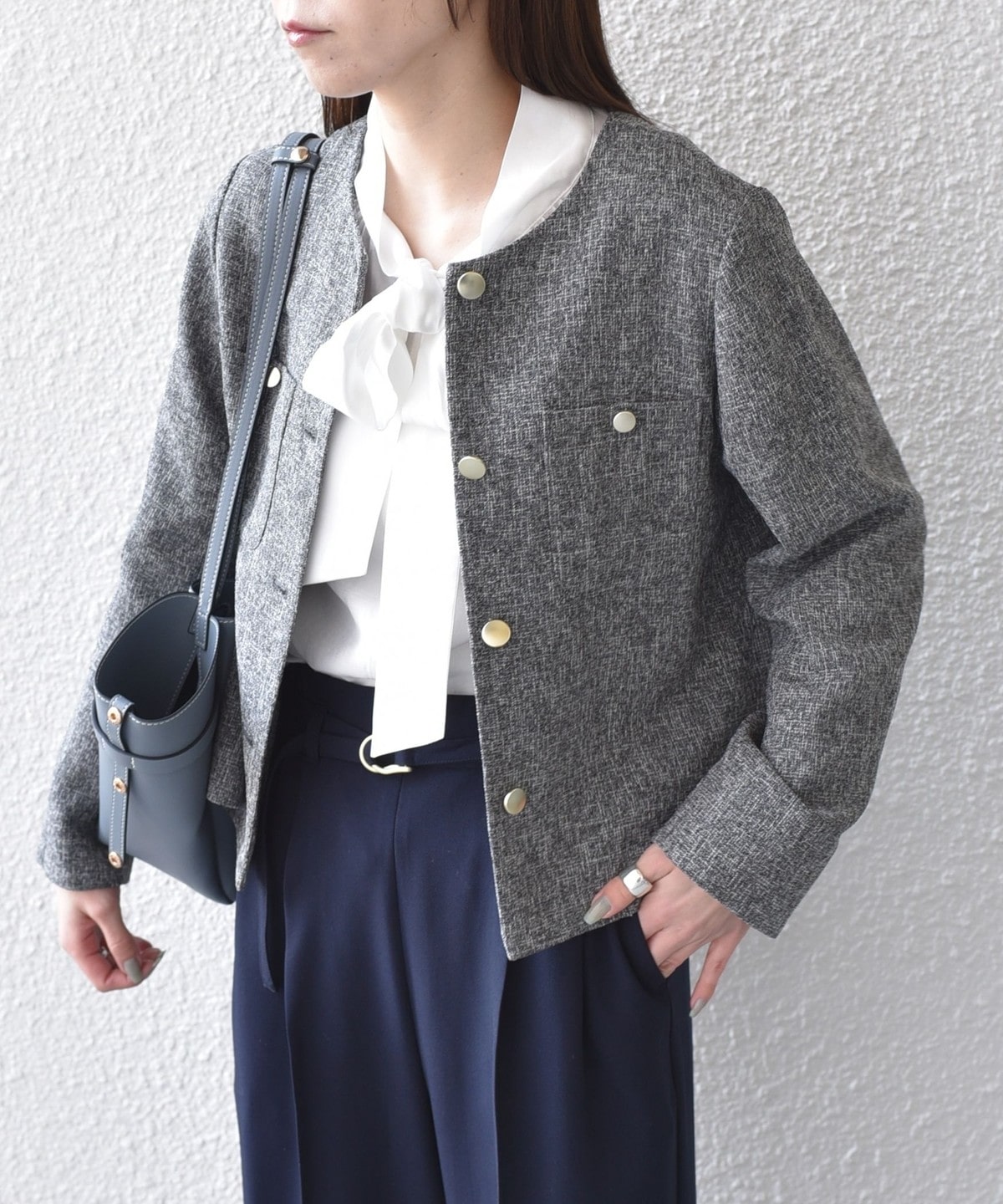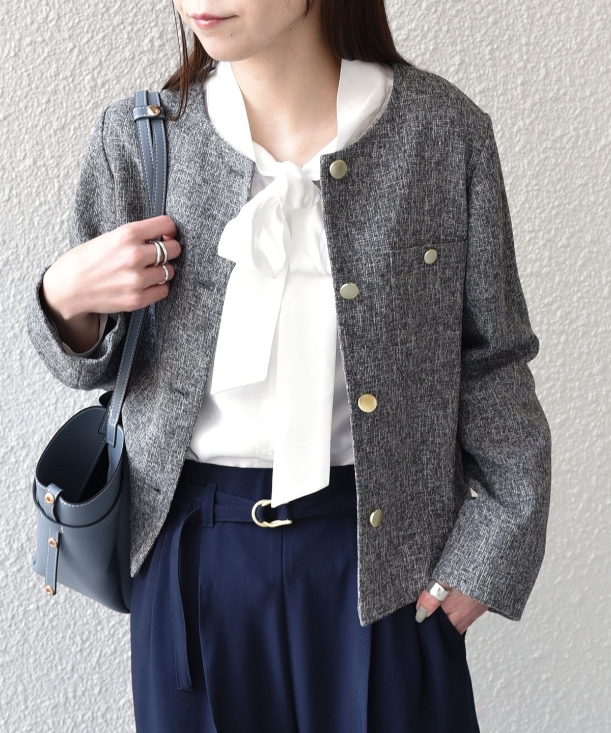 ノーカラーですっきりとした印象を演出し、さらっと羽織っていただけます。