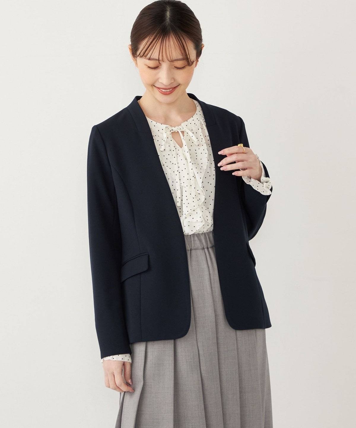 カラーレスと自然とウエストをシェイプさせたシルエットで、すっきりとした印象で着ていただけます。