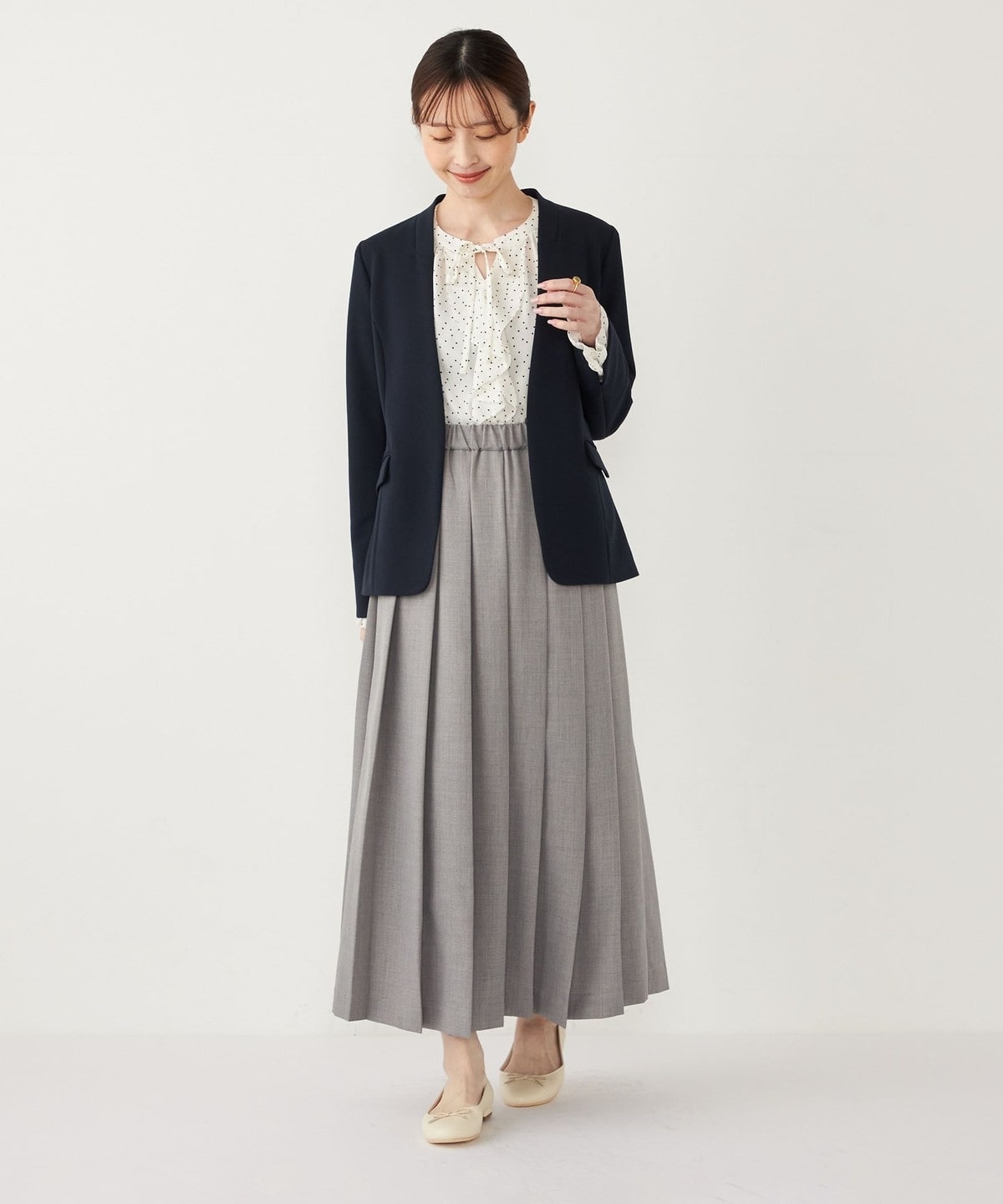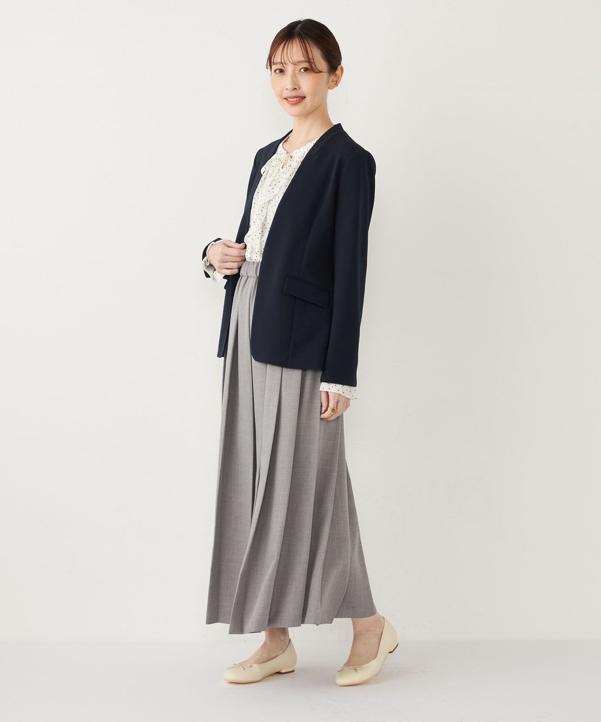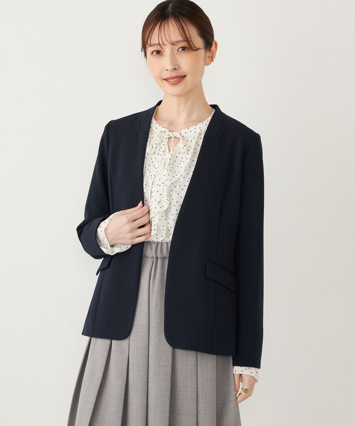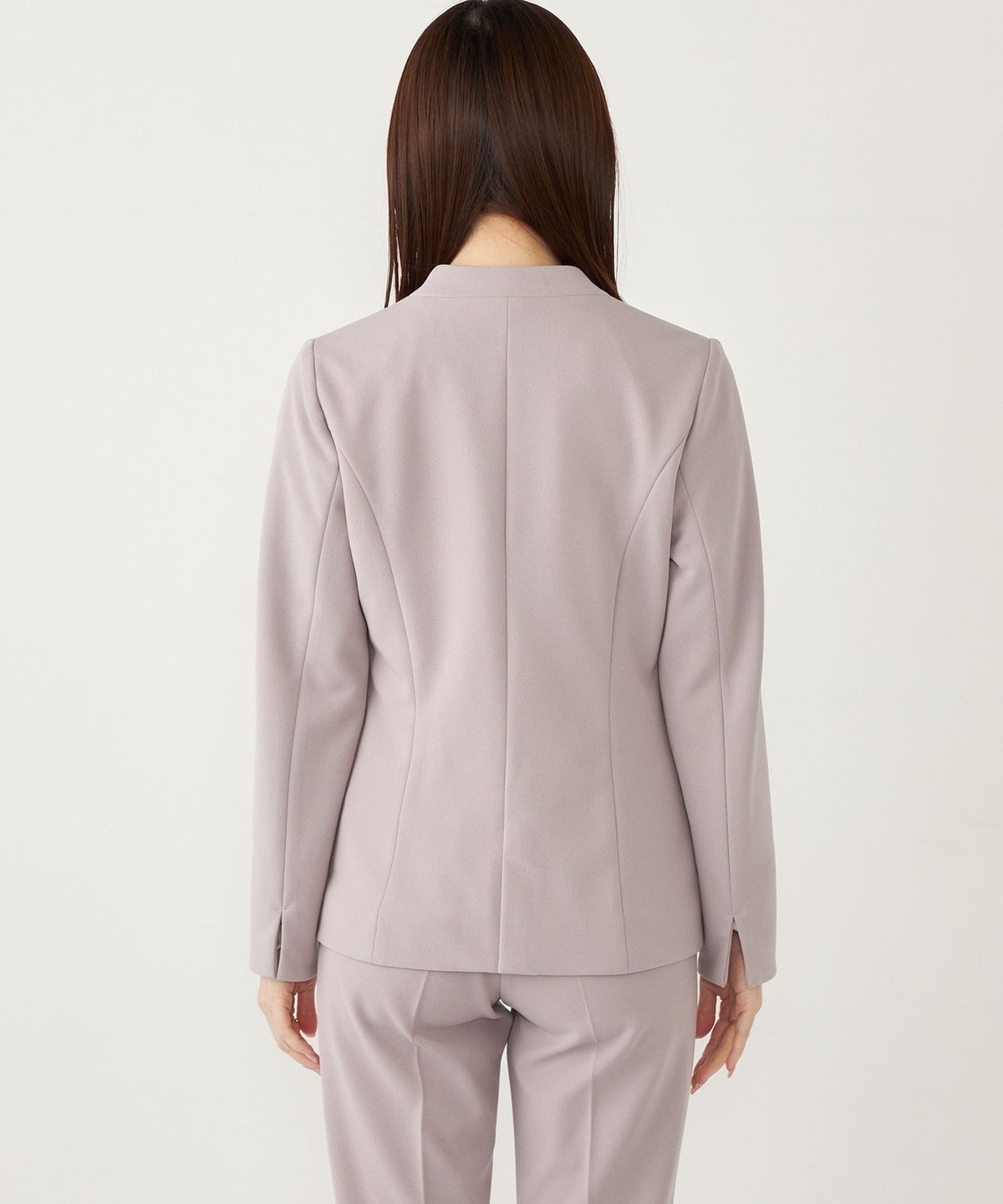 カラーレスと自然とウエストをシェイプさせたシルエットで、すっきりとした印象で着ていただけます。