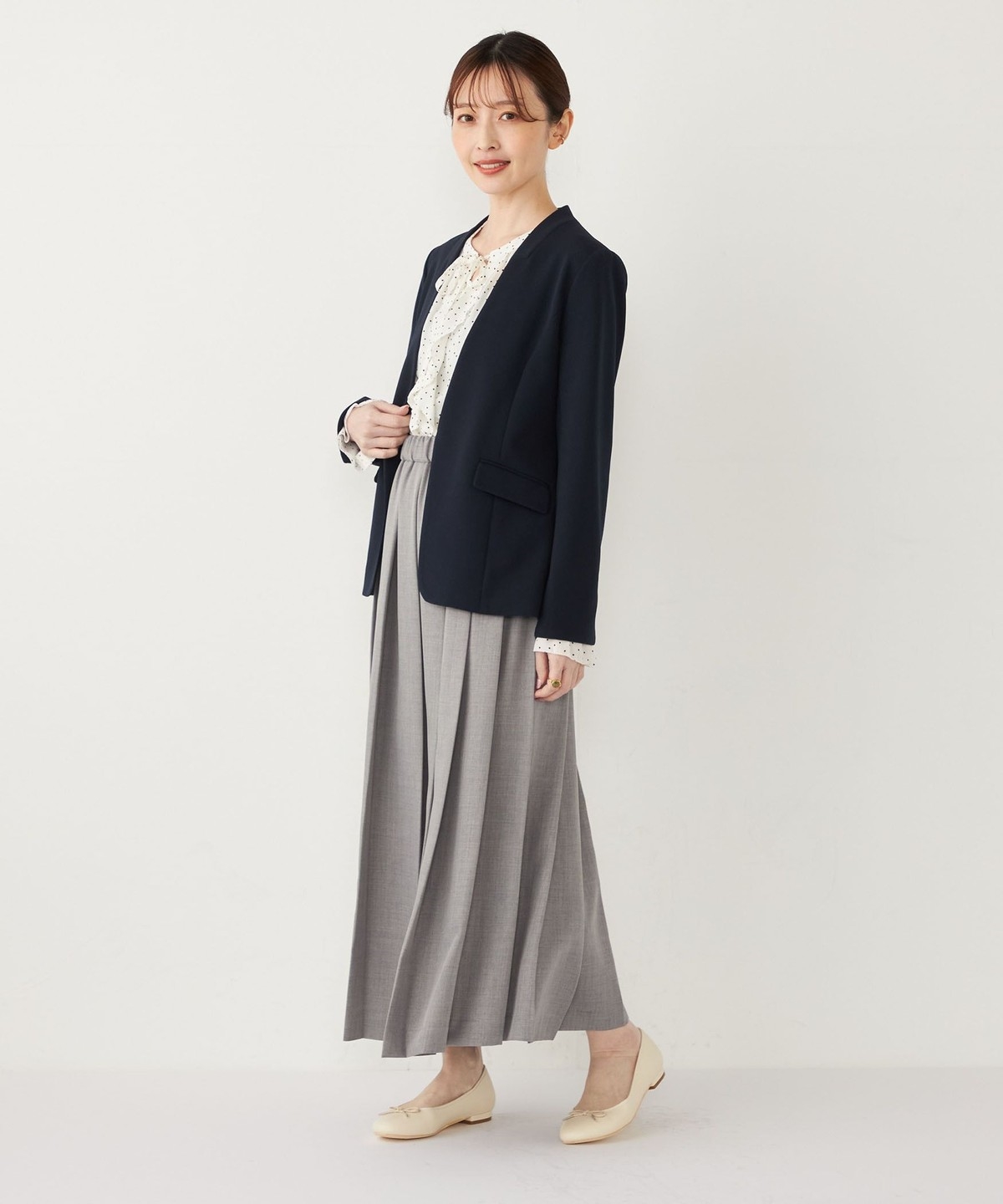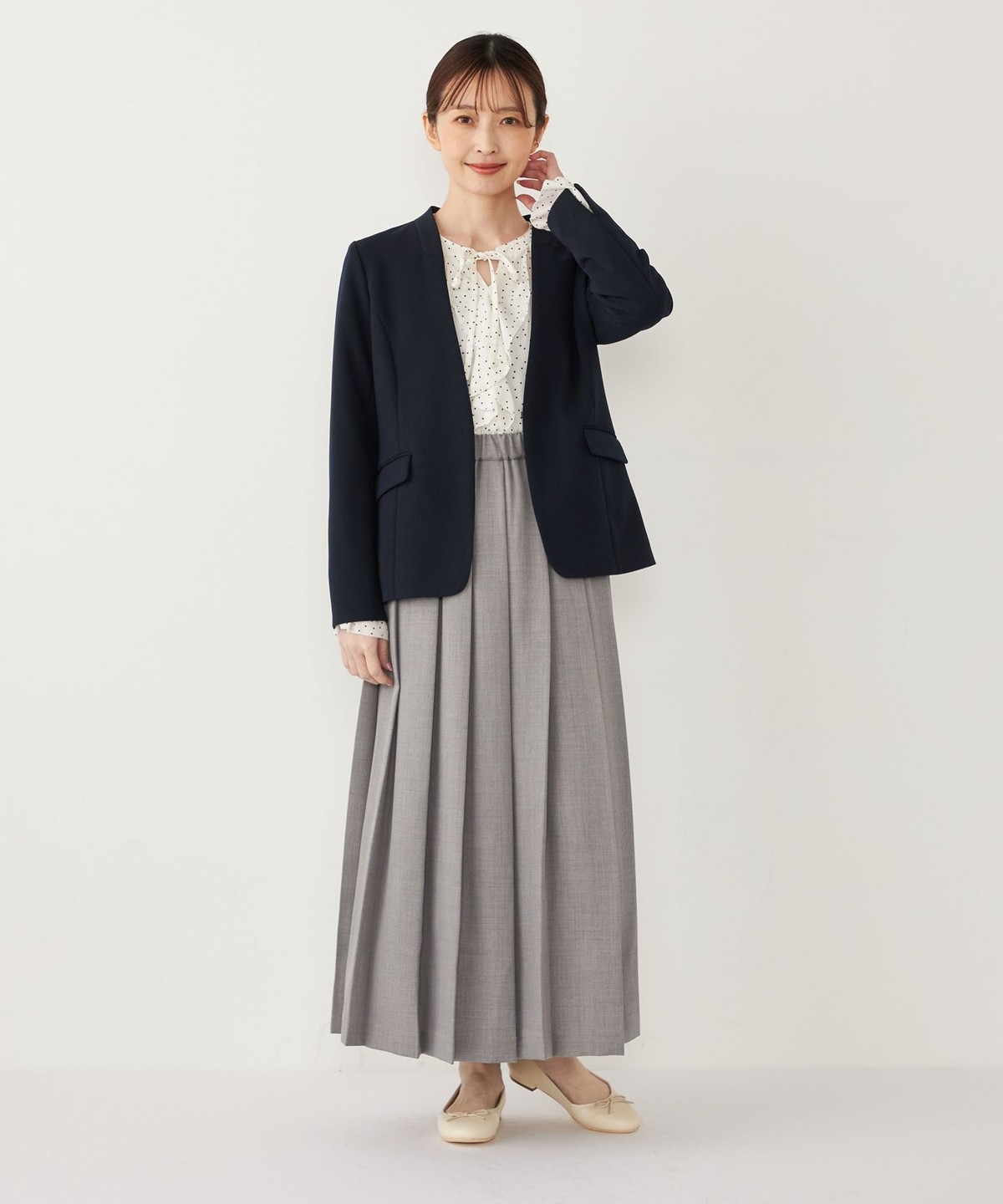 カラーレスと自然とウエストをシェイプさせたシルエットで、すっきりとした印象で着ていただけます。