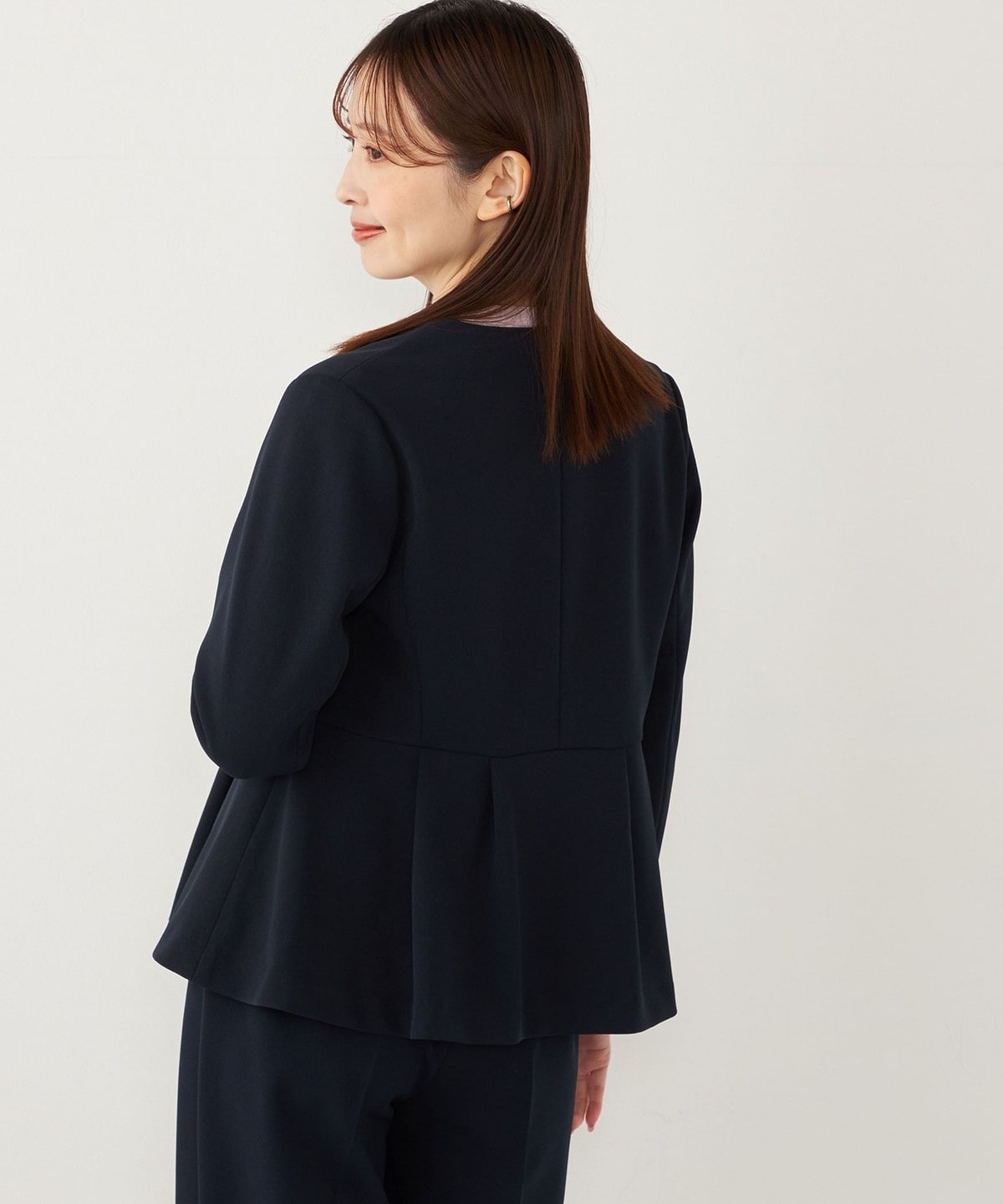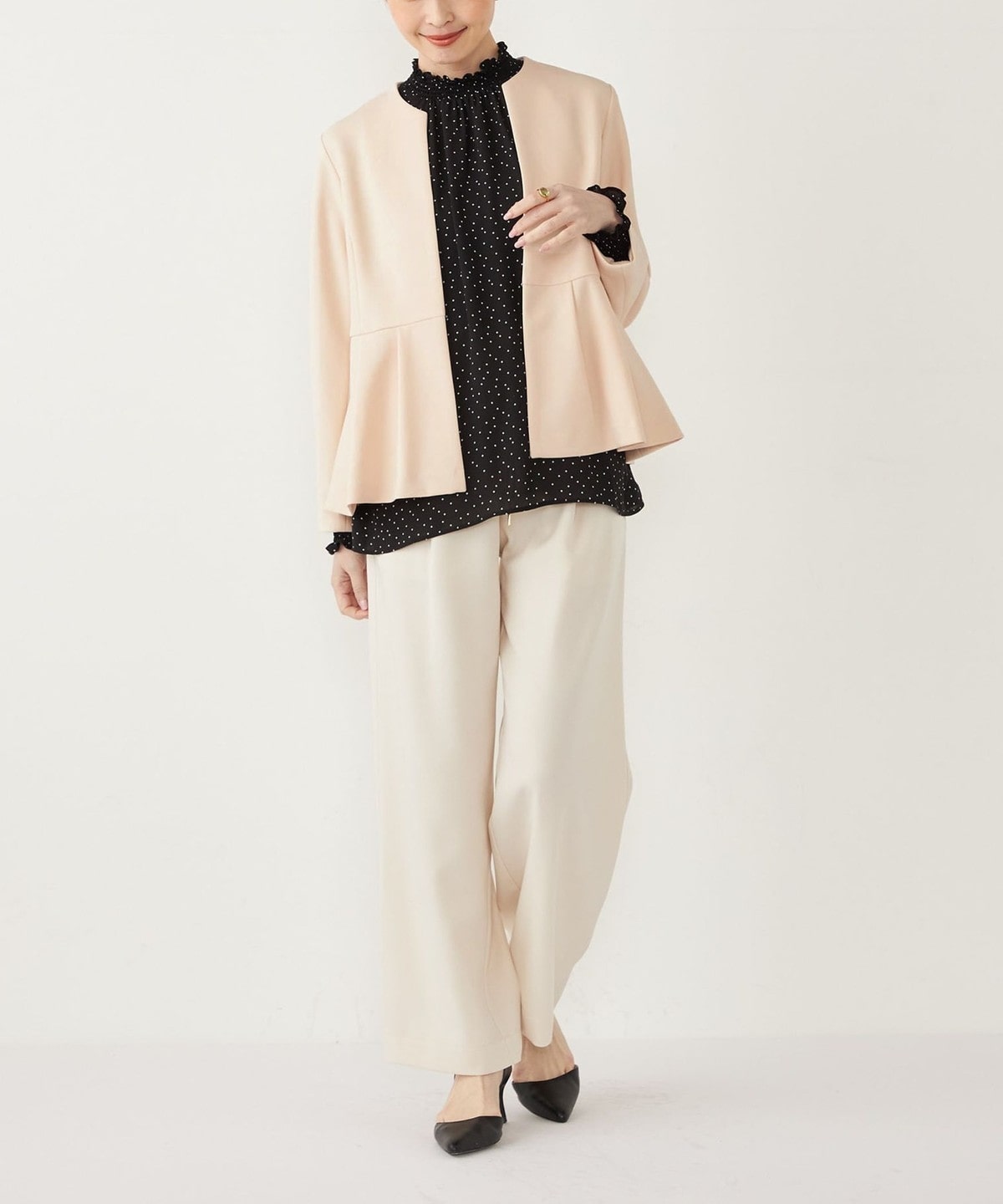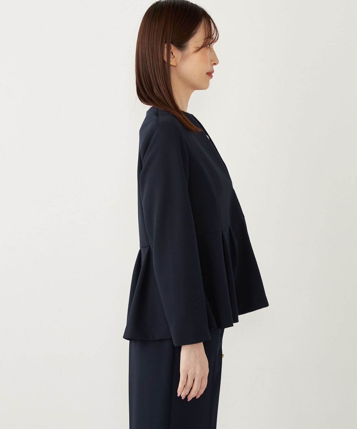 高めのウエスト位置から施したペプラムデザインが、スタイルアップ効果や、程よい女性らしさを演出してくれる1枚。