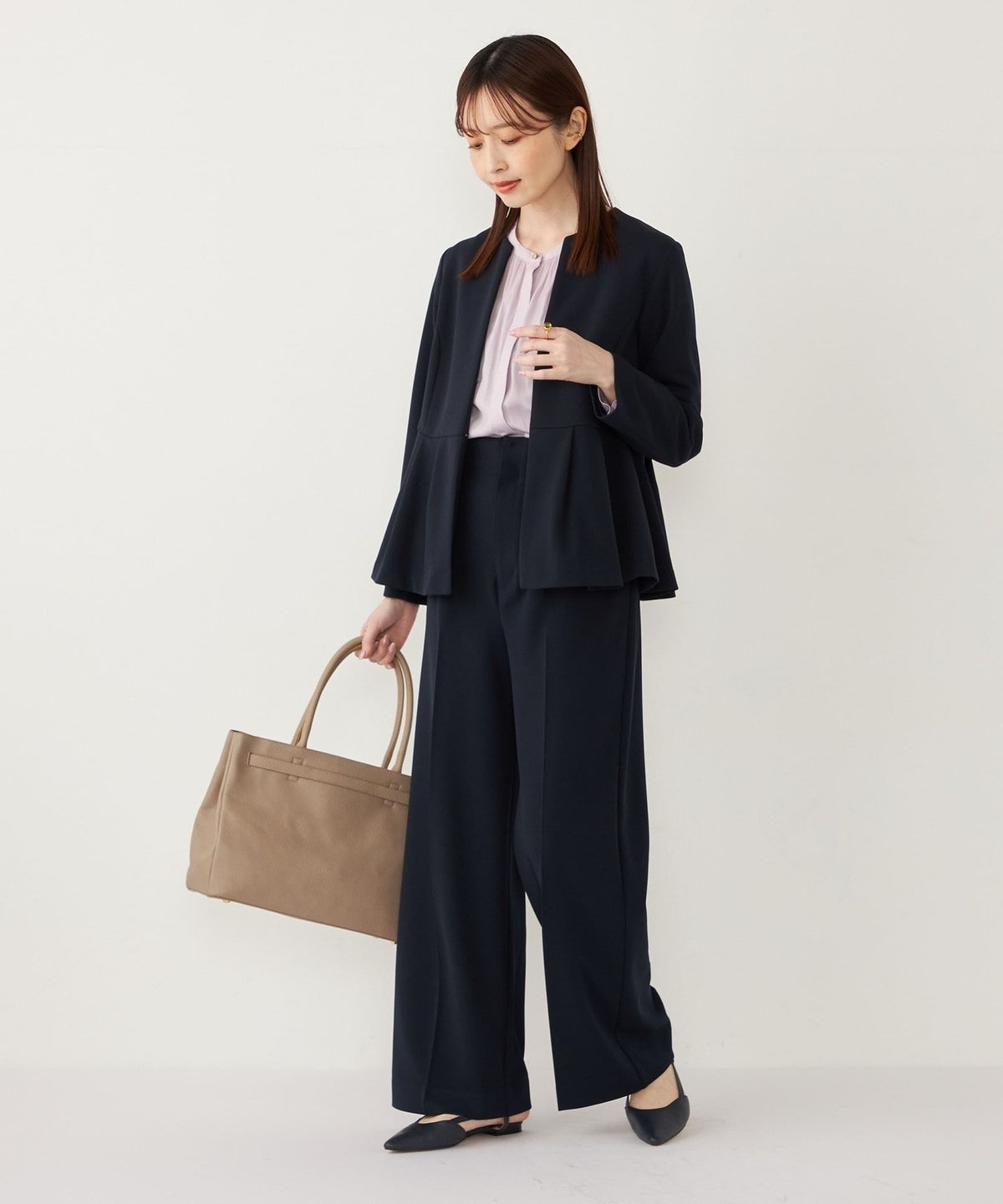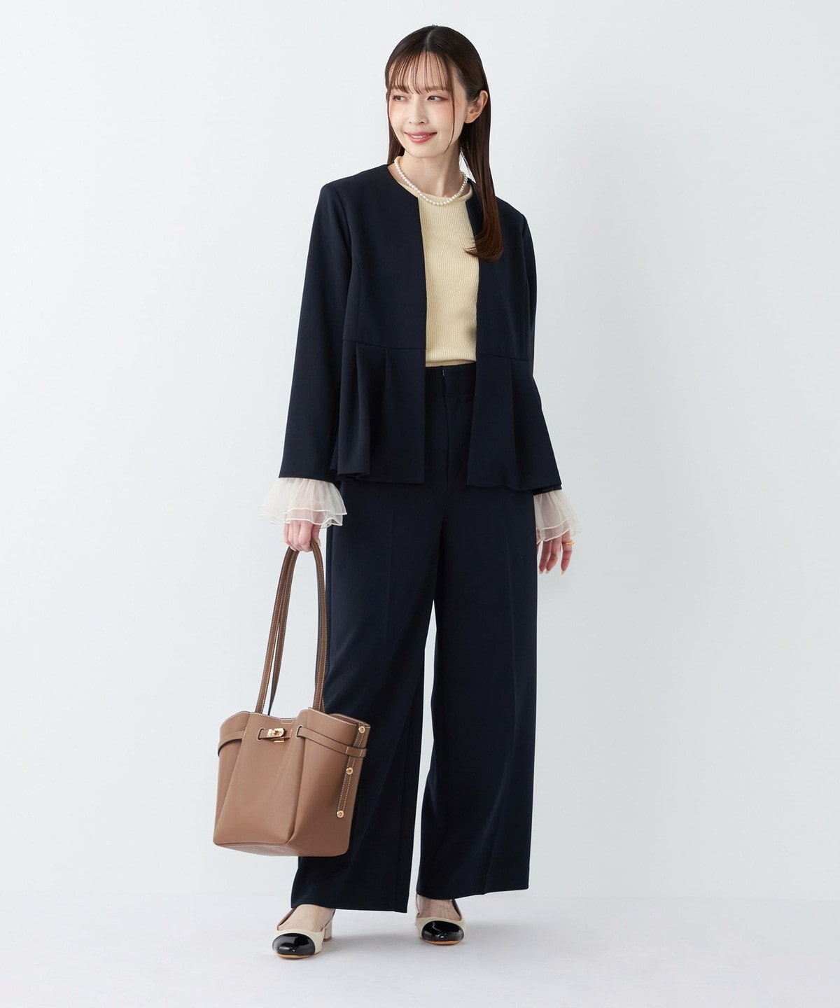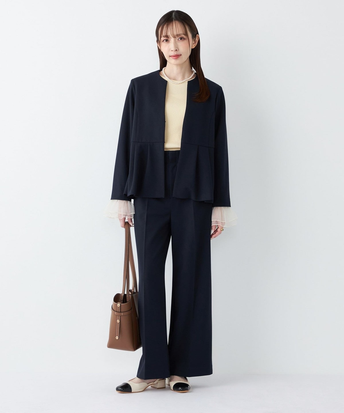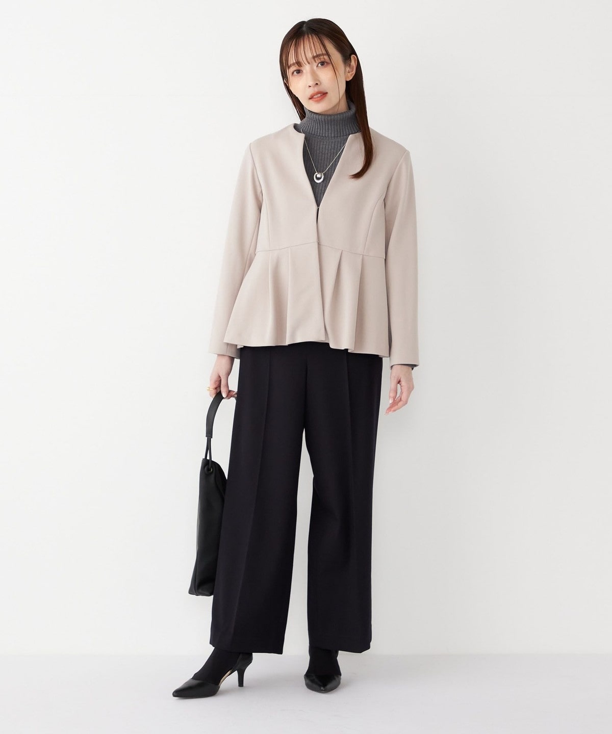高めのウエスト位置から施したペプラムデザインが、スタイルアップ効果や、程よい女性らしさを演出してくれる1枚。