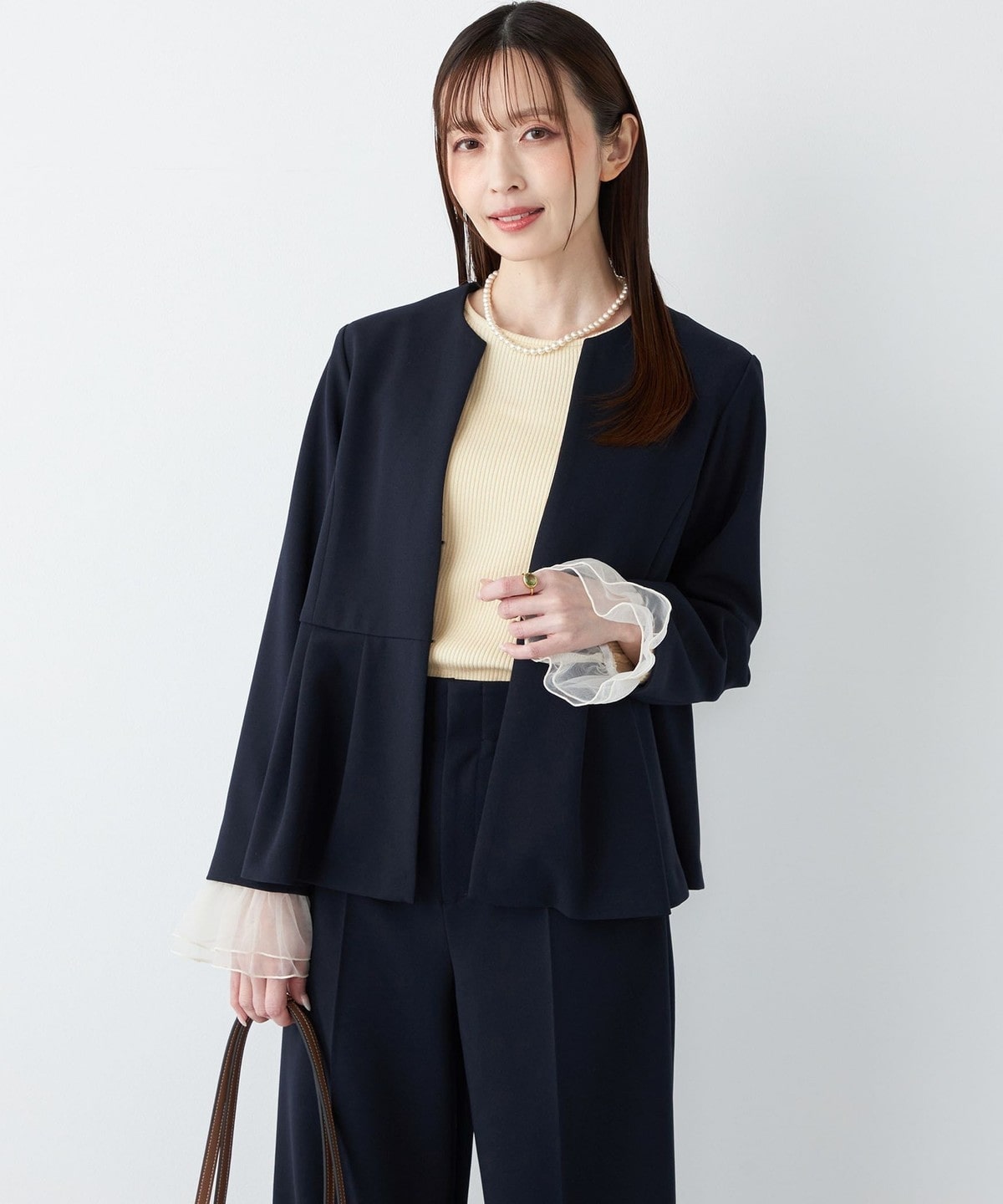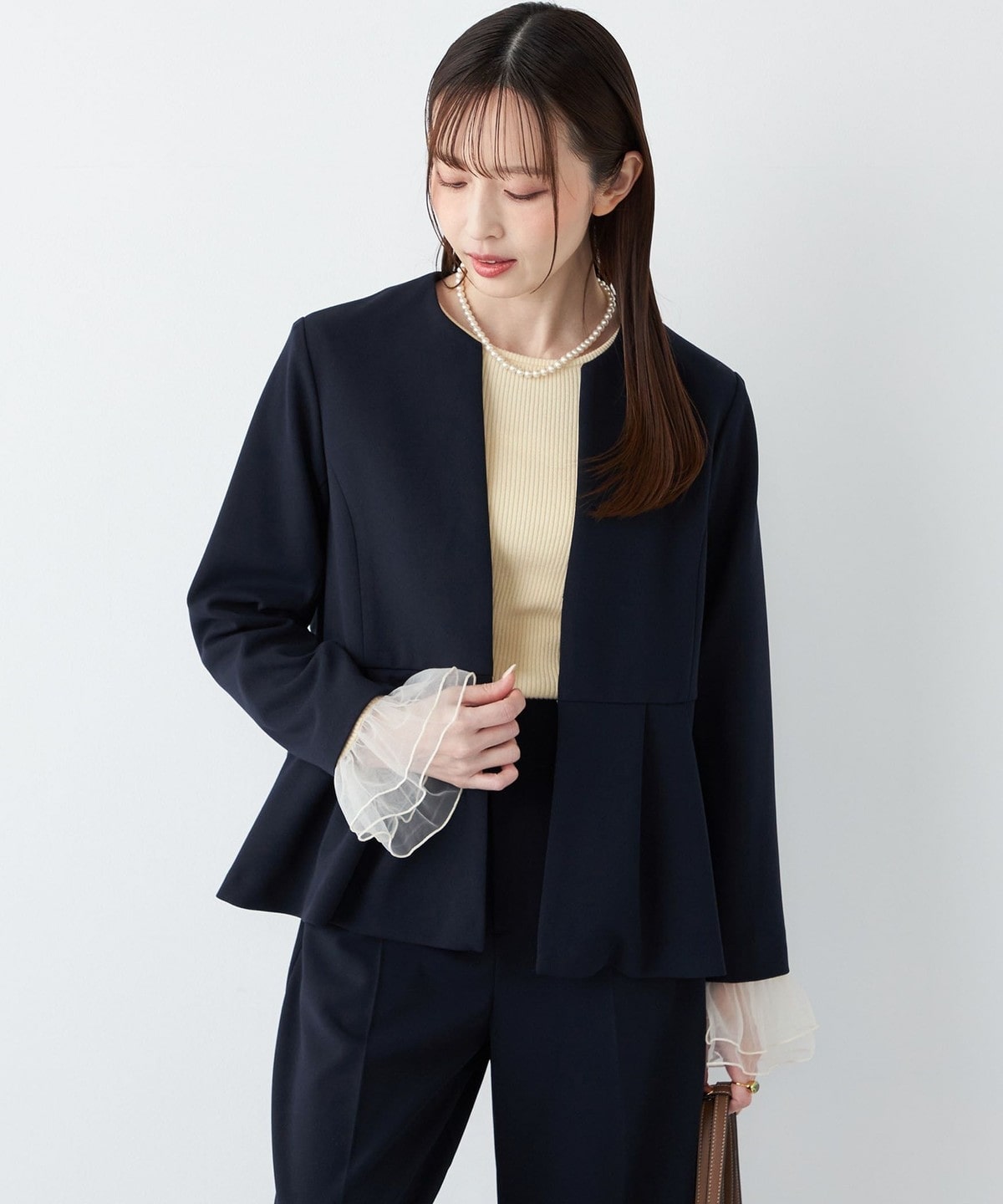 ペプラムデザインがアクセントになった、ジョーゼット素材を使用したジャケット。
