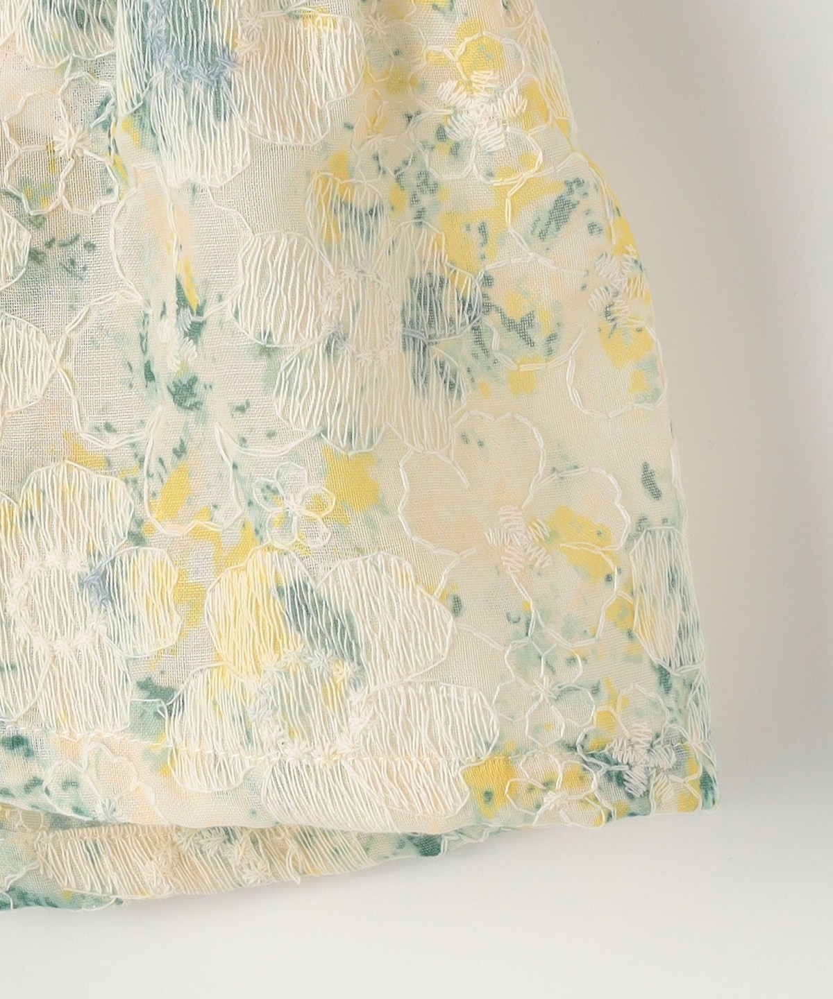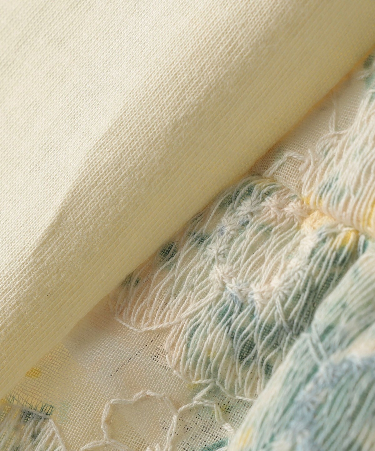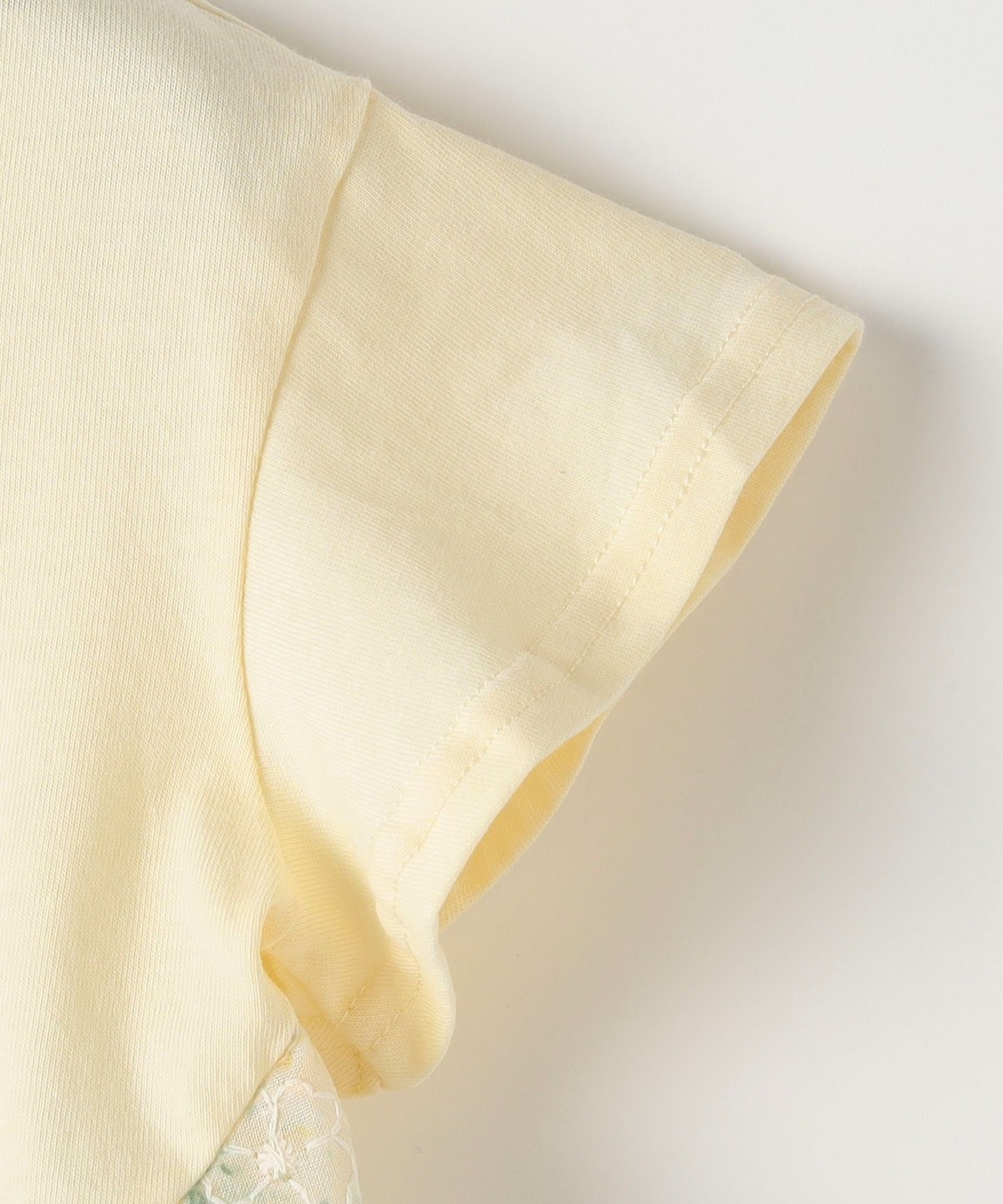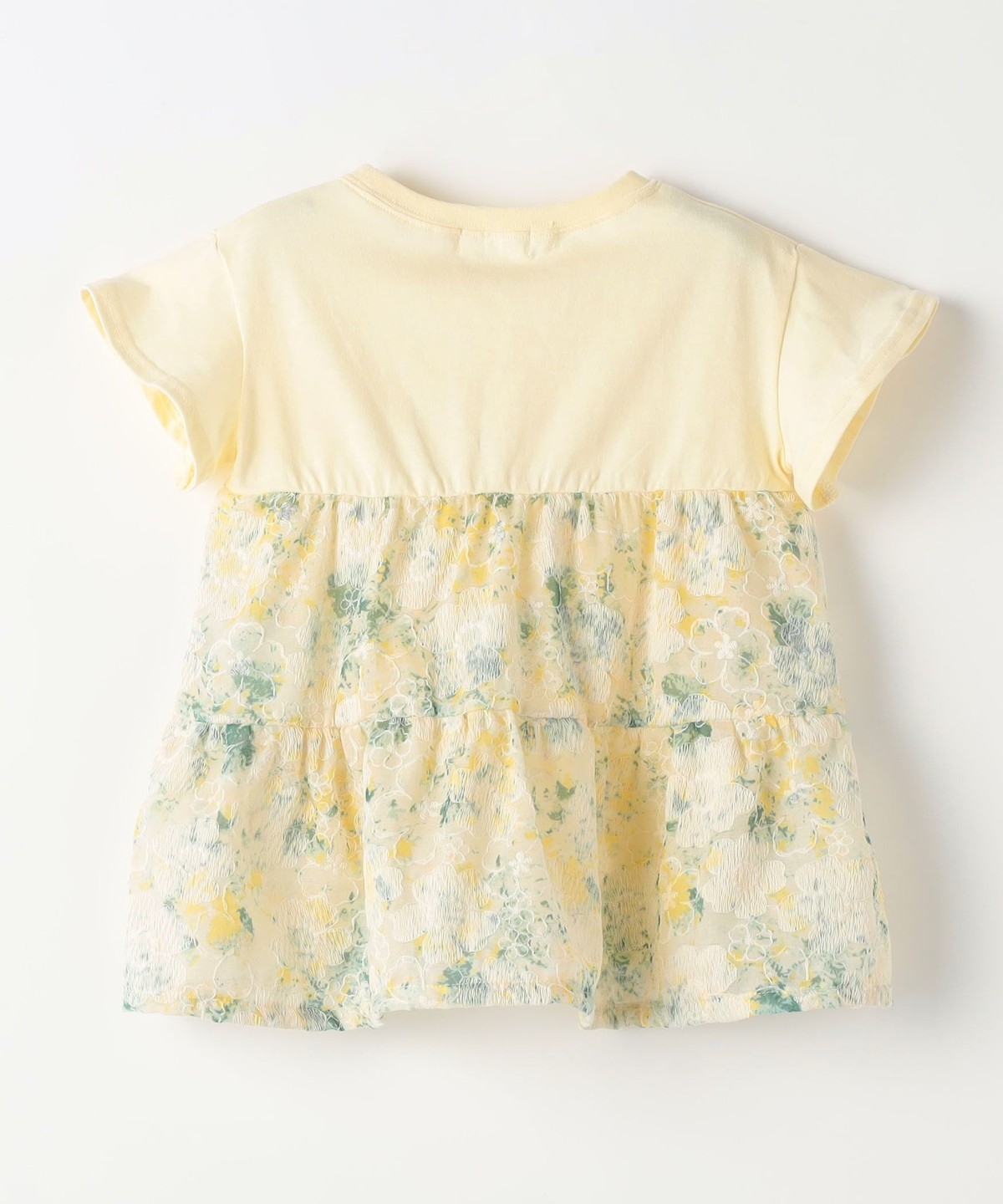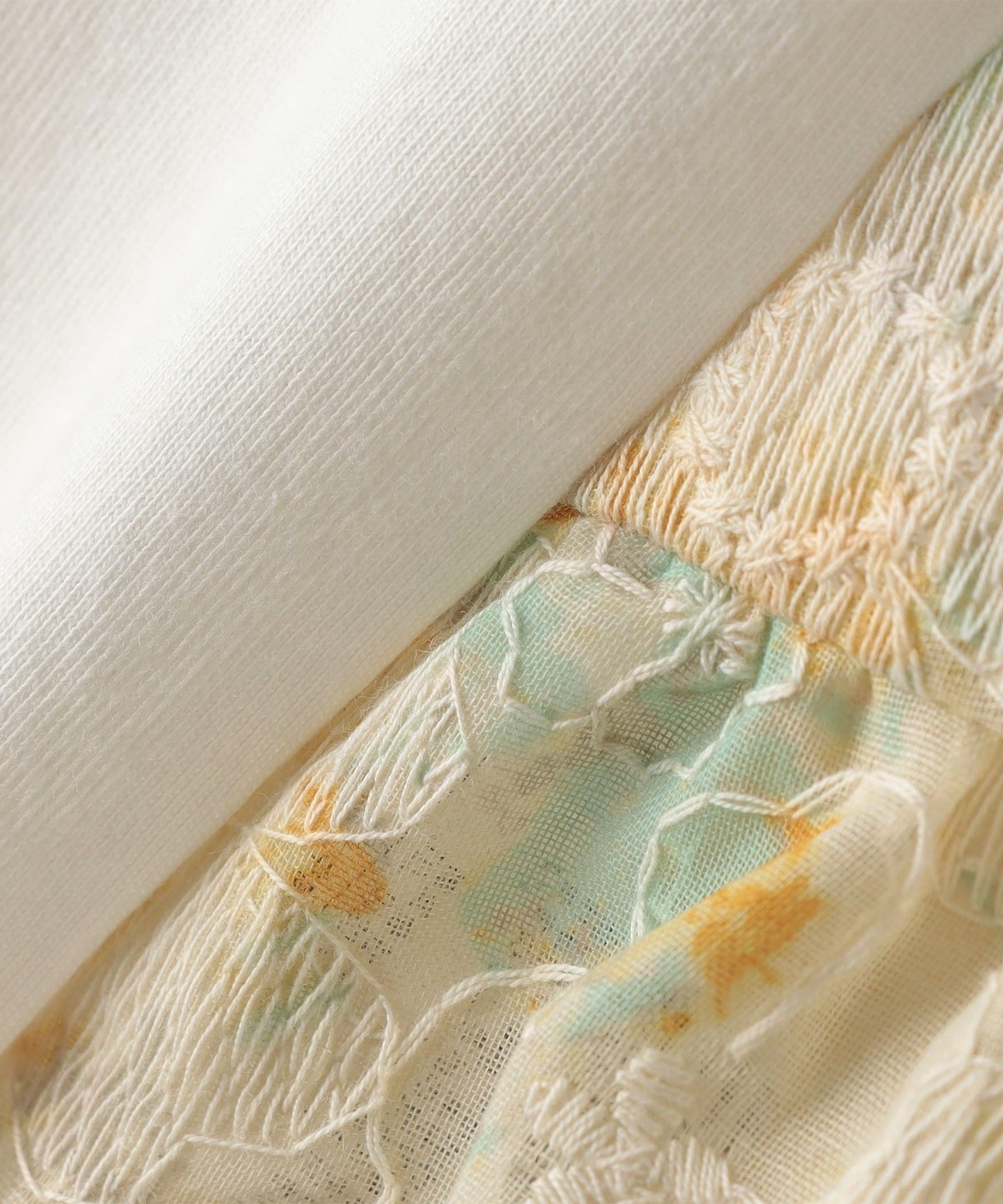 カットソーに花柄刺繍素材をドッキングしたトップス。