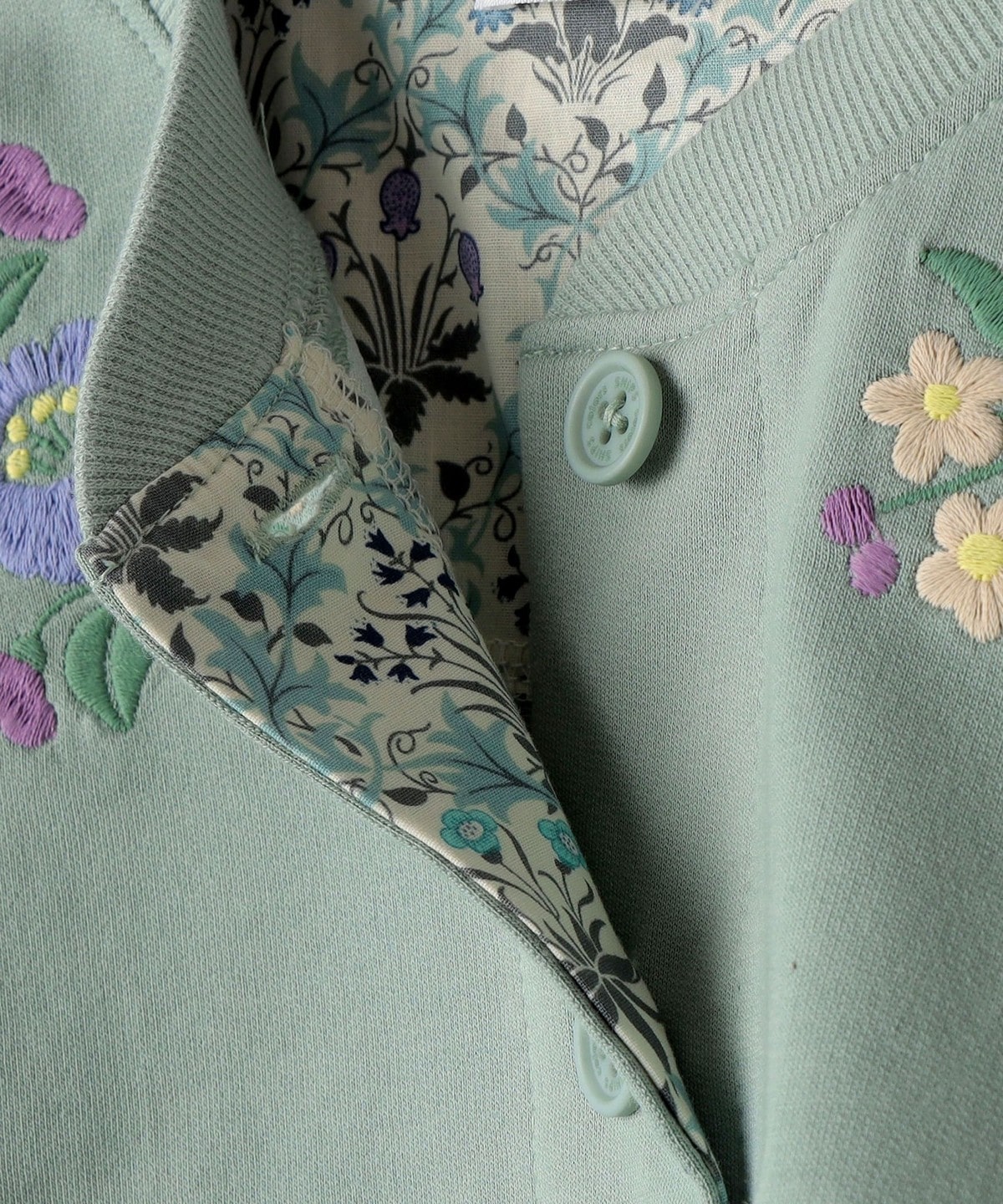 襟元にあしらったフラワー柄刺繍が目をひくカーディガン。