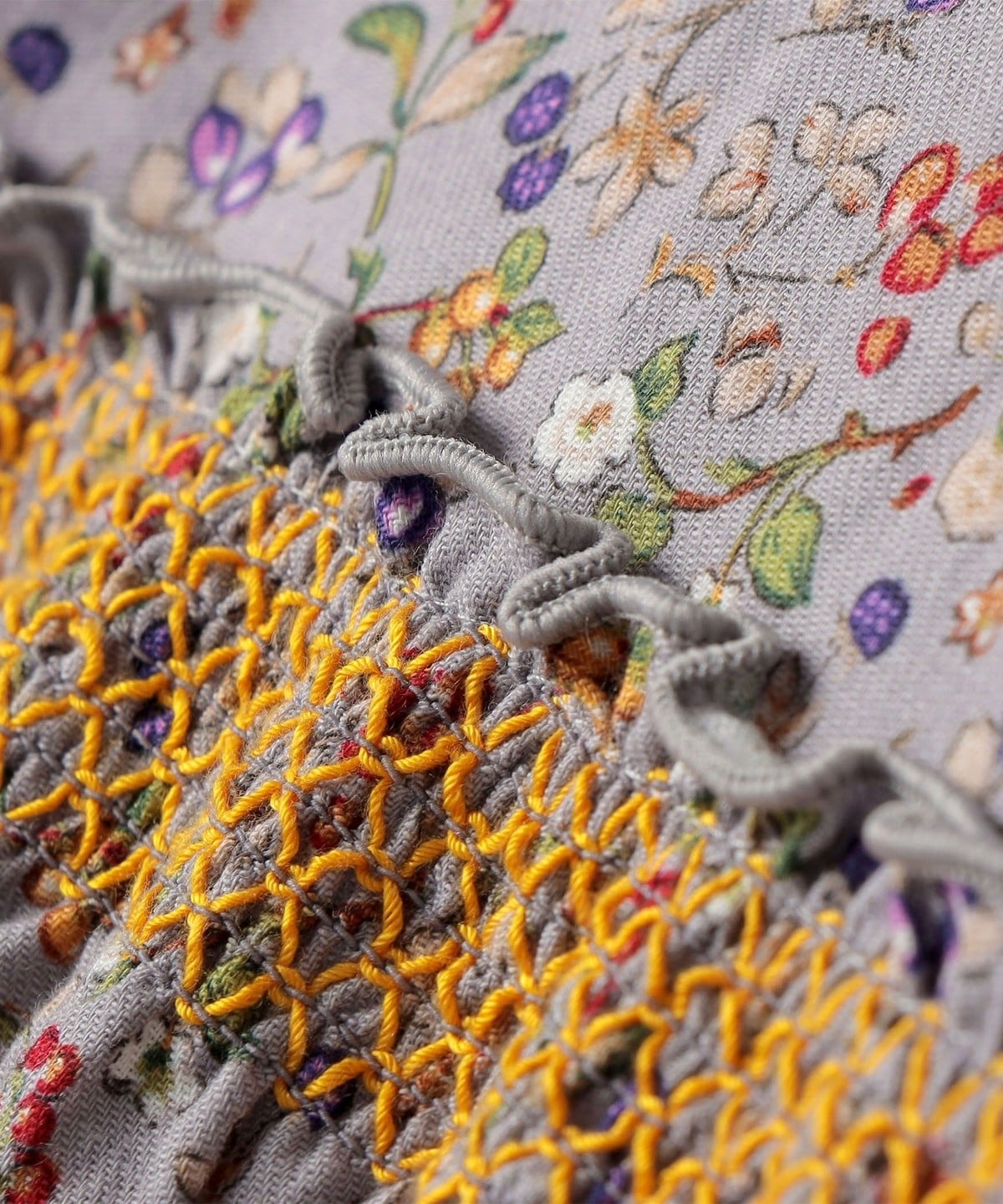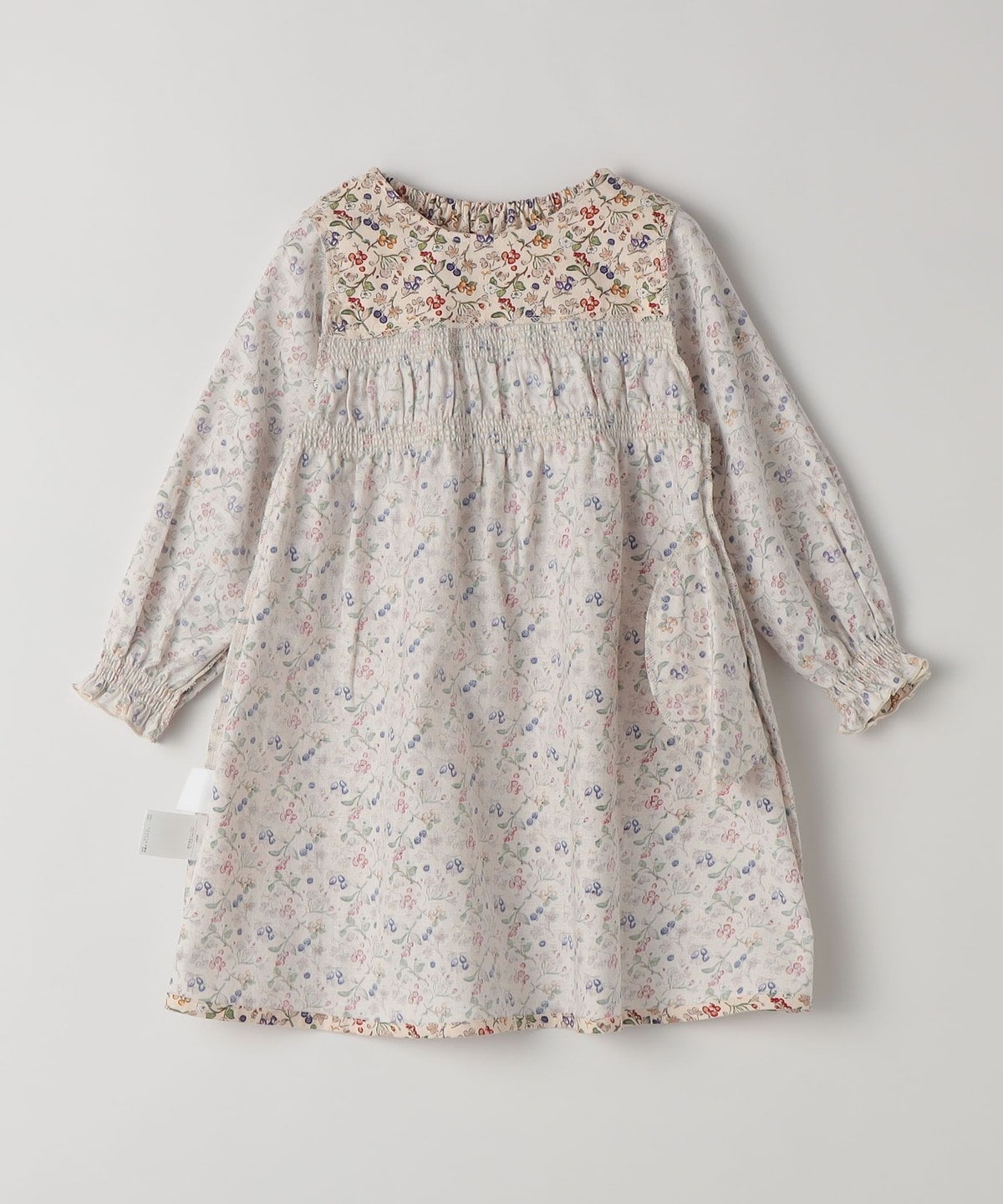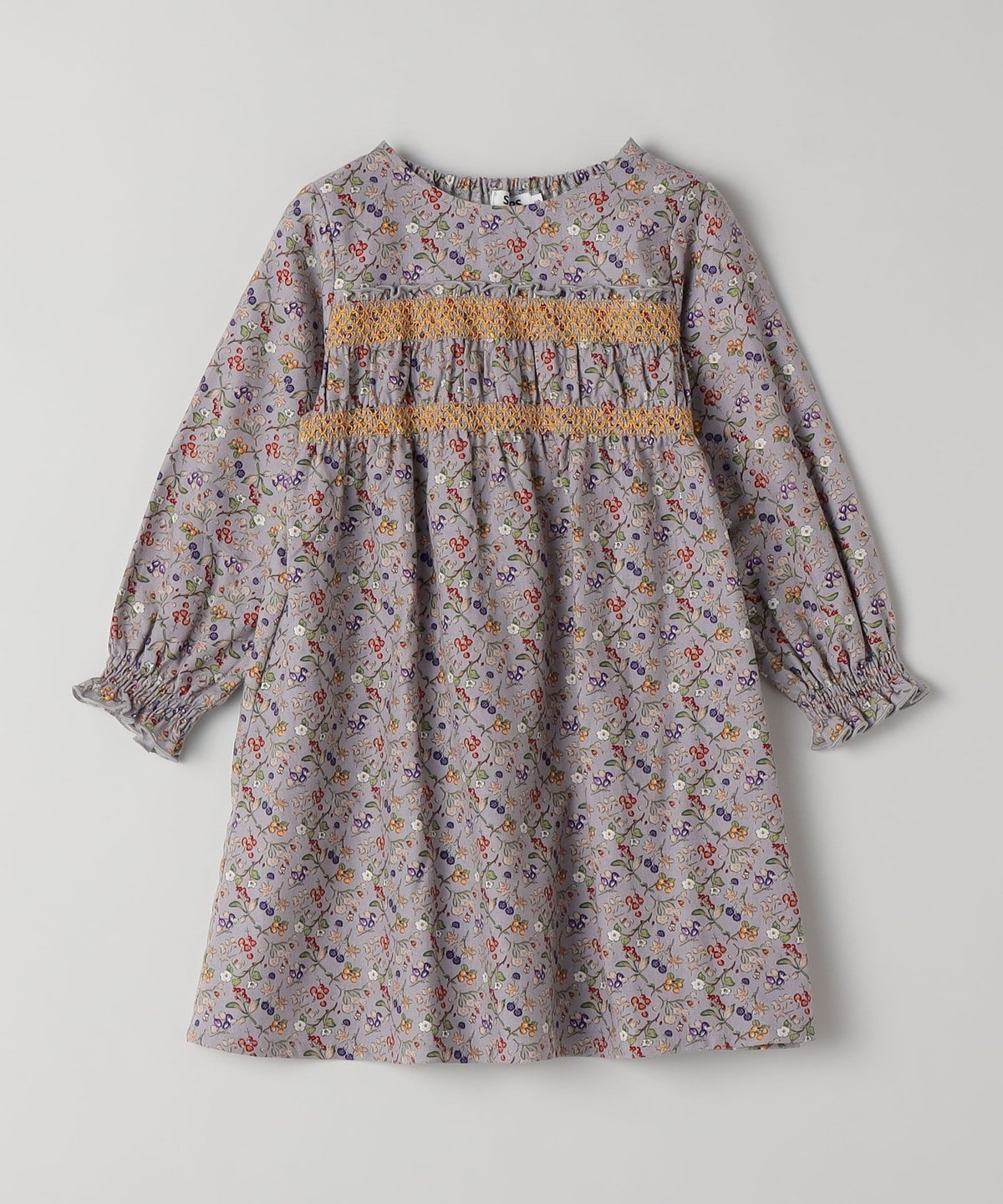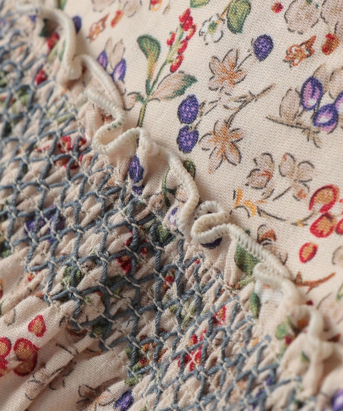 小花柄プリントとスモッキングデザインが、華やかで可愛らしい印象のワンピース。